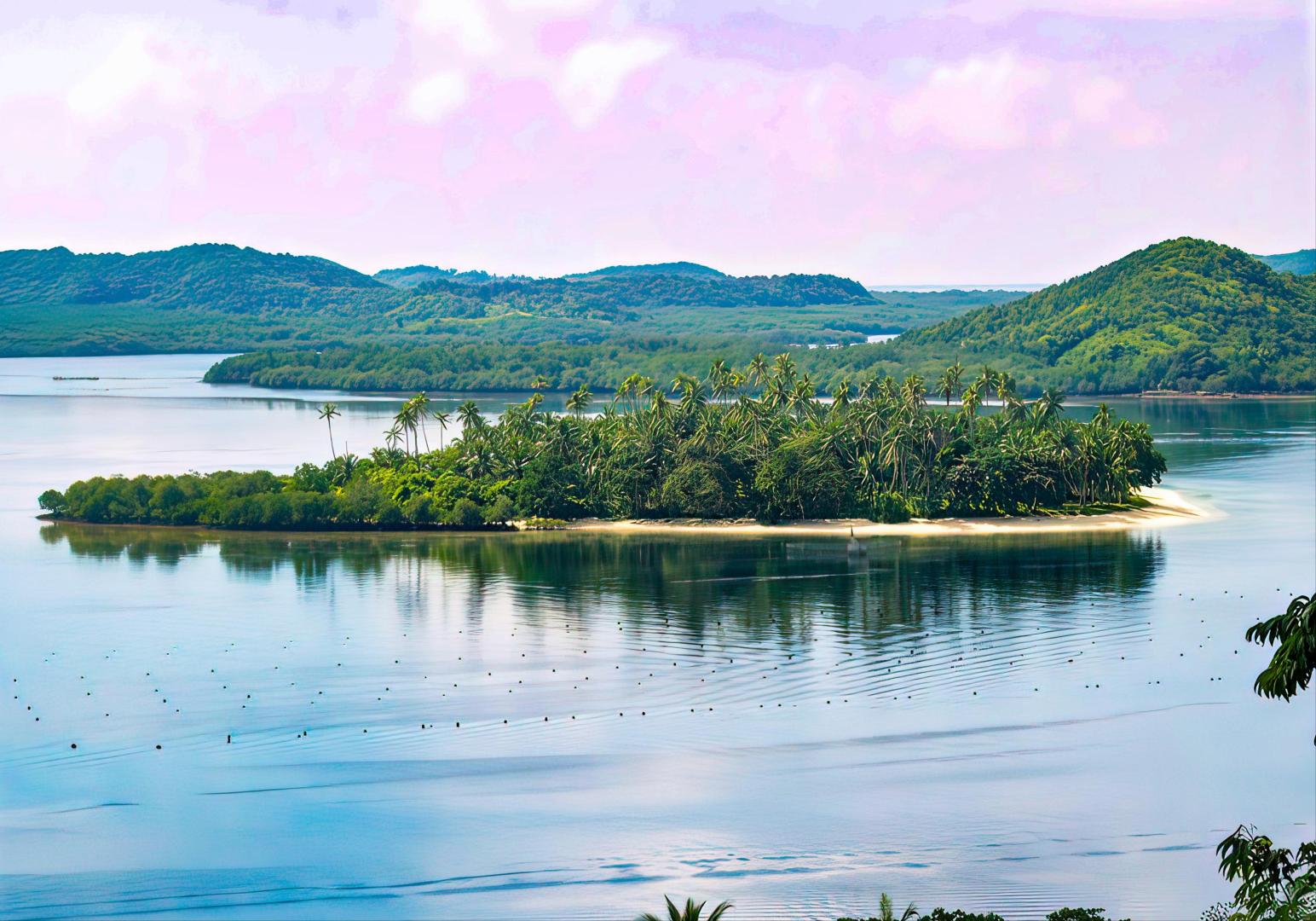 One of the islands is 57.86 acres in size, with flat to mountainous terrain and elevations ranging from 5 to 50 metres above sea level. The island features almost 4 kilometers of powdery white sand beaches. Approximately 70% of the island has white sand with the remaining covered by mangroves and natural rock formations. The island is planted with a few thousand coconut and fruit bearing trees. The reef area is estimated to be 50 hectares ranging in depth from 12 inches to 15 feet; then this area stretches to another 150 hectares circumference around the entire island. There is abundant marine life as evidenced by existing Pearl Farms directly in front of the island.