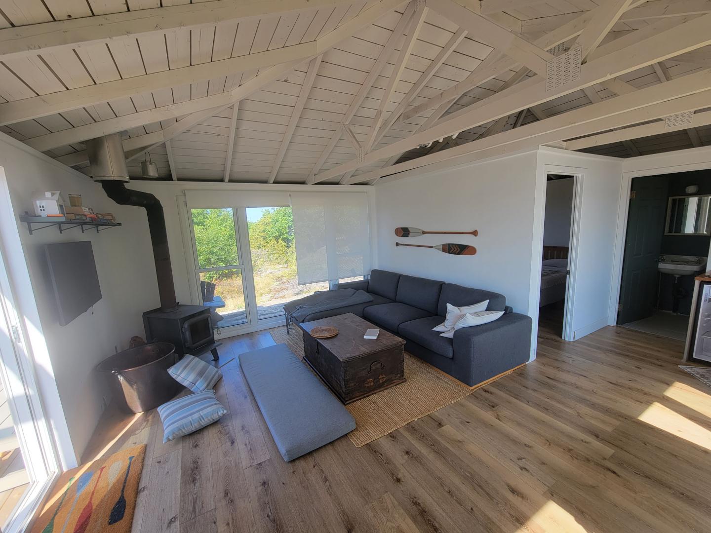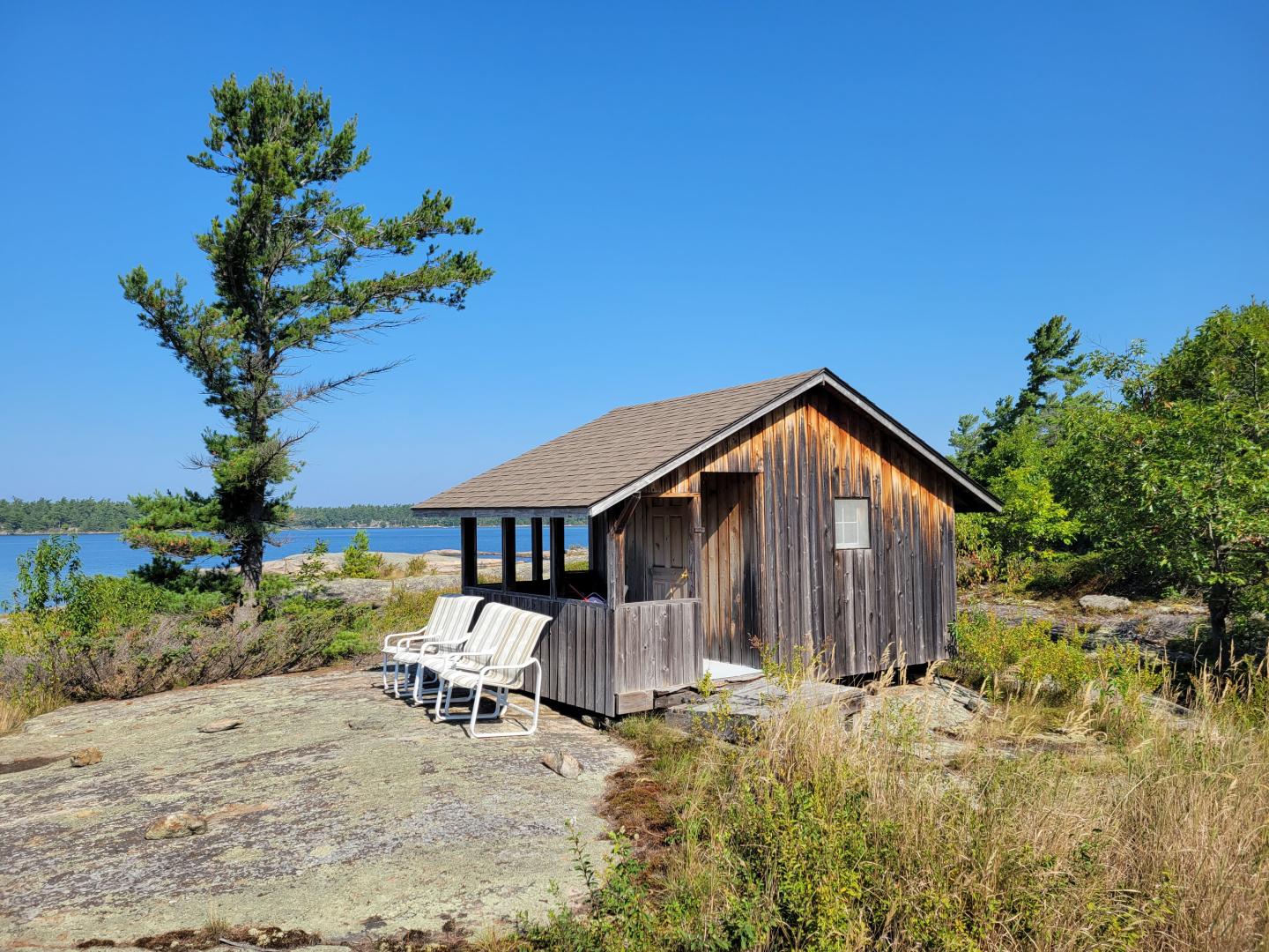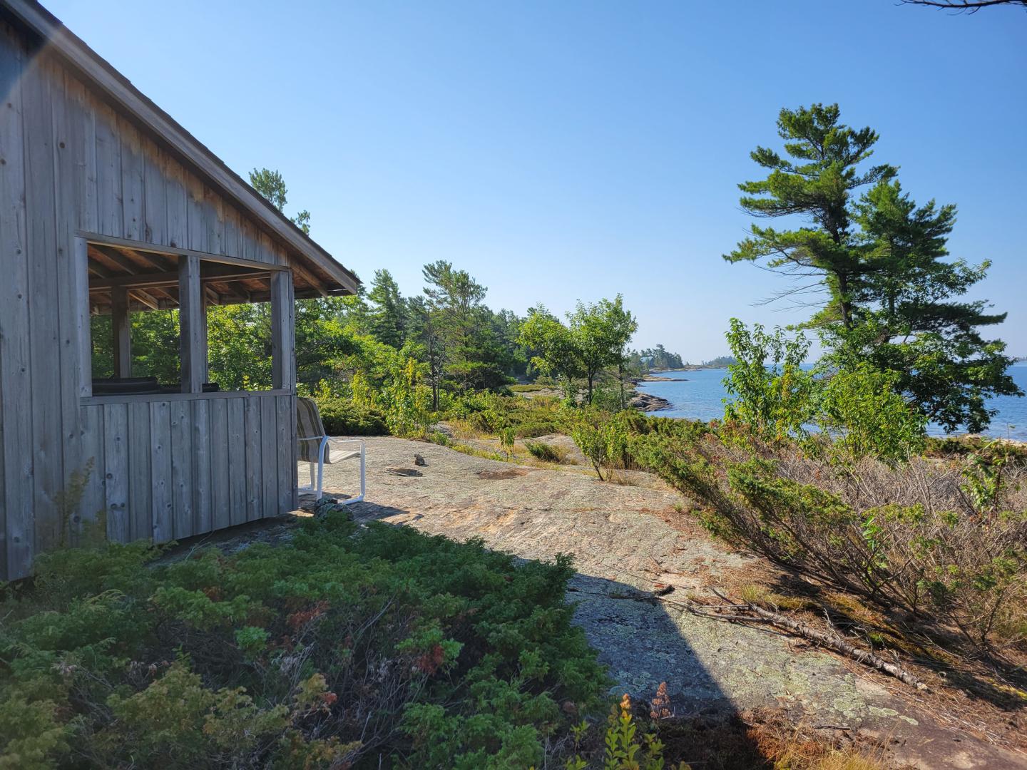 The property already has a self-contained one-bedroom cottage tucked into a pine forest, which features new windows and doors, engineered hardwood floors, and a wood-burning airtight stove—making it easy to take advantage of this prime location now. An additional one-bedroom sleeping bunkie with screened porch sits at the water’s edge. Established hydro and septic system, groomed trails and landscaped pathways, and an elevated building site set the stage for the development of a main cottage in the future, maximizing the investment even further. It’s a serene spot to launch a canoe, cast a line, or simply bask in the sun and bay breezes.
