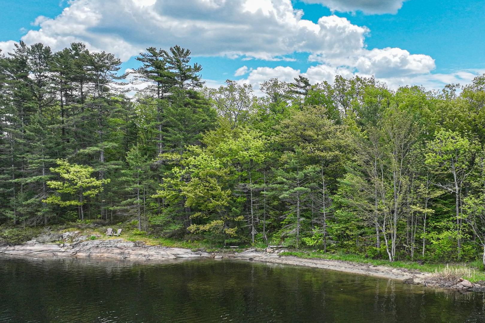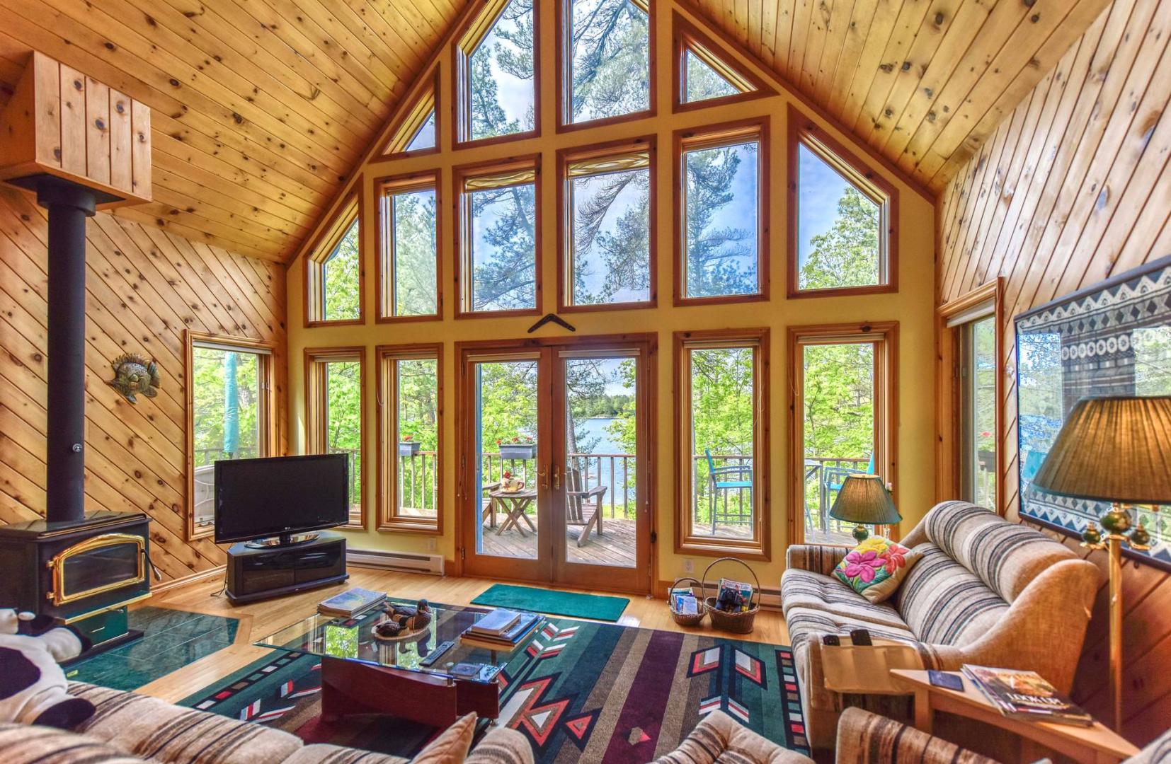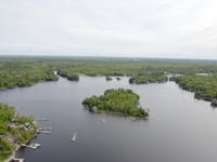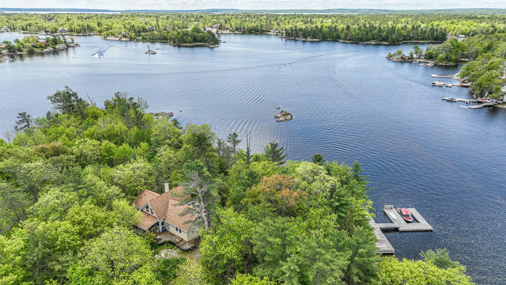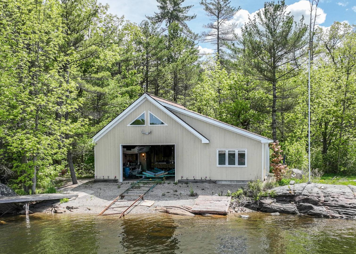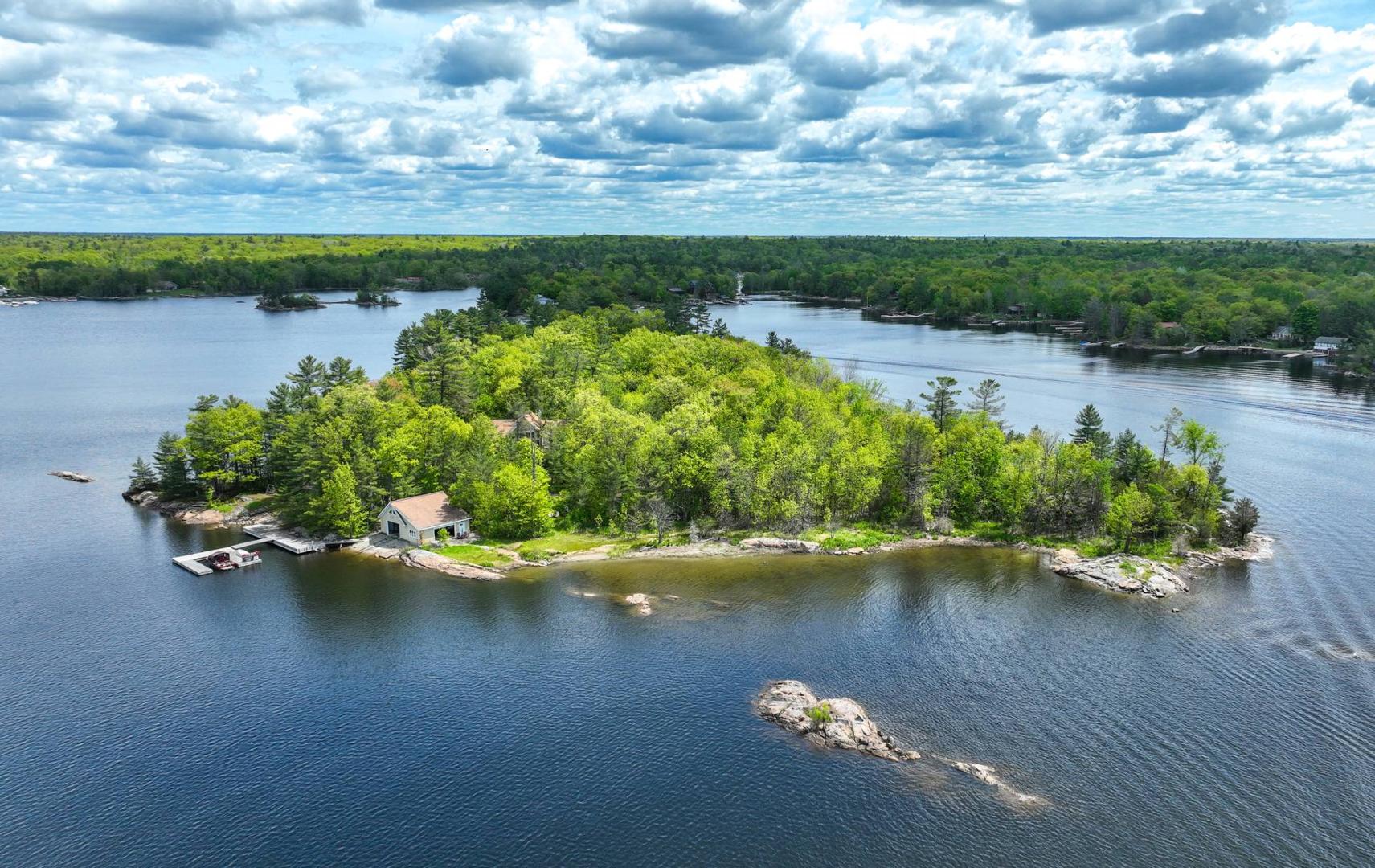 South Bay’s calm, clear waters surround “Cow Island” (2 Island 880), a soothing companion to its 6.2 acres cloaked in evergreen and hardwood forest. Nestled within the trees, a three-bedroom cottage delivers views over the island’s western shoreline and deep-water harbor. The sleeping quarters comfortably accommodate eight in a master suite on the south side, a two-bedroom guest wing to the north, and a second-floor loft. Light floods the open central floorplan courtesy of a glass-walled great room, with a roof soaring 1.5 stories. Curvilinear decking wraps the front and back facades, accentuating the bond between living space and nature. Built for year-round use, it’s a perfect perch for barbecuing, sunning, and watching the seasons change. The property also includes a large, dry boathouse/workshop that connects to a U-shaped dock and several outbuildings. With Township approval, one or two additional guest cabins are a likely possibility due to the island’s size.
