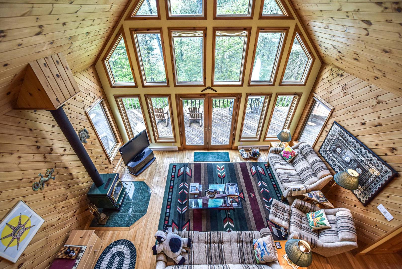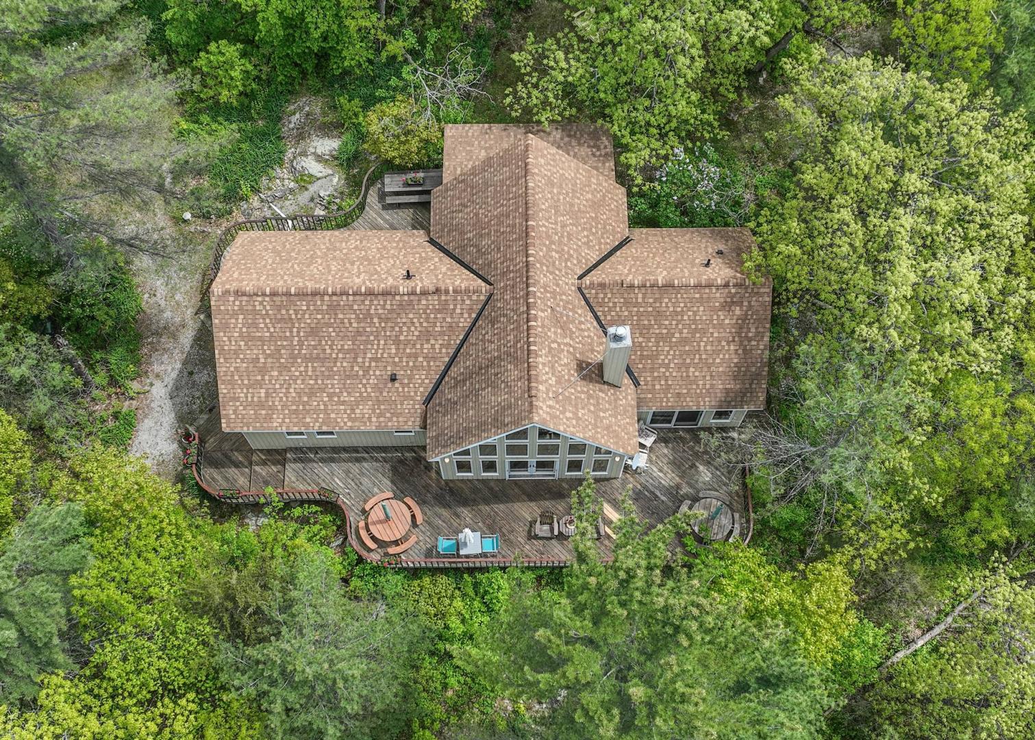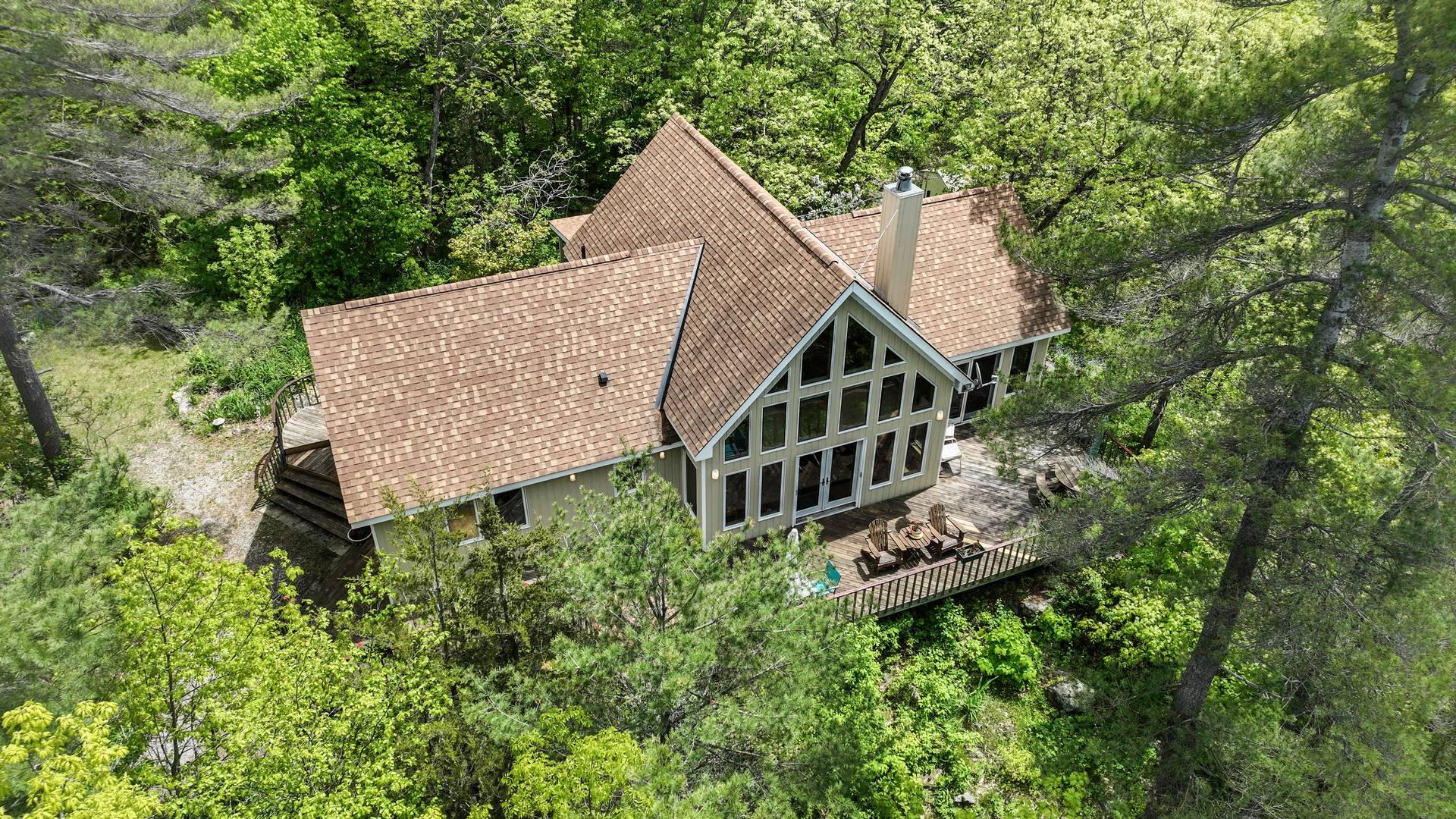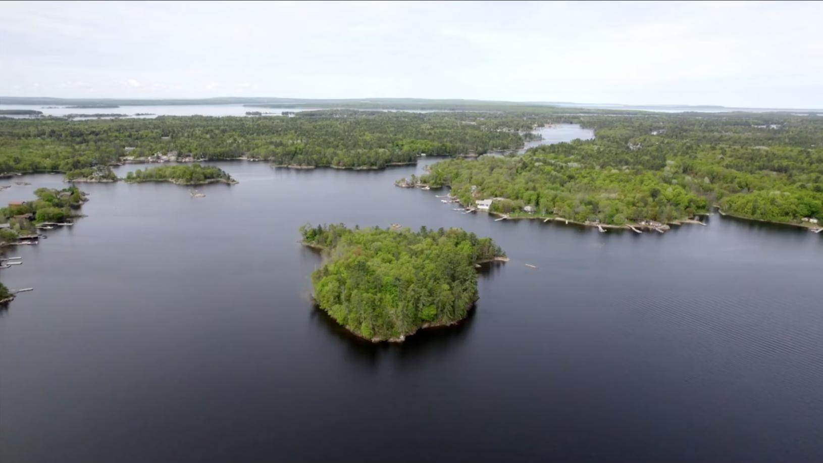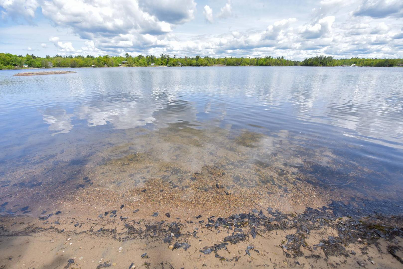 South Bay’s calm, clear waters surround “Cow Island” (2 Island 880), a soothing companion to its 6.2 acres cloaked in evergreen and hardwood forest. Nestled within the trees, a three-bedroom cottage delivers views over the island’s western shoreline and deep-water harbor. The sleeping quarters comfortably accommodate eight in a master suite on the south side, a two-bedroom guest wing to the north, and a second-floor loft. Light floods the open central floorplan courtesy of a glass-walled great room, with a roof soaring 1.5 stories. Curvilinear decking wraps the front and back facades, accentuating the bond between living space and nature. Built for year-round use, it’s a perfect perch for barbecuing, sunning, and watching the seasons change. The property also includes a large, dry boathouse/workshop that connects to a U-shaped dock and several outbuildings. With Township approval, one or two additional guest cabins are a likely possibility due to the island’s size.
