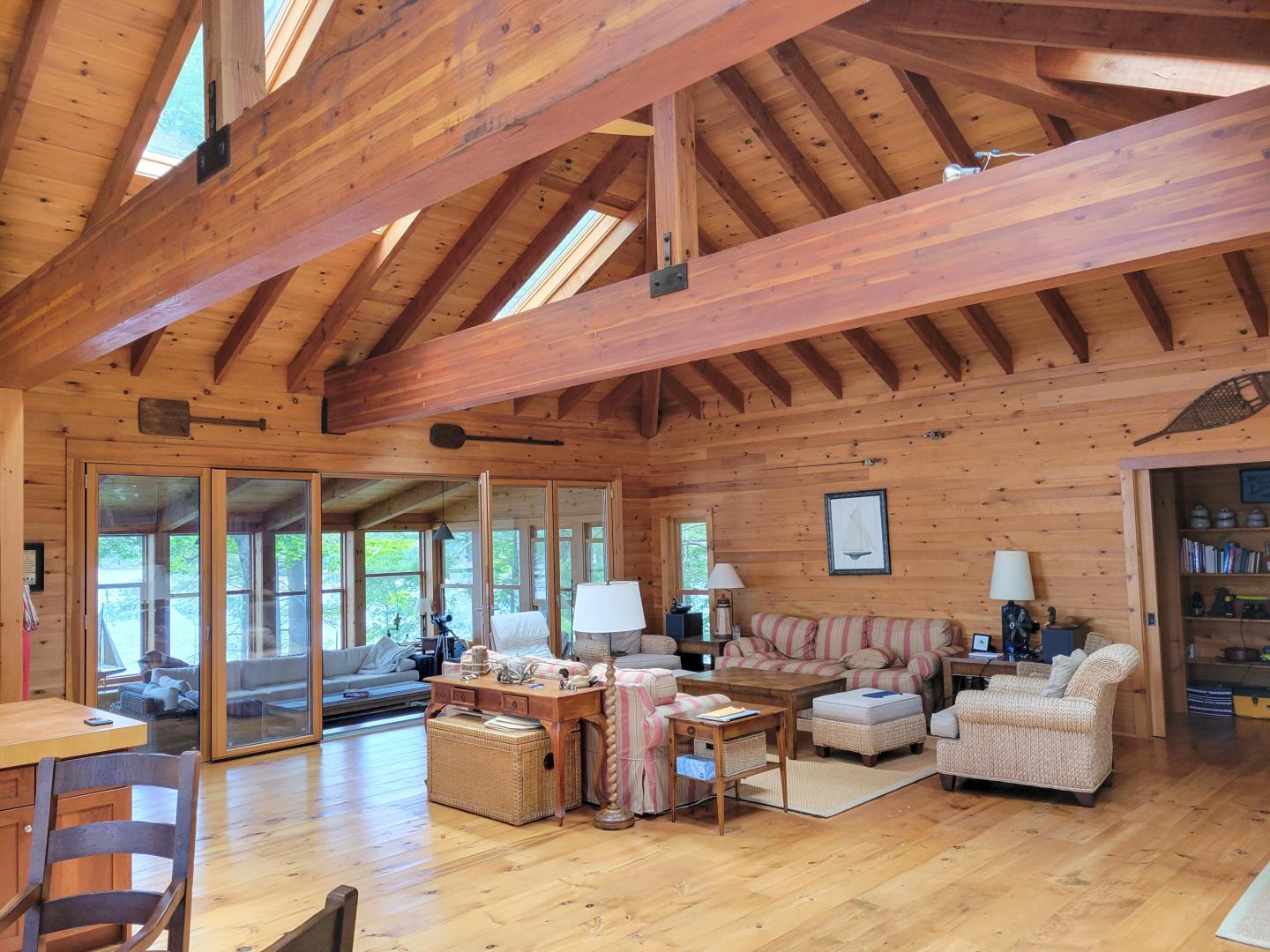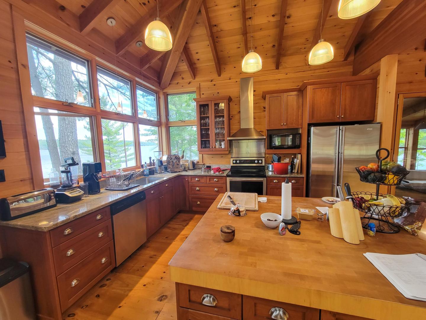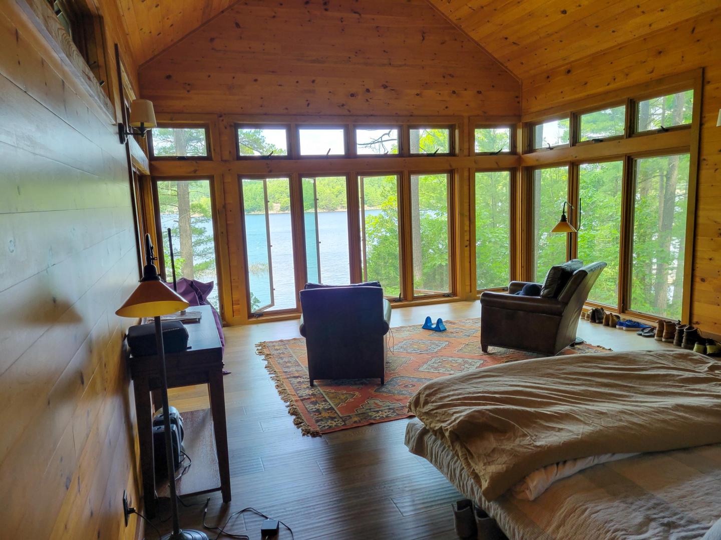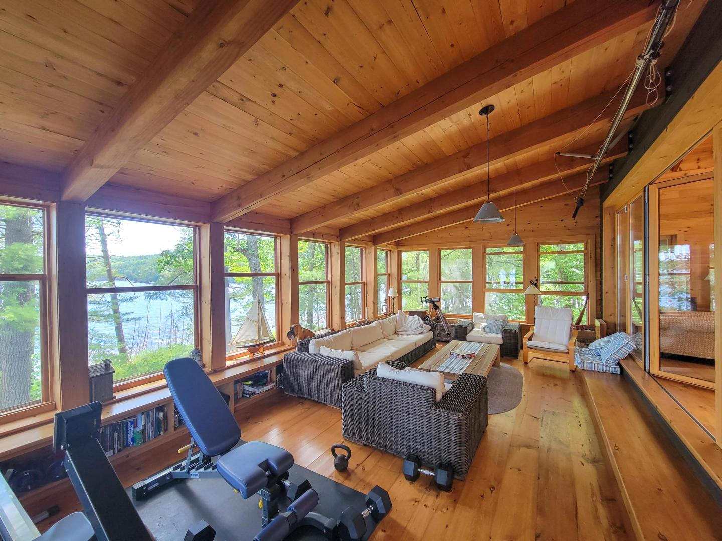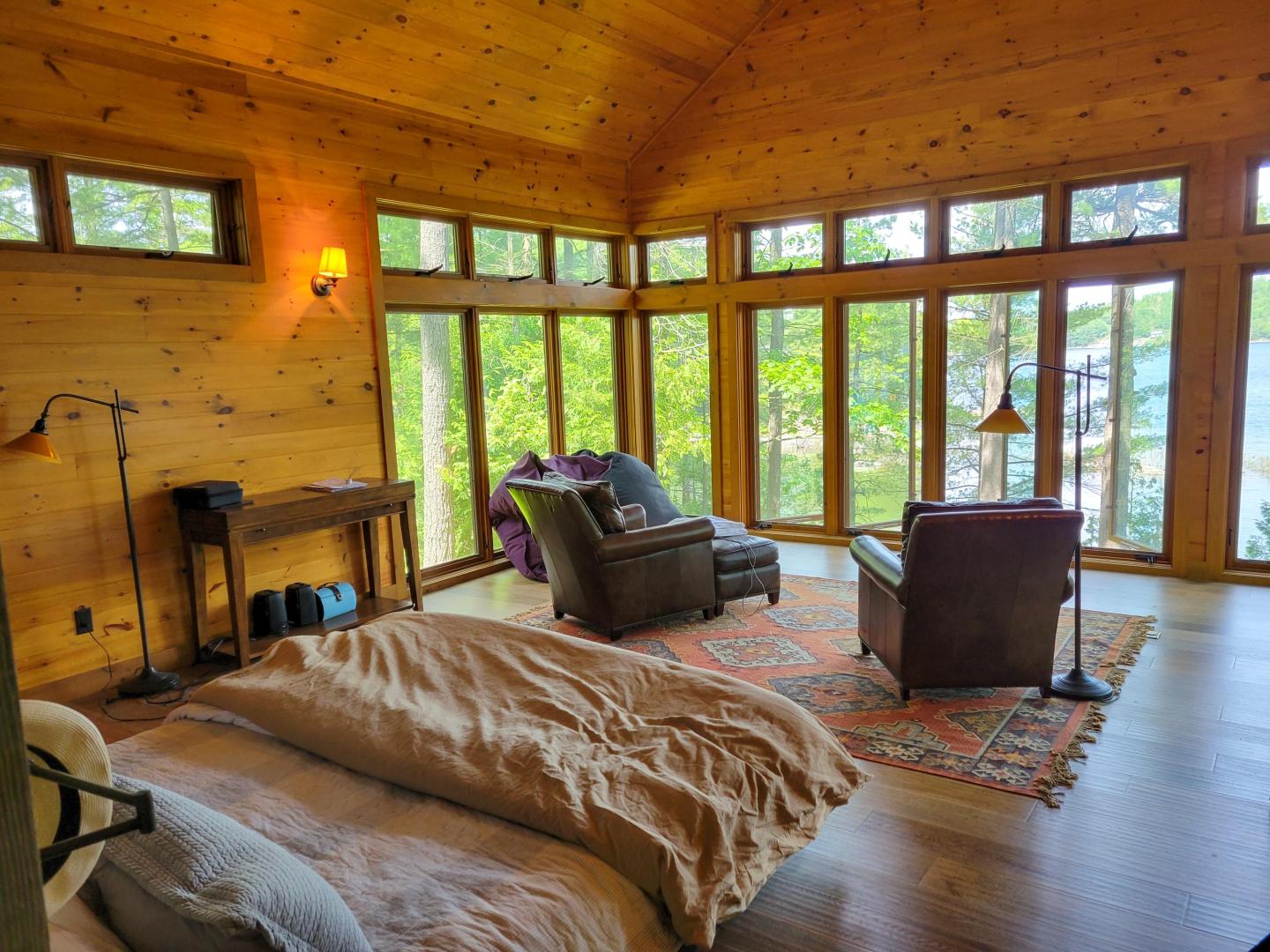 Designed by Toronto architect John Carley and built by Rose Point Construction, the main one-bedroom lodge features an inviting open-plan great room with windows on three sides overlooking the water. The warm wood-plank walls and flooring take on added glow from skylights in the vaulted ceiling. A sunroom, which can be separated from the great room by sliding glass panels, serves as family room, lounge, and workout area. The state-of-the-art kitchen features top-end appliances, generous storage, granite countertops, and a butcher block island. A walk out from the kitchen leads to an outdoor deck with brick pizza oven and barbeque. Marshall Black Carpentry designed the master cottage with a large bedroom lined with floor-to-ceiling windows, an office, and a 3-piece ensuite with walk-in and outdoor showers. The sleeping cabin is original to the property and has been renovated to create two separate bedroom suites, each with a three-piece bath.