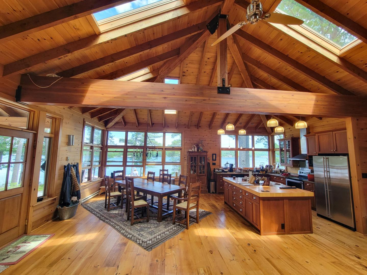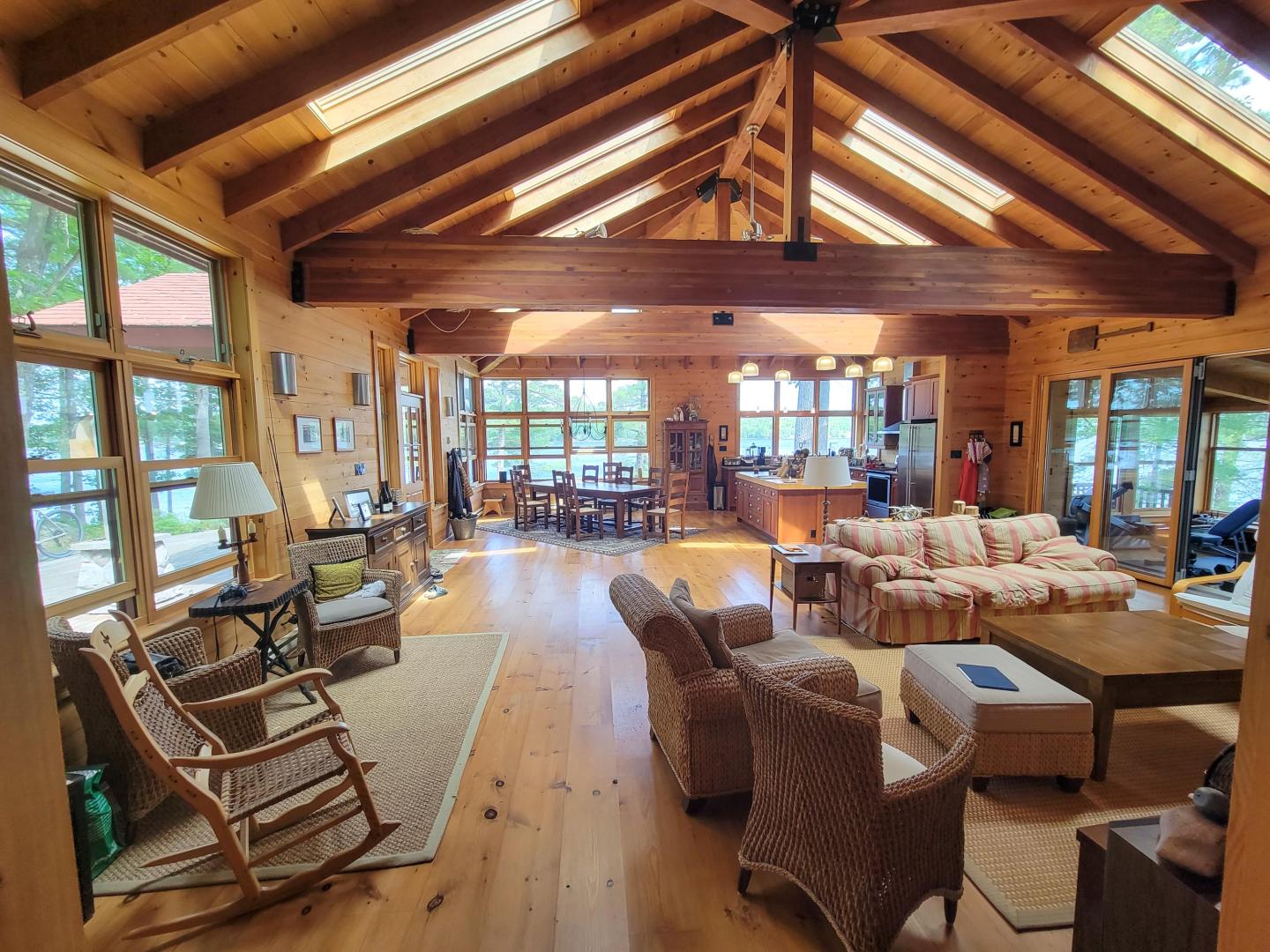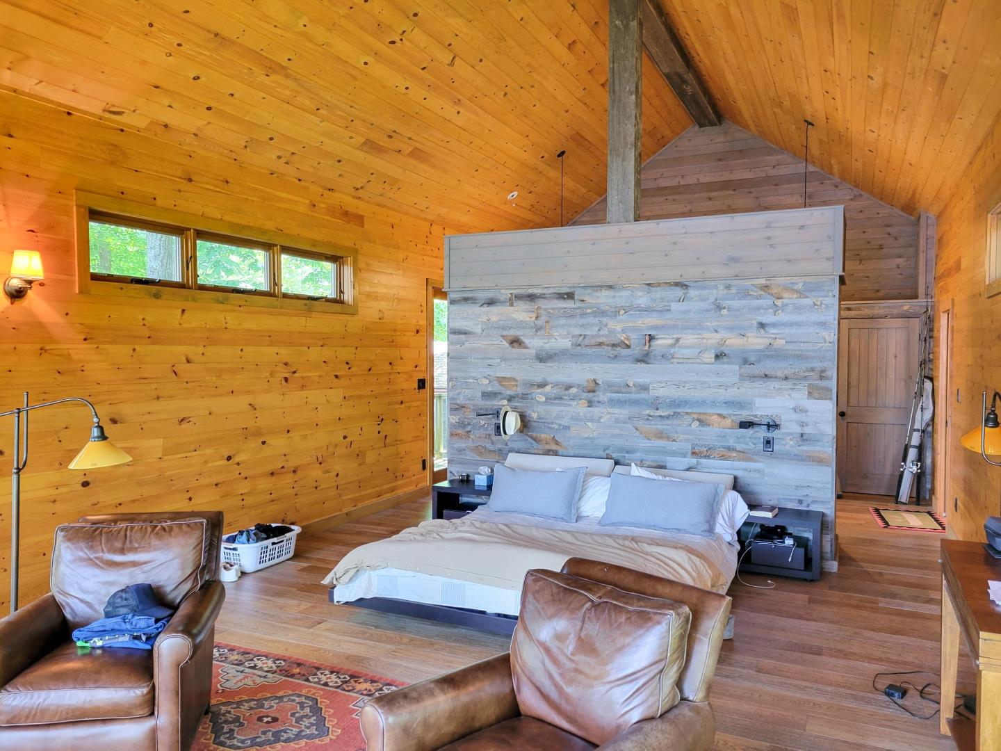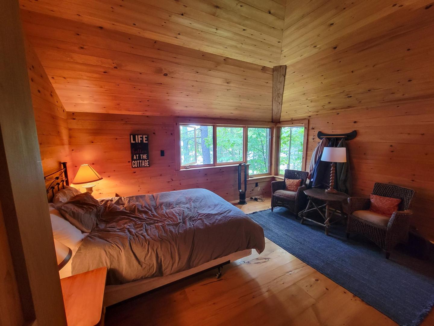 Designed by Toronto architect John Carley and built by Rose Point Construction, the main one-bedroom lodge features an inviting open-plan great room with windows on three sides overlooking the water. The warm wood-plank walls and flooring take on added glow from skylights in the vaulted ceiling. A sunroom, which can be separated from the great room by sliding glass panels, serves as family room, lounge, and workout area. The state-of-the-art kitchen features top-end appliances, generous storage, granite countertops, and a butcher block island. A walk out from the kitchen leads to an outdoor deck with brick pizza oven and barbeque. Marshall Black Carpentry designed the master cottage with a large bedroom lined with floor-to-ceiling windows, an office, and a 3-piece ensuite with walk-in and outdoor showers. The sleeping cabin is original to the property and has been renovated to create two separate bedroom suites, each with a three-piece bath.