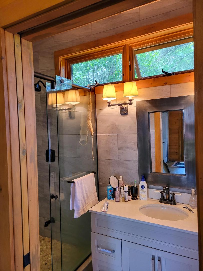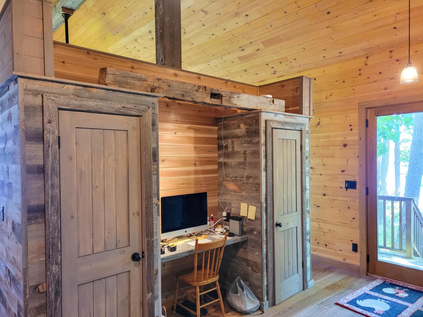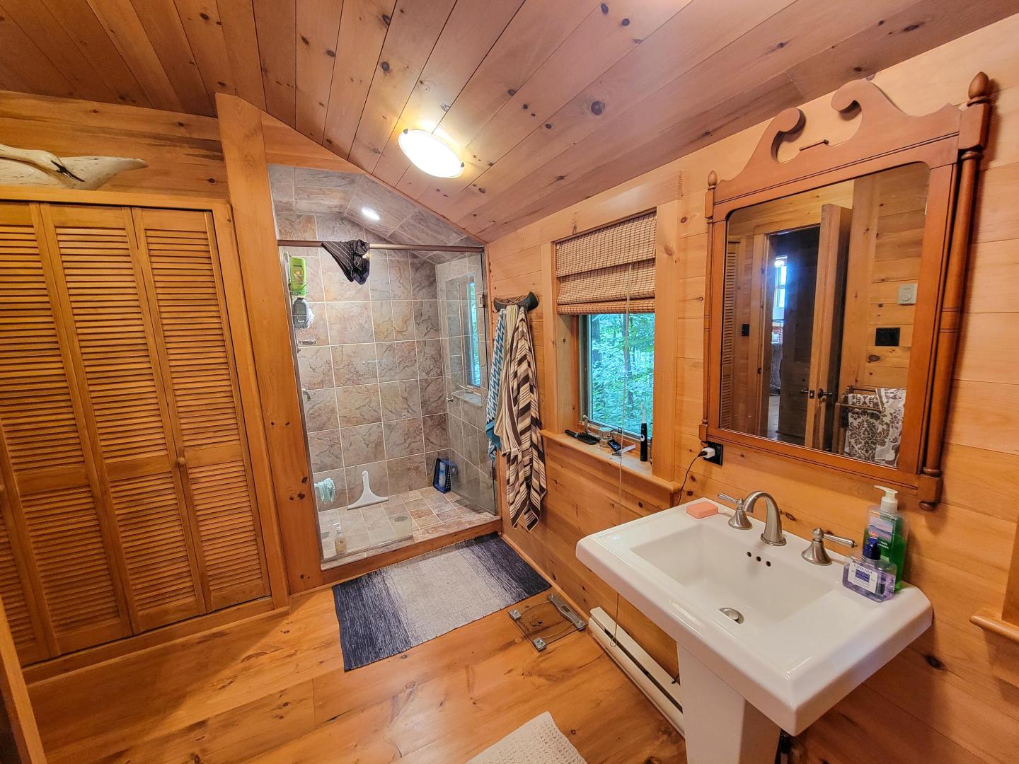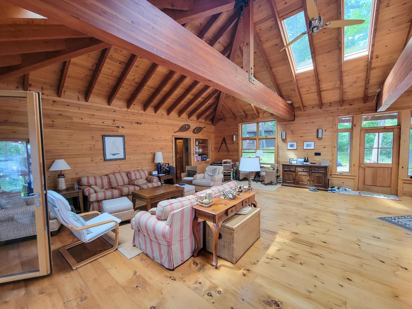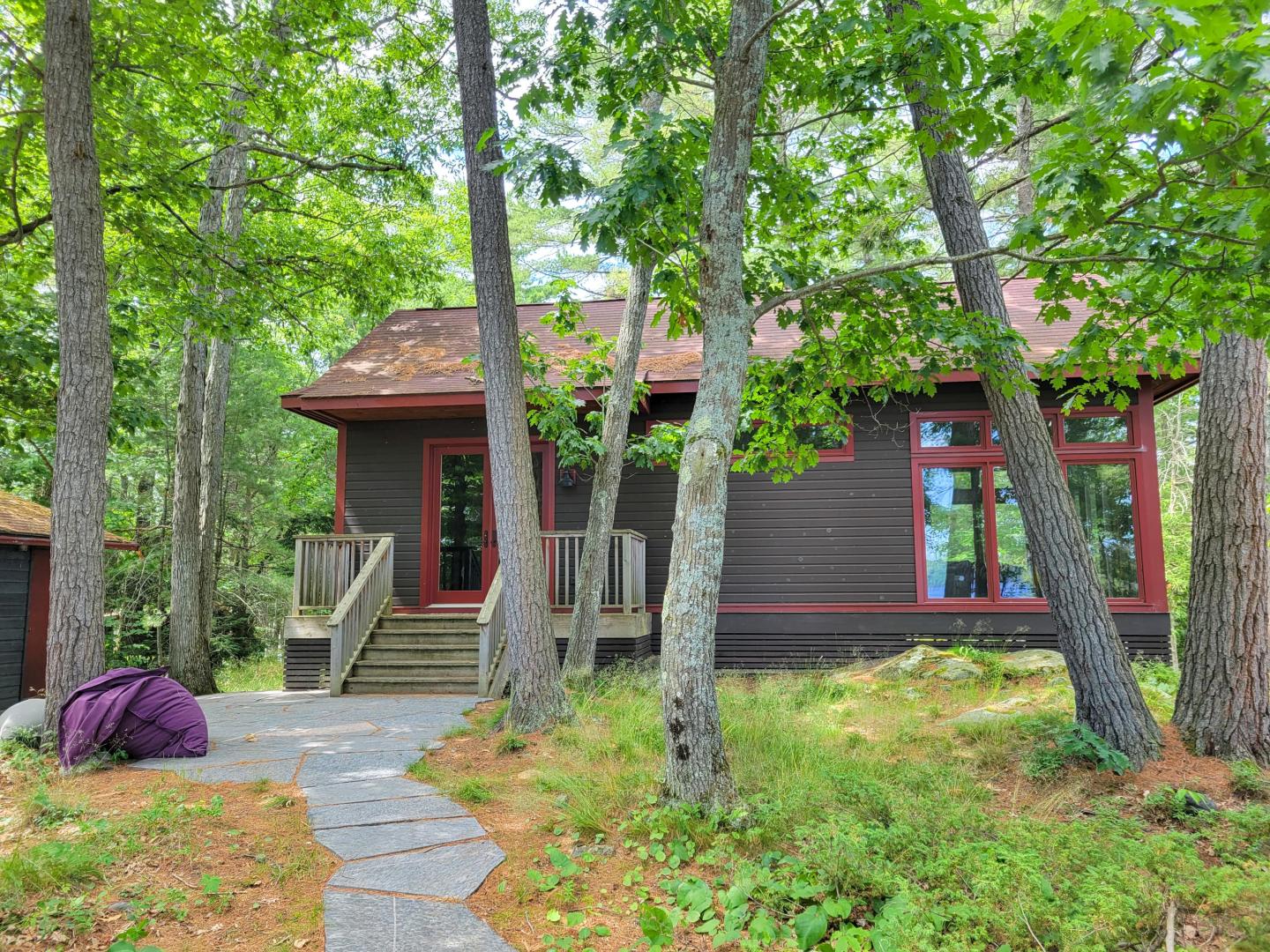 Designed by Toronto architect John Carley and built by Rose Point Construction, the main one-bedroom lodge features an inviting open-plan great room with windows on three sides overlooking the water. The warm wood-plank walls and flooring take on added glow from skylights in the vaulted ceiling. A sunroom, which can be separated from the great room by sliding glass panels, serves as family room, lounge, and workout area. The state-of-the-art kitchen features top-end appliances, generous storage, granite countertops, and a butcher block island. A walk out from the kitchen leads to an outdoor deck with brick pizza oven and barbeque. Marshall Black Carpentry designed the master cottage with a large bedroom lined with floor-to-ceiling windows, an office, and a 3-piece ensuite with walk-in and outdoor showers. The sleeping cabin is original to the property and has been renovated to create two separate bedroom suites, each with a three-piece bath.