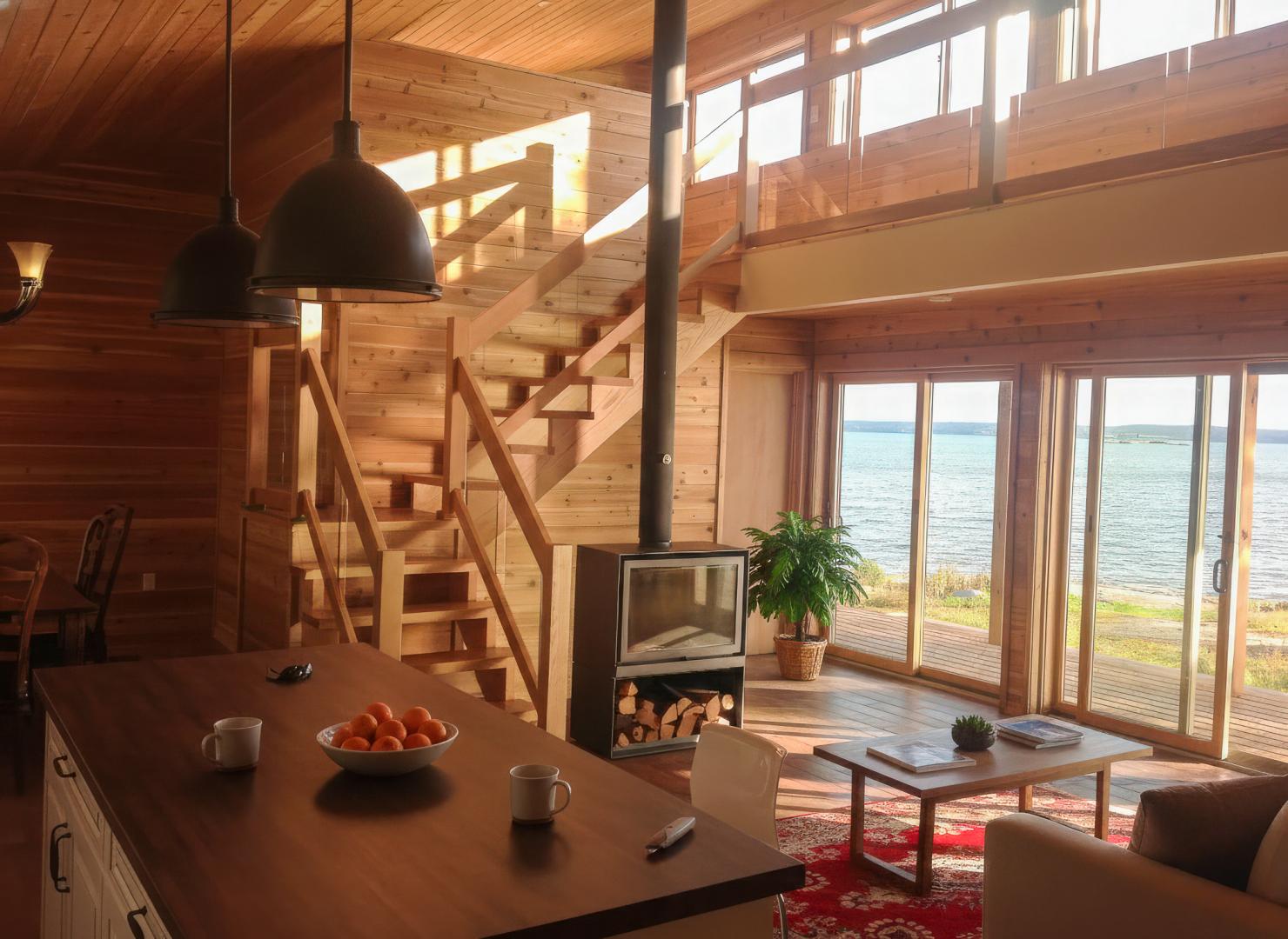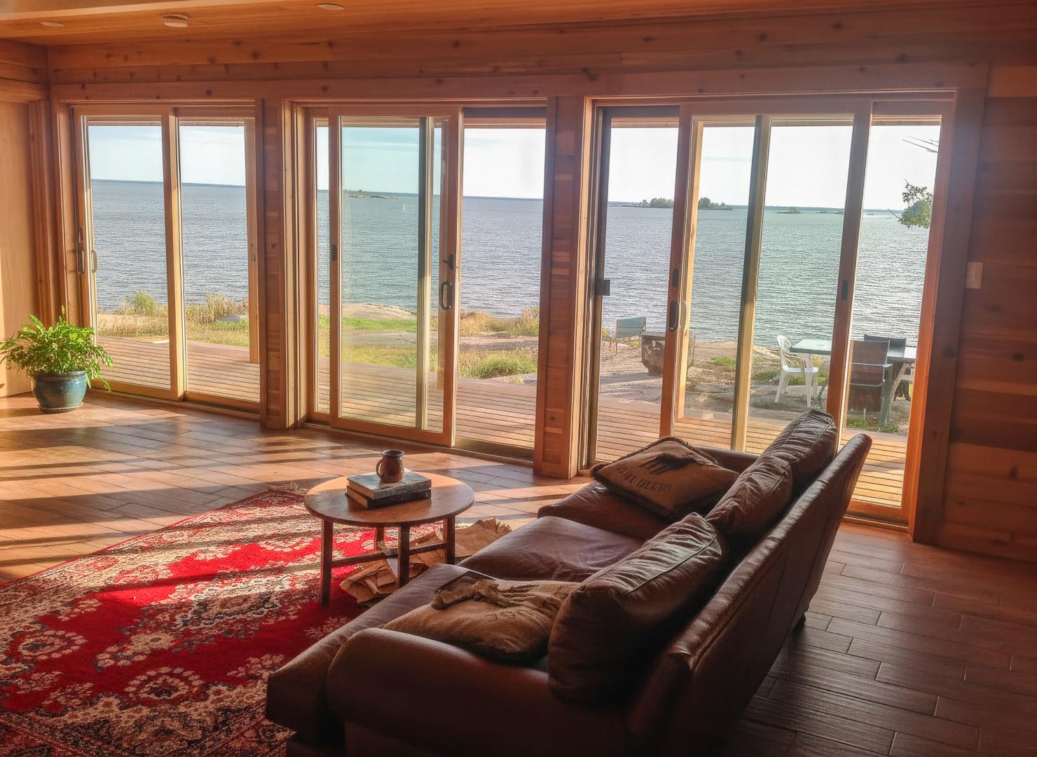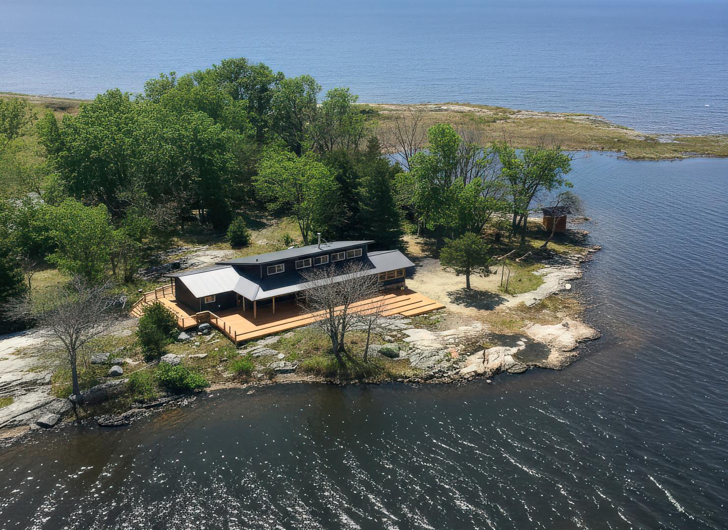 The island features a stunning hand-hewn log home with exquisite wood floors, exposed post and beam construction, and a majestic wood stove. The main cabin boasts three multifunctional rooms, a loft, and a custom kitchen and bathroom with high-end finishes. The property includes SIP flooring on Canadian Shield rock, porcelain tile throughout floors and bathrooms, and Roxul insulation for warmth and soundproofing.