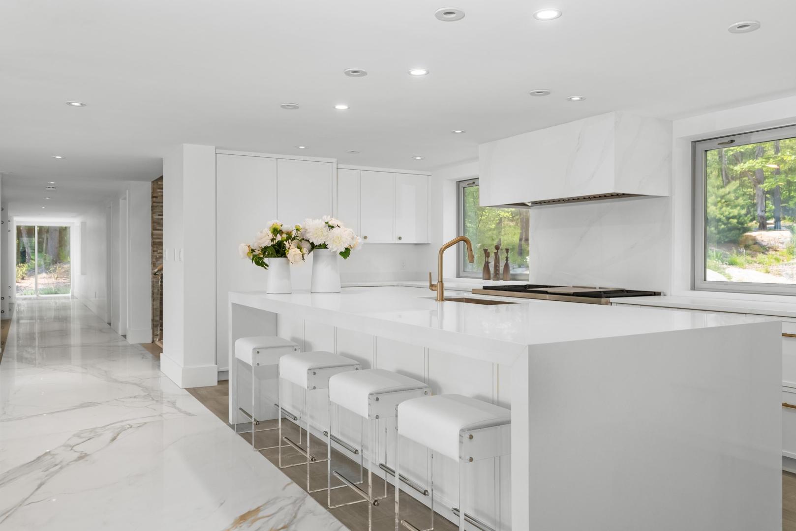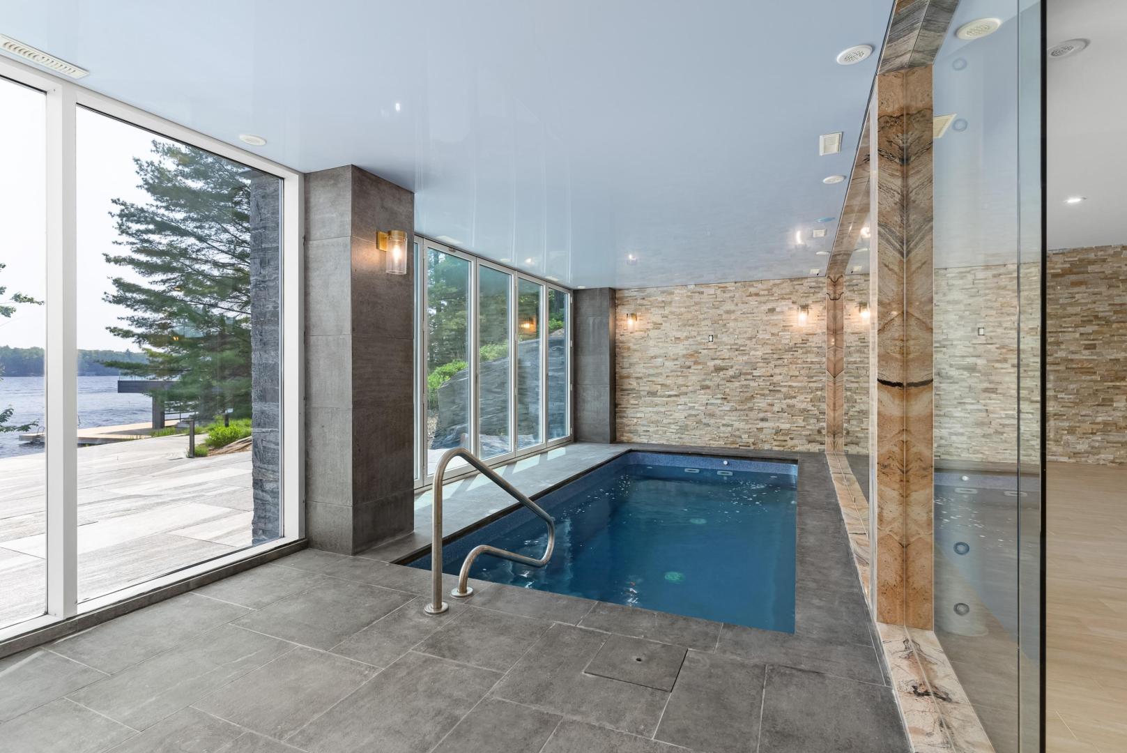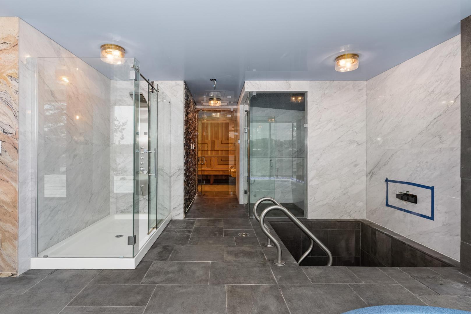 The custom kitchen is a culinary enthusiast's dream, featuring top-of-the-line appliances, brand name countertops, and exquisite marble tiles. The sunken living room is an inviting space, while the Stuv wood-burning custom fireplaces create a warm ambiance. Additionally, a full spa awaits, complete with a pool equipped with swim jets, a hot tub, cold plunge pool, sauna, steam room, and a massage shower.