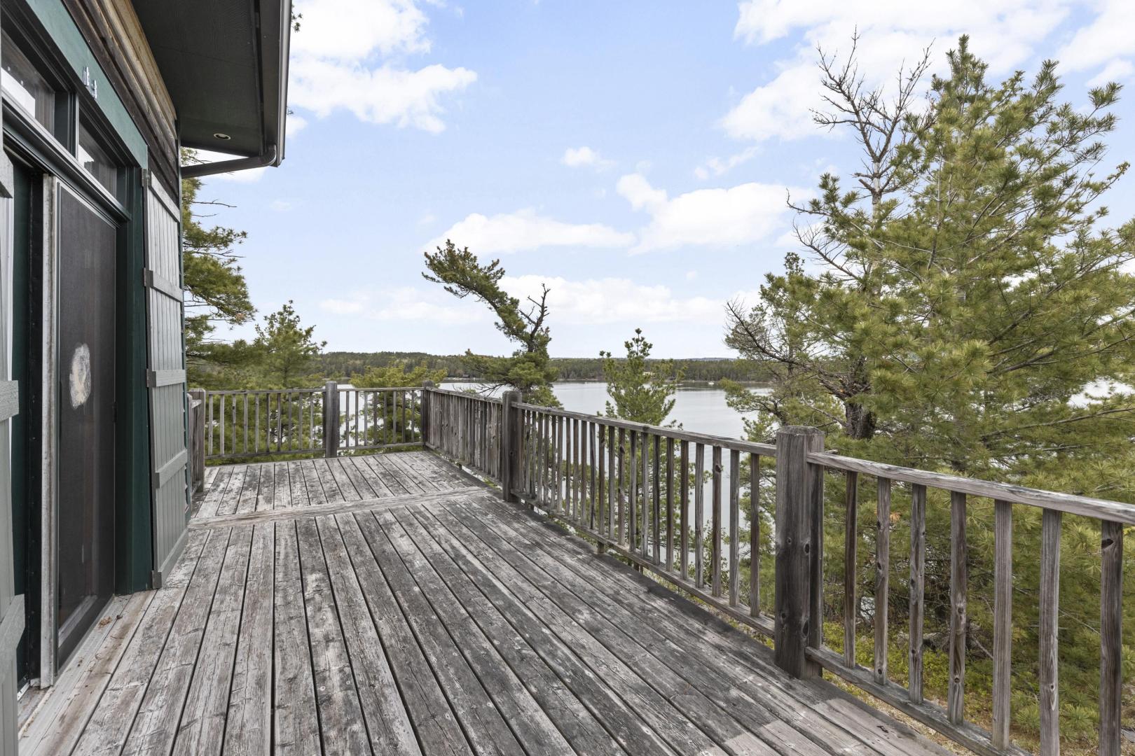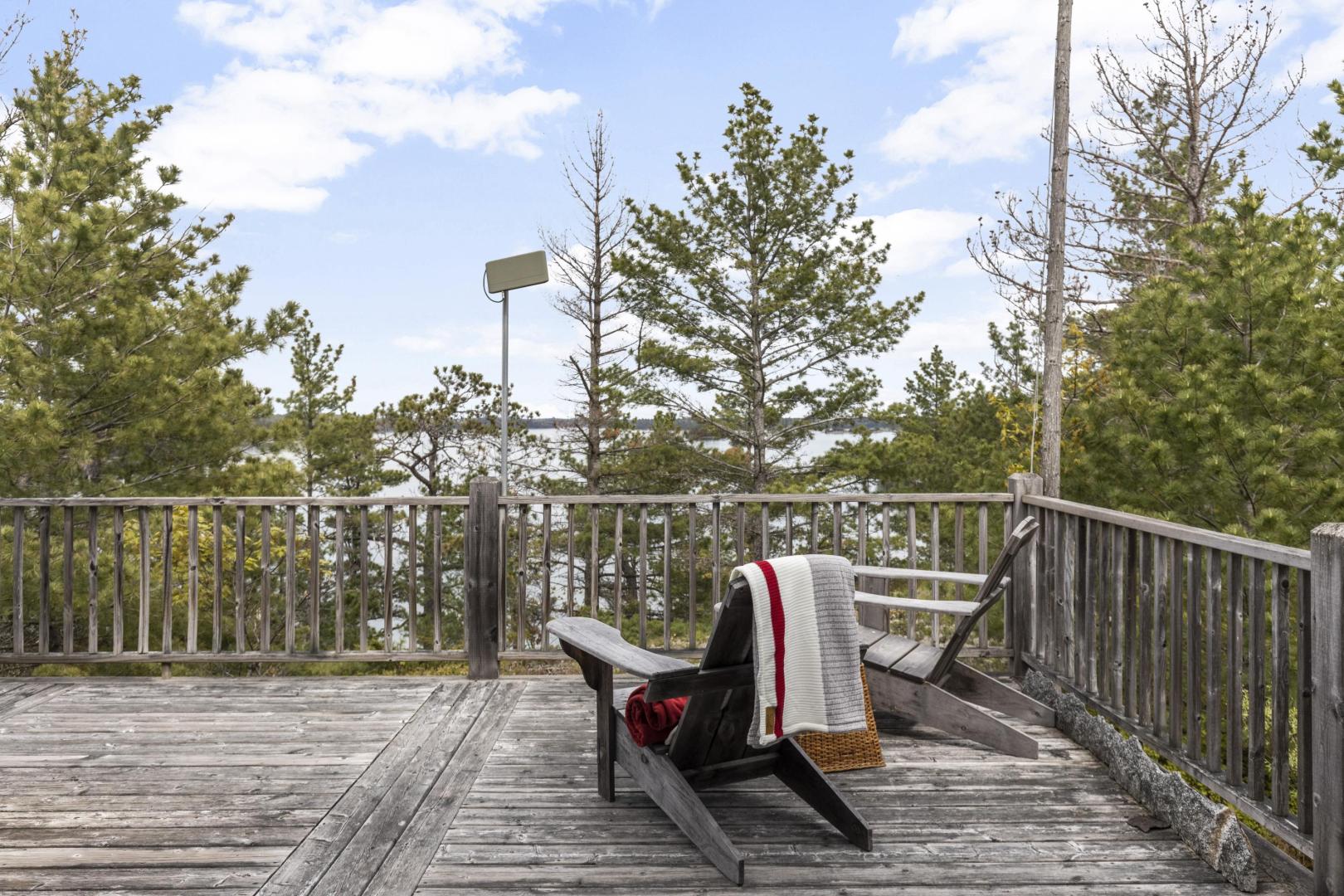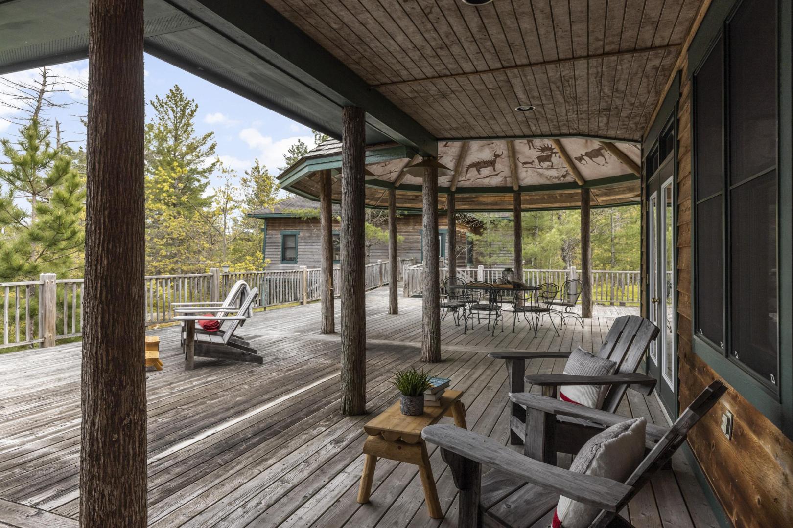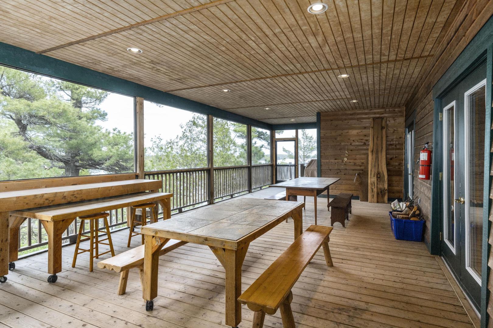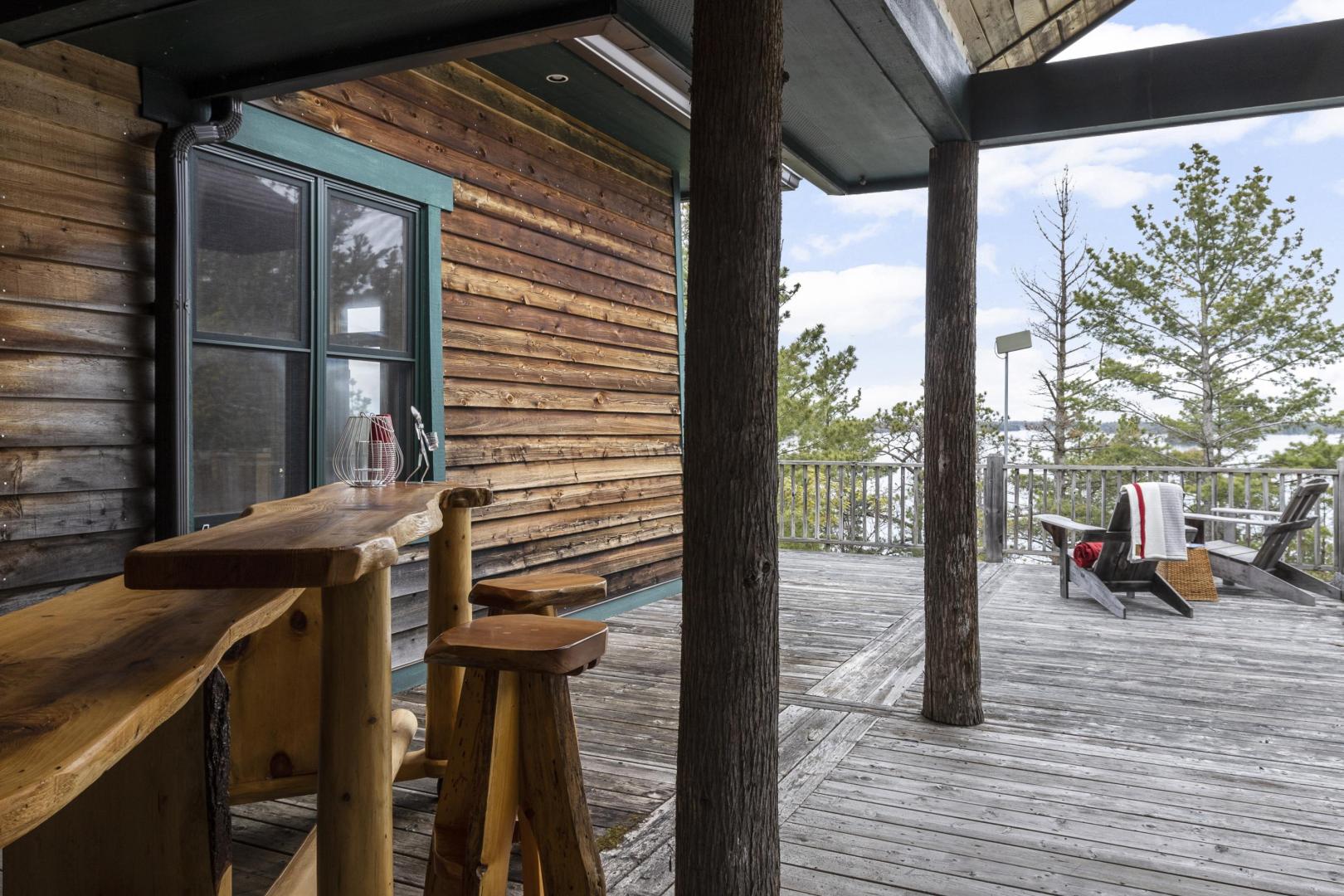 Picture Island includes a one-bedroom main house connected by decking to a three-bedroom guesthouse. Both are wood-frame construction on concrete pilings, set high above the water and blending beautifully with the surrounding stone and trees. The 2.500-square-foot main house features another 2,500 square feet of surrounding deck and porches; the large eastern-facing front deck delivers views down Saint Mary’s River and toward the open waters of Lake Huron, while the south side of the house has a large covered porch and gazebo. Inside, the house boasts a large kitchen area; a dining area with a big pine table and benches; a living room with beautiful maple floors, a fireplace, and a vaulted ceiling with white cedar walls; and a large library with desks, cabinets and an entertainment center with a projector and screen. There’s also an outdoor kitchen with its own electric stove, sink and countertops for food preparation and dining among the surrounding trees.