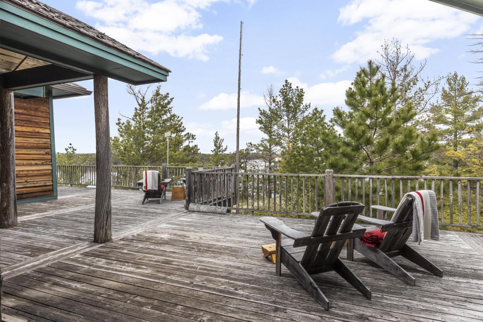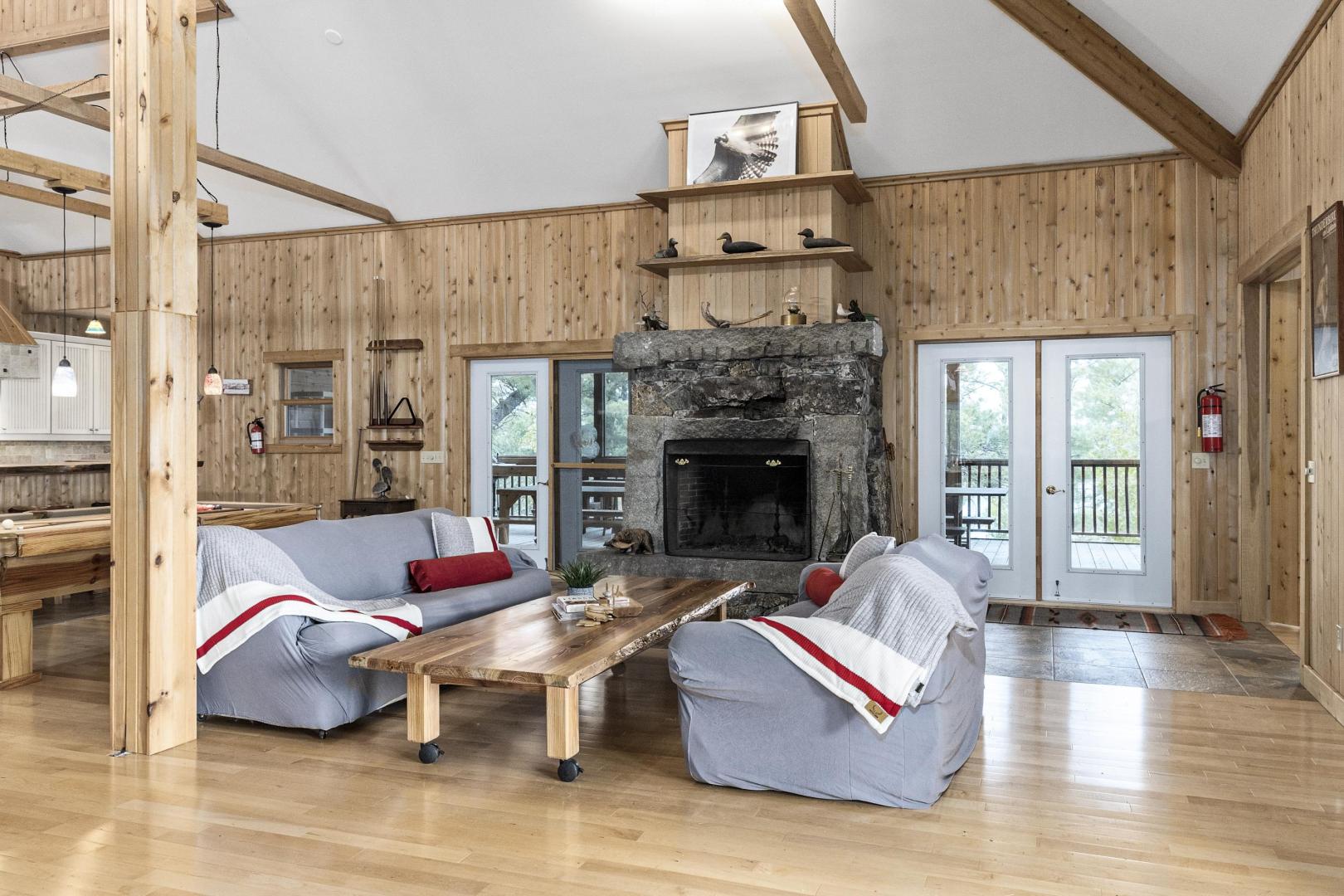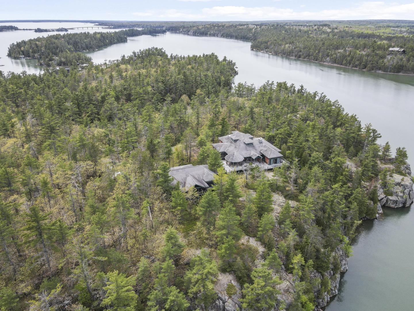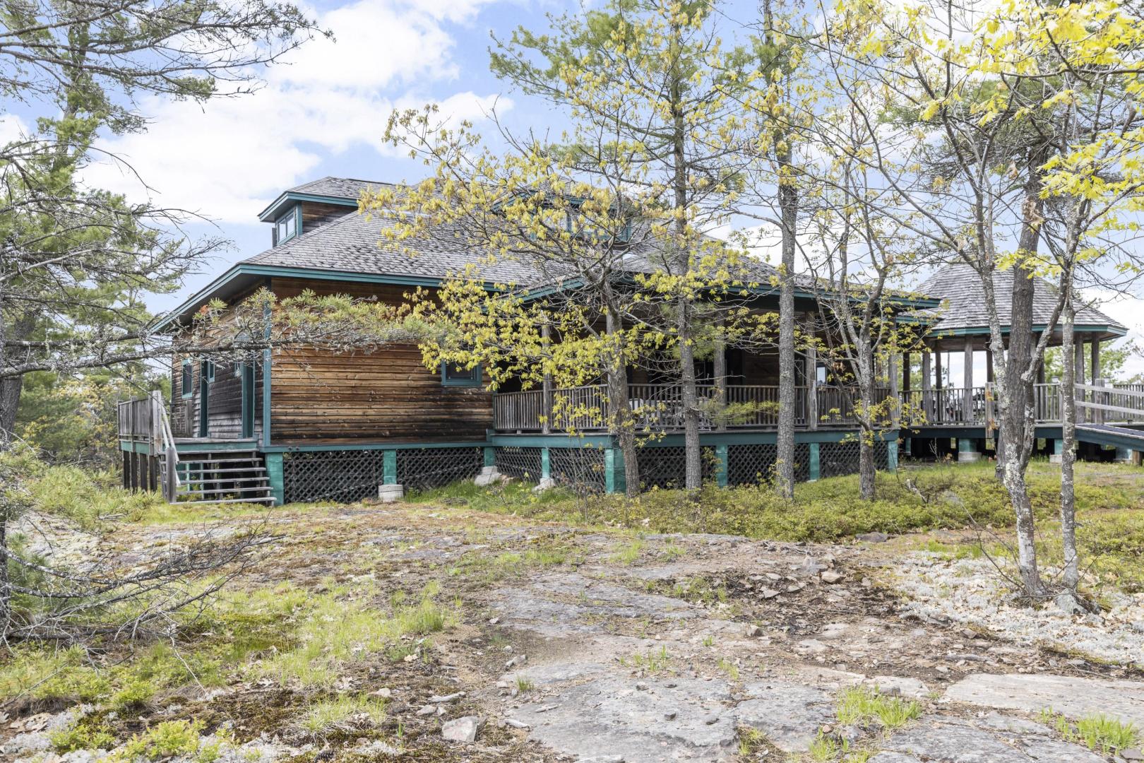 Picture Island includes a one-bedroom main house connected by decking to a three-bedroom guesthouse. Both are wood-frame construction on concrete pilings, set high above the water and blending beautifully with the surrounding stone and trees. The 2.500-square-foot main house features another 2,500 square feet of surrounding deck and porches; the large eastern-facing front deck delivers views down Saint Mary’s River and toward the open waters of Lake Huron, while the south side of the house has a large covered porch and gazebo. Inside, the house boasts a large kitchen area; a dining area with a big pine table and benches; a living room with beautiful maple floors, a fireplace, and a vaulted ceiling with white cedar walls; and a large library with desks, cabinets and an entertainment center with a projector and screen. There’s also an outdoor kitchen with its own electric stove, sink and countertops for food preparation and dining among the surrounding trees.