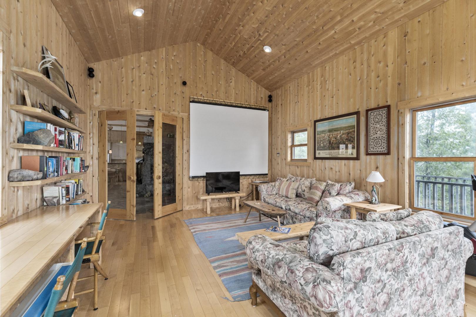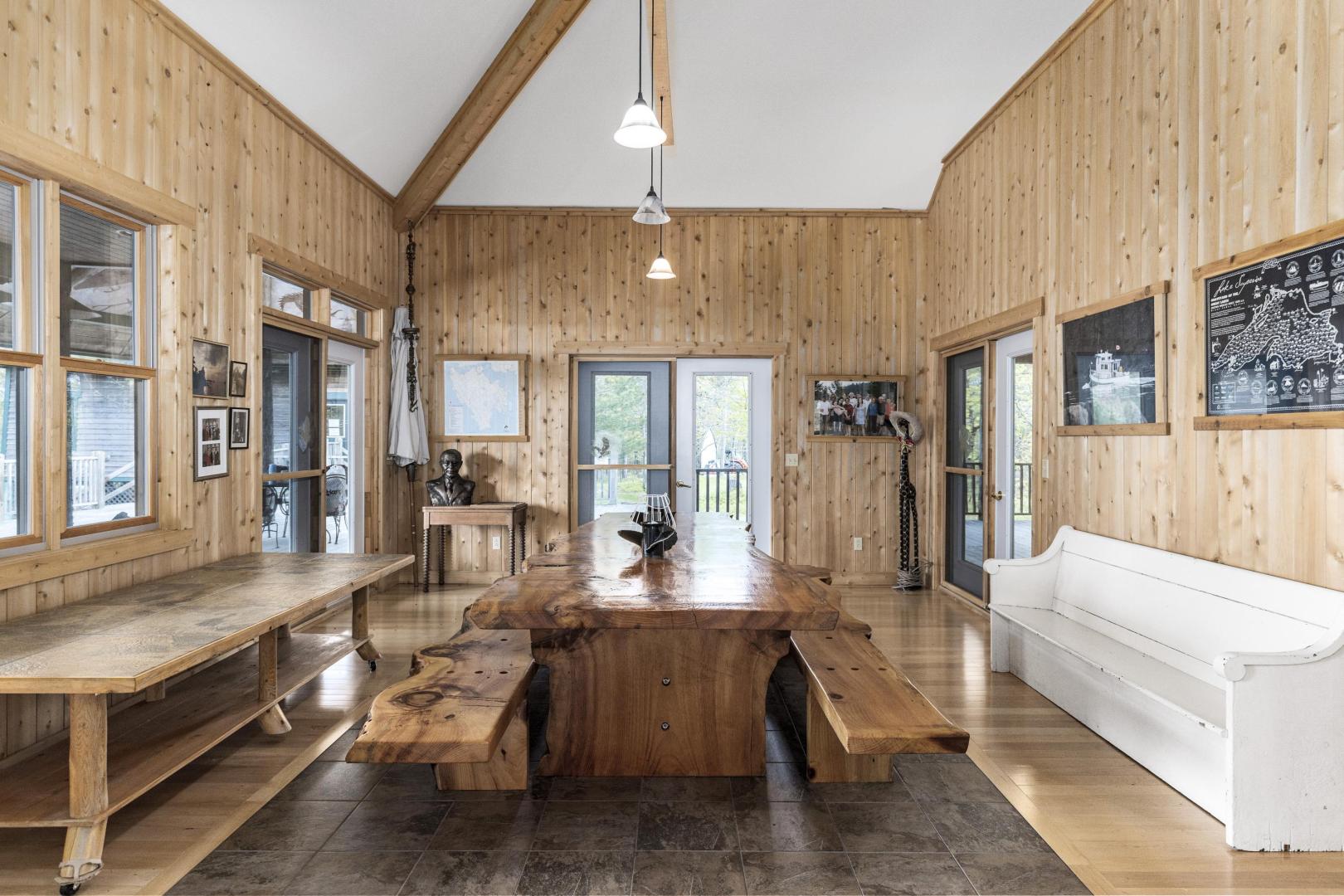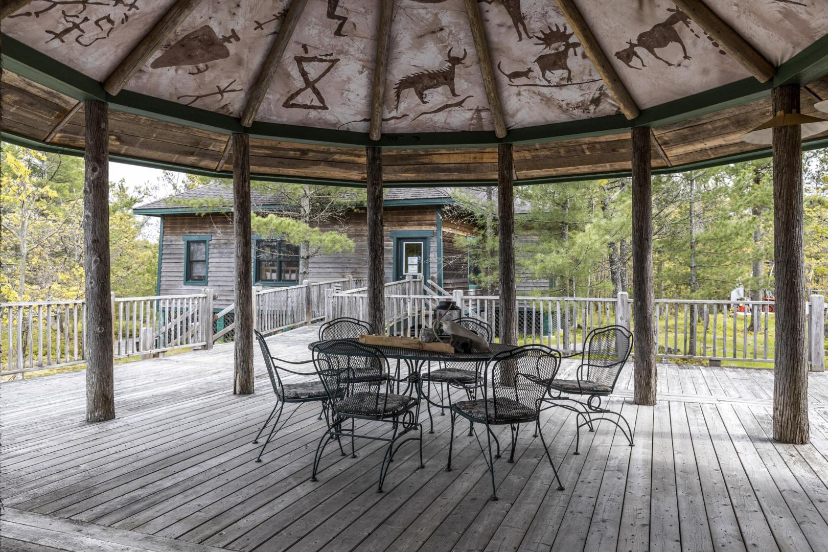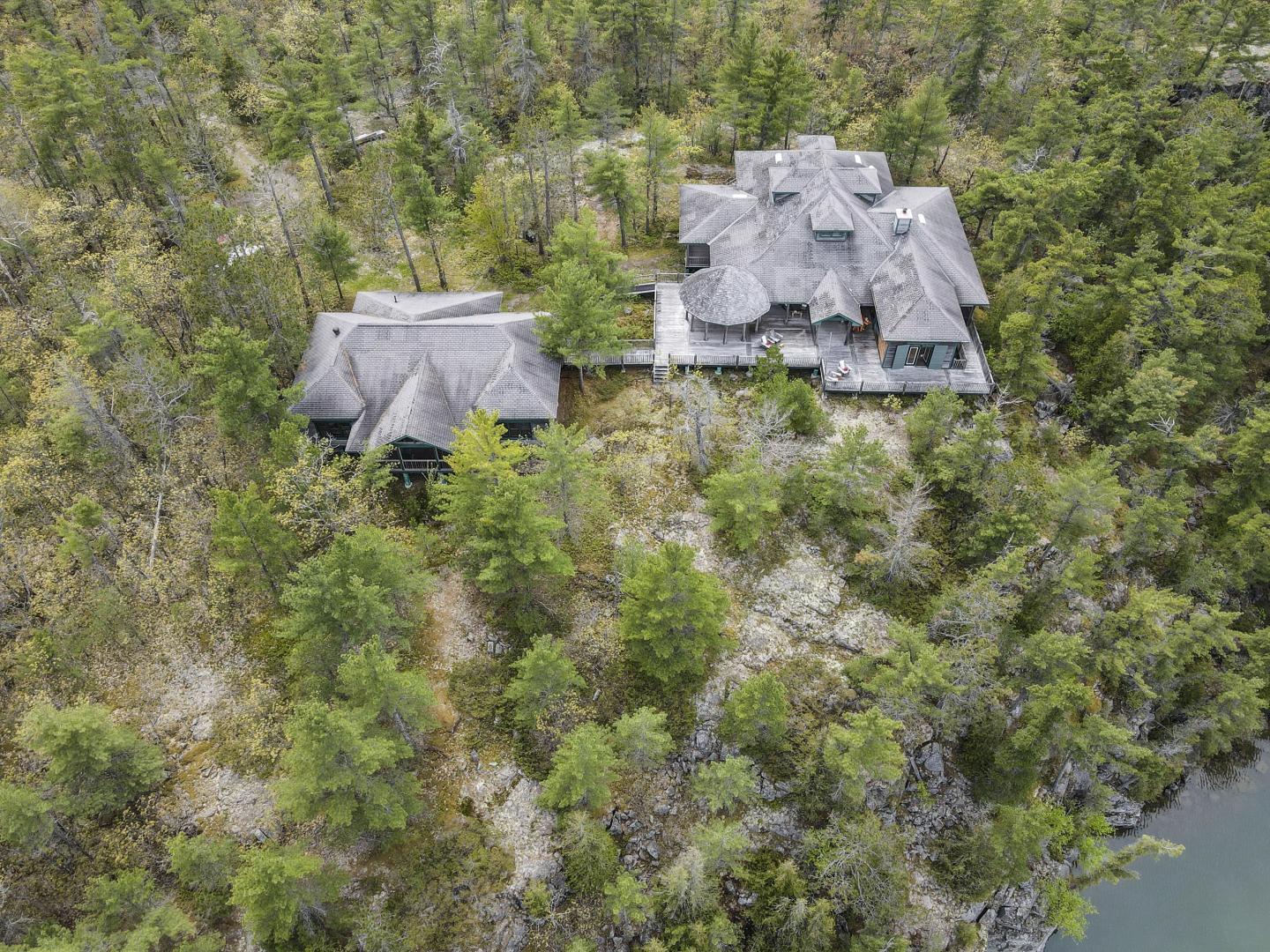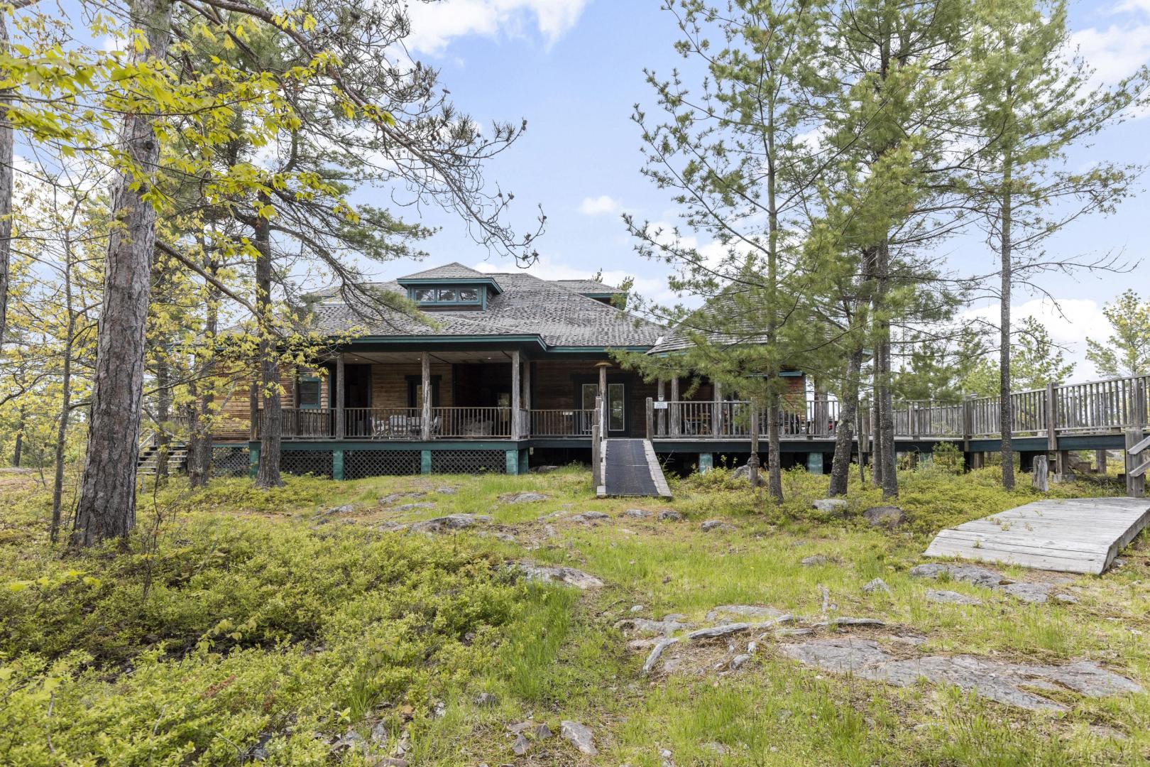 Picture Island includes a one-bedroom main house connected by decking to a three-bedroom guesthouse. Both are wood-frame construction on concrete pilings, set high above the water and blending beautifully with the surrounding stone and trees. The 2.500-square-foot main house features another 2,500 square feet of surrounding deck and porches; the large eastern-facing front deck delivers views down Saint Mary’s River and toward the open waters of Lake Huron, while the south side of the house has a large covered porch and gazebo. Inside, the house boasts a large kitchen area; a dining area with a big pine table and benches; a living room with beautiful maple floors, a fireplace, and a vaulted ceiling with white cedar walls; and a large library with desks, cabinets and an entertainment center with a projector and screen. There’s also an outdoor kitchen with its own electric stove, sink and countertops for food preparation and dining among the surrounding trees.