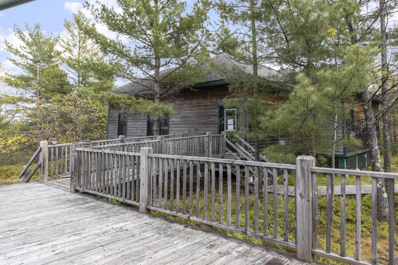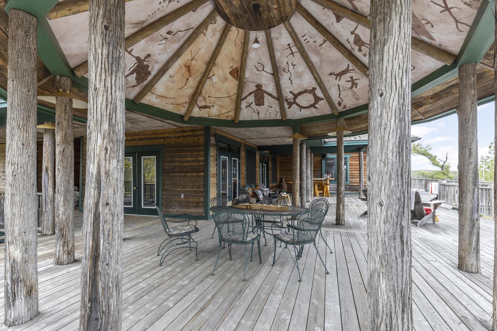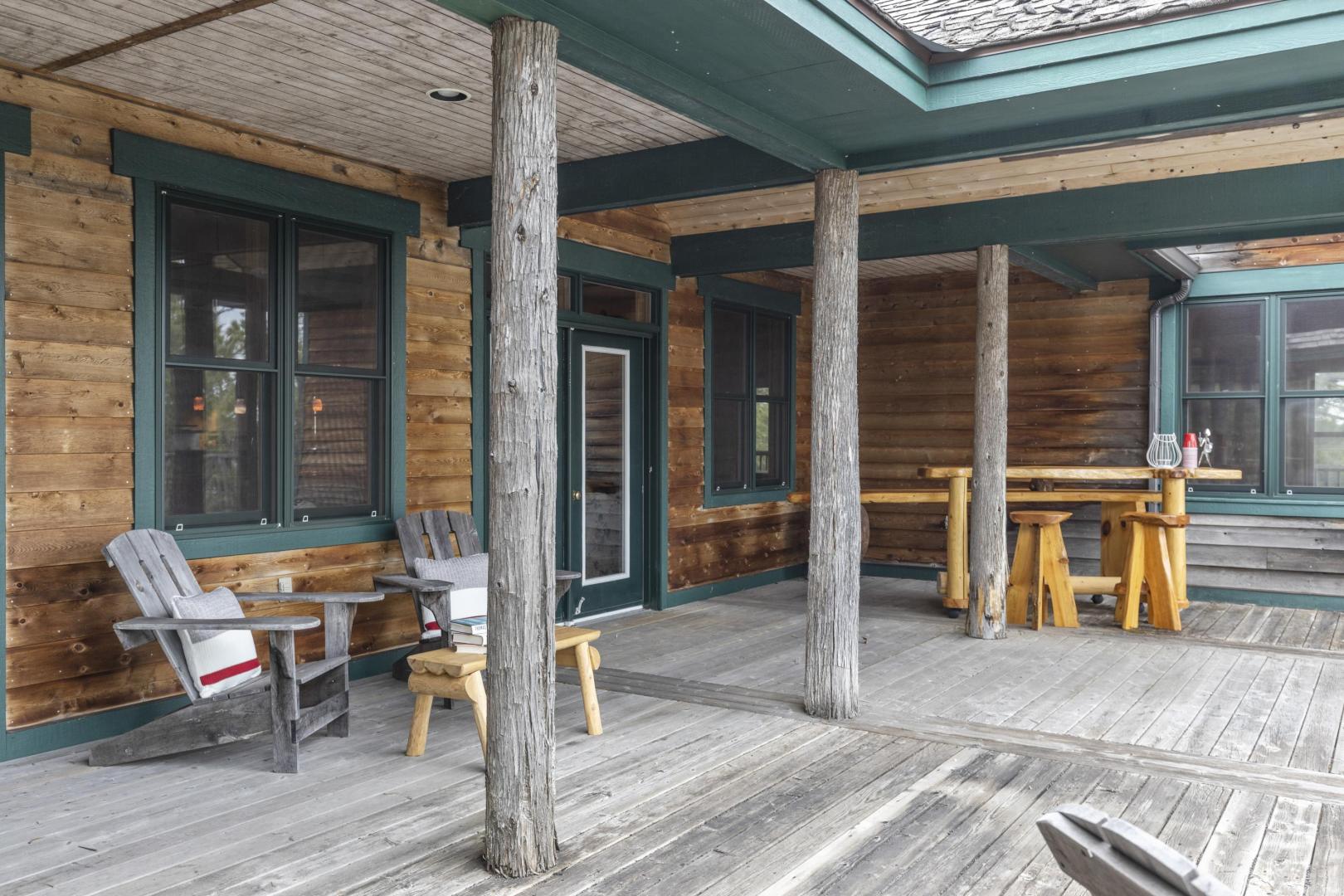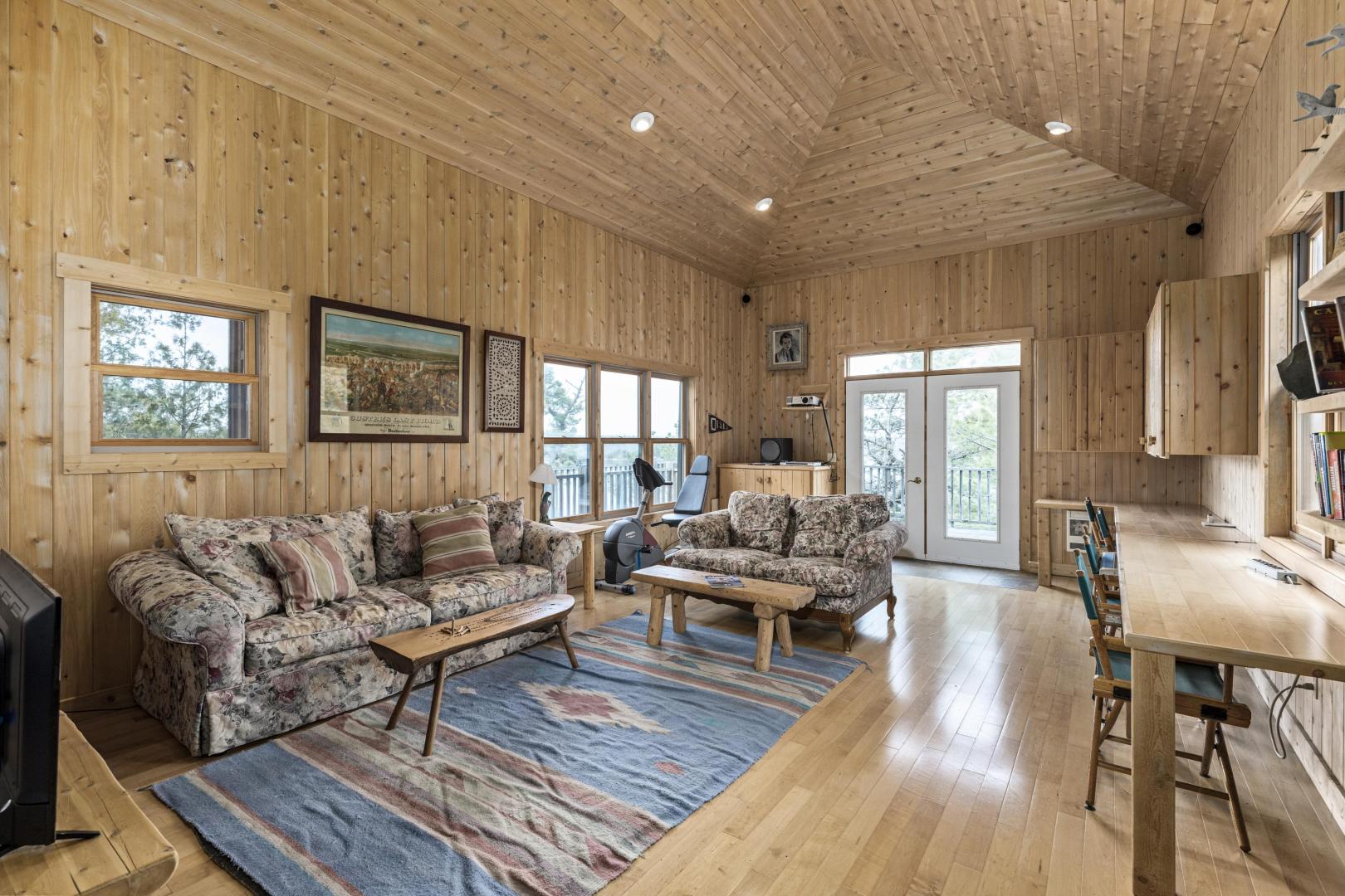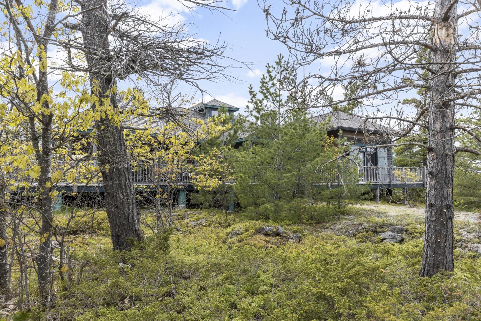 Picture Island includes a one-bedroom main house connected by decking to a three-bedroom guesthouse. Both are wood-frame construction on concrete pilings, set high above the water and blending beautifully with the surrounding stone and trees. The 2.500-square-foot main house features another 2,500 square feet of surrounding deck and porches; the large eastern-facing front deck delivers views down Saint Mary’s River and toward the open waters of Lake Huron, while the south side of the house has a large covered porch and gazebo. Inside, the house boasts a large kitchen area; a dining area with a big pine table and benches; a living room with beautiful maple floors, a fireplace, and a vaulted ceiling with white cedar walls; and a large library with desks, cabinets and an entertainment center with a projector and screen. There’s also an outdoor kitchen with its own electric stove, sink and countertops for food preparation and dining among the surrounding trees.