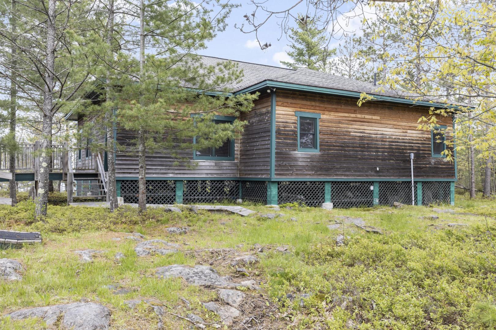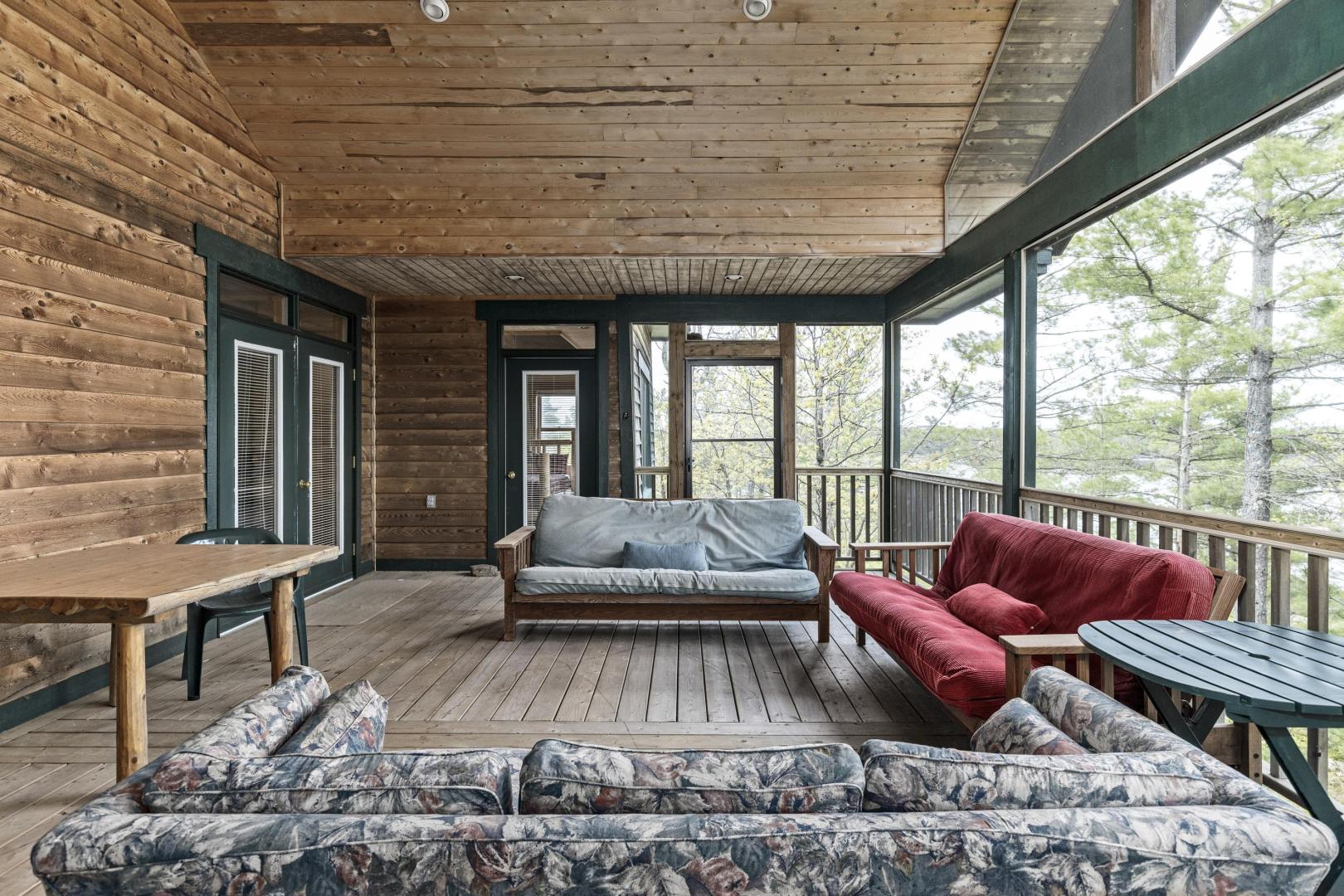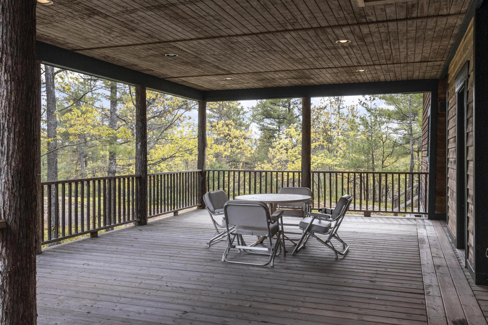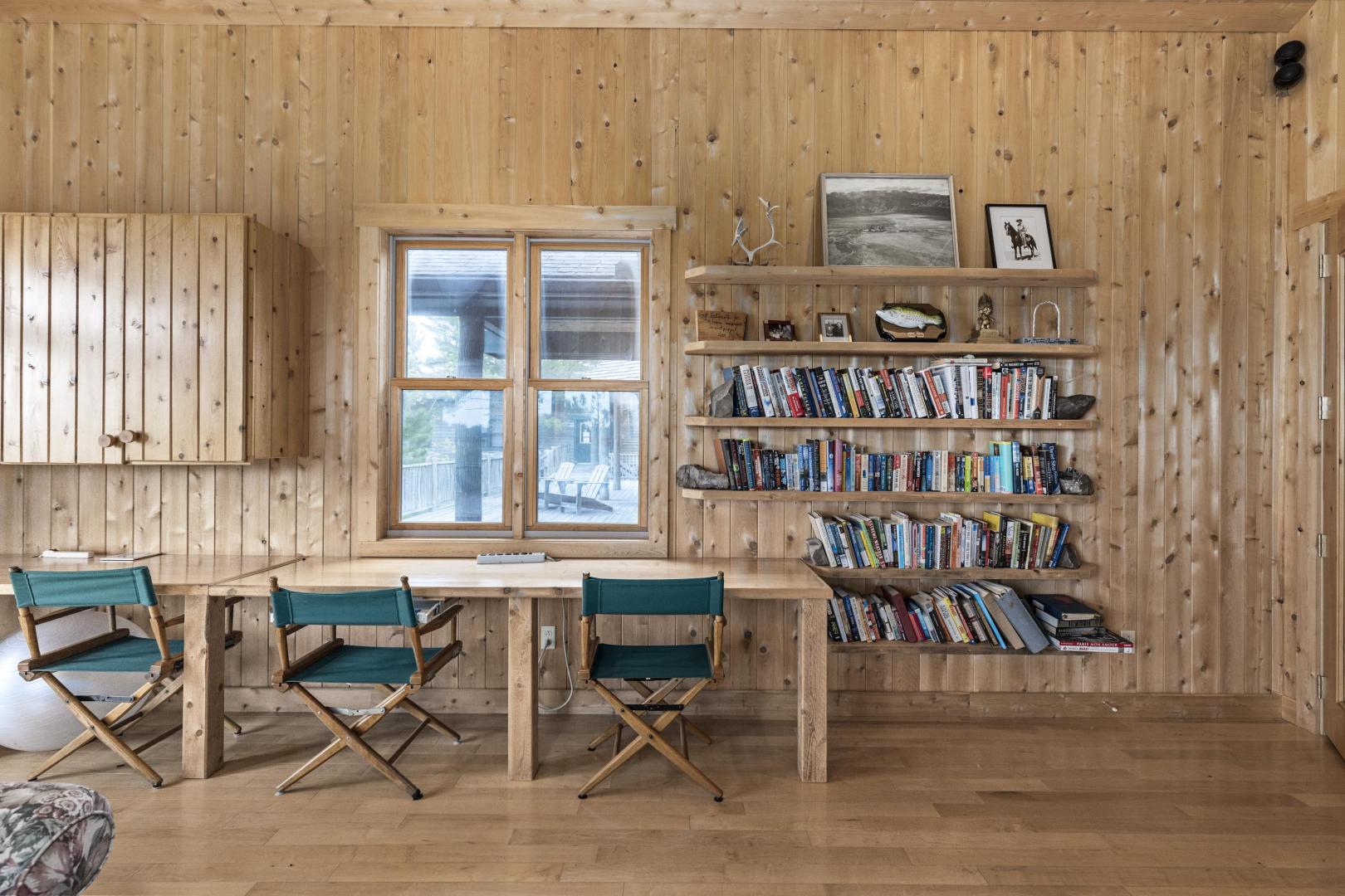 Picture Island includes a one-bedroom main house connected by decking to a three-bedroom guesthouse. Both are wood-frame construction on concrete pilings, set high above the water and blending beautifully with the surrounding stone and trees. The 2.500-square-foot main house features another 2,500 square feet of surrounding deck and porches; the large eastern-facing front deck delivers views down Saint Mary’s River and toward the open waters of Lake Huron, while the south side of the house has a large covered porch and gazebo. Inside, the house boasts a large kitchen area; a dining area with a big pine table and benches; a living room with beautiful maple floors, a fireplace, and a vaulted ceiling with white cedar walls; and a large library with desks, cabinets and an entertainment center with a projector and screen. There’s also an outdoor kitchen with its own electric stove, sink and countertops for food preparation and dining among the surrounding trees.