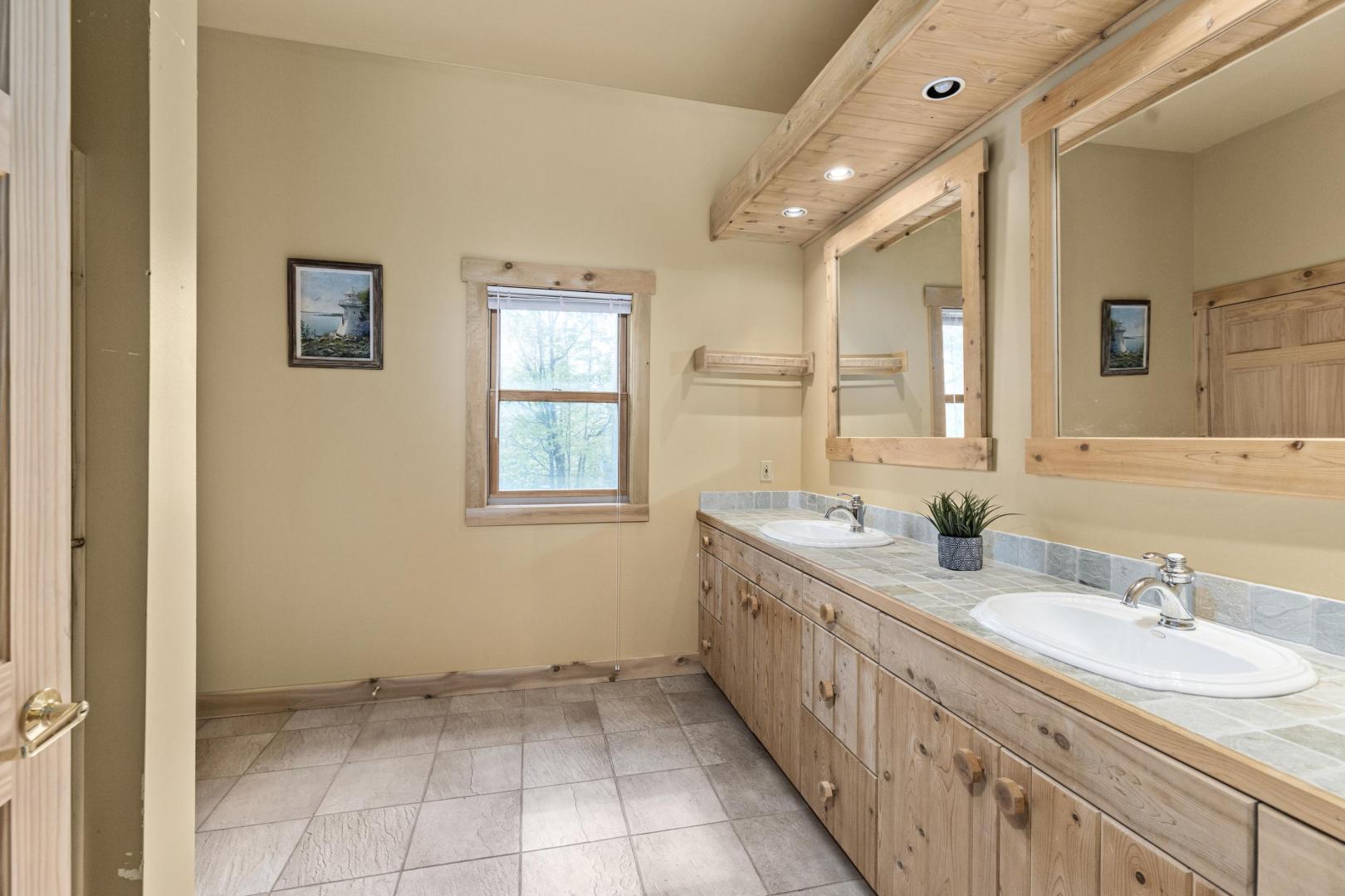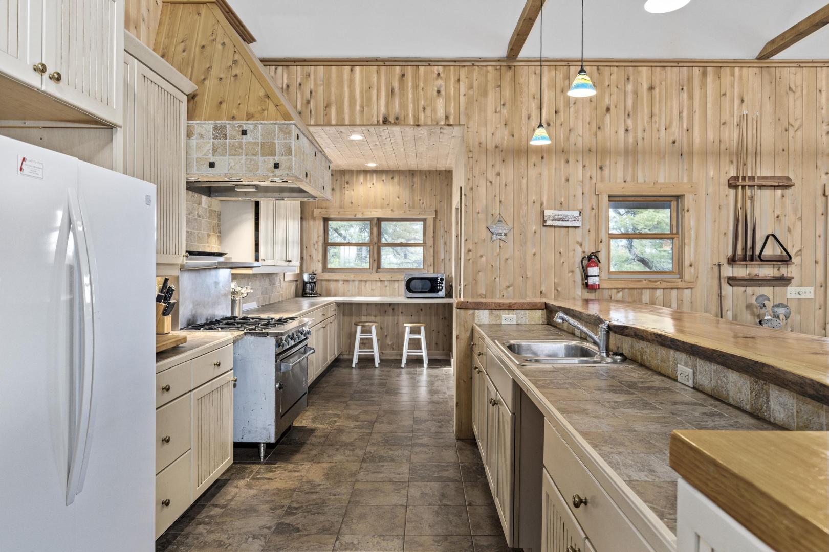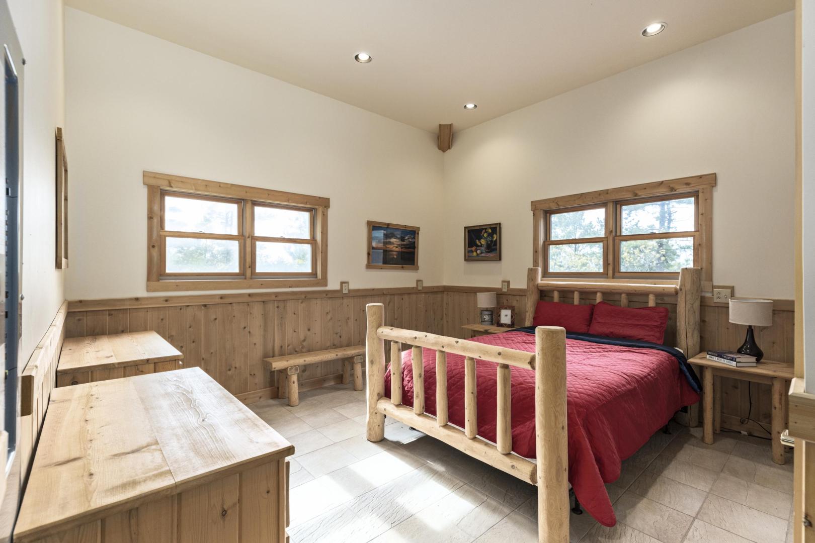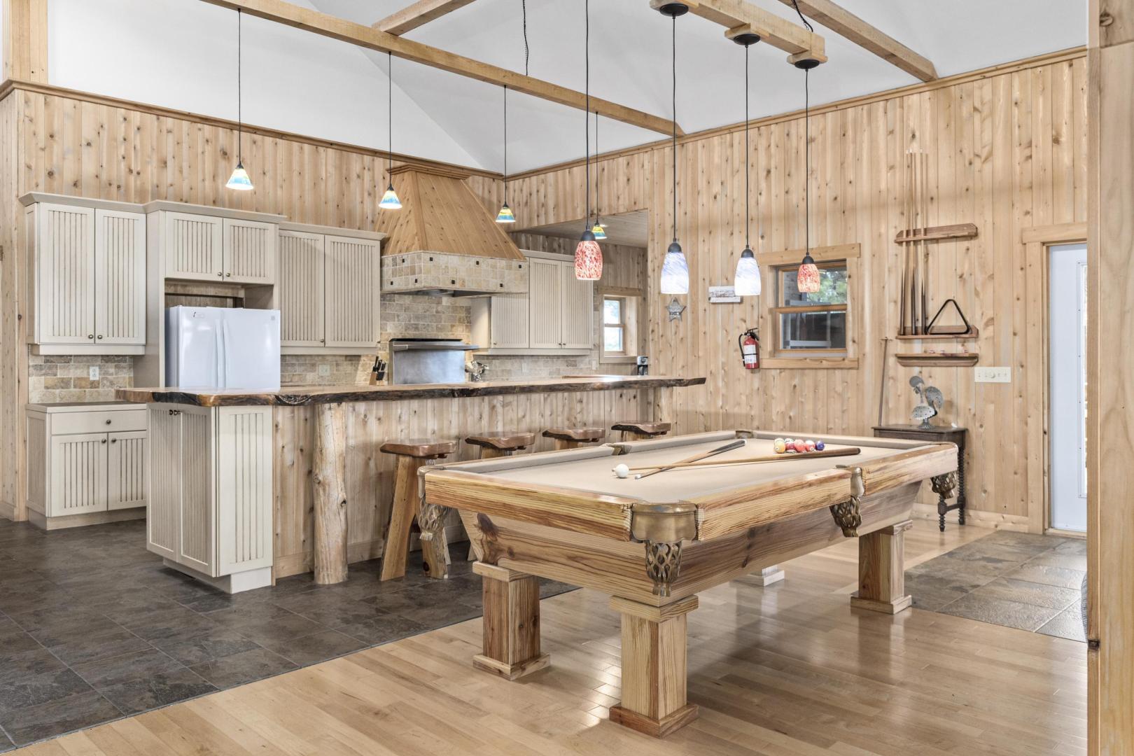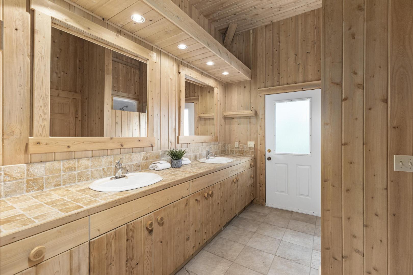 Picture Island includes a one-bedroom main house connected by decking to a three-bedroom guesthouse. Both are wood-frame construction on concrete pilings, set high above the water and blending beautifully with the surrounding stone and trees. The 2.500-square-foot main house features another 2,500 square feet of surrounding deck and porches; the large eastern-facing front deck delivers views down Saint Mary’s River and toward the open waters of Lake Huron, while the south side of the house has a large covered porch and gazebo. Inside, the house boasts a large kitchen area; a dining area with a big pine table and benches; a living room with beautiful maple floors, a fireplace, and a vaulted ceiling with white cedar walls; and a large library with desks, cabinets and an entertainment center with a projector and screen. There’s also an outdoor kitchen with its own electric stove, sink and countertops for food preparation and dining among the surrounding trees.