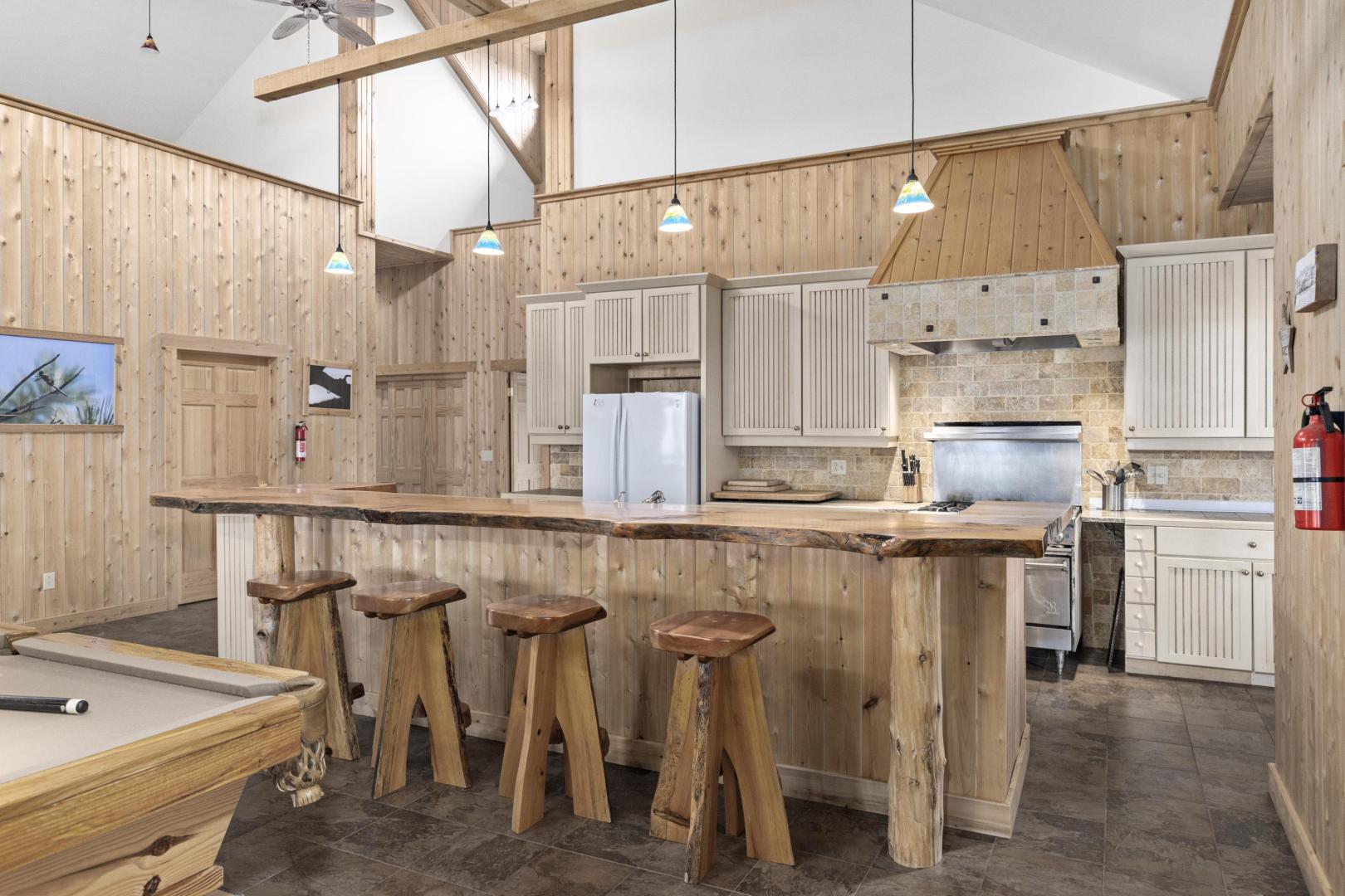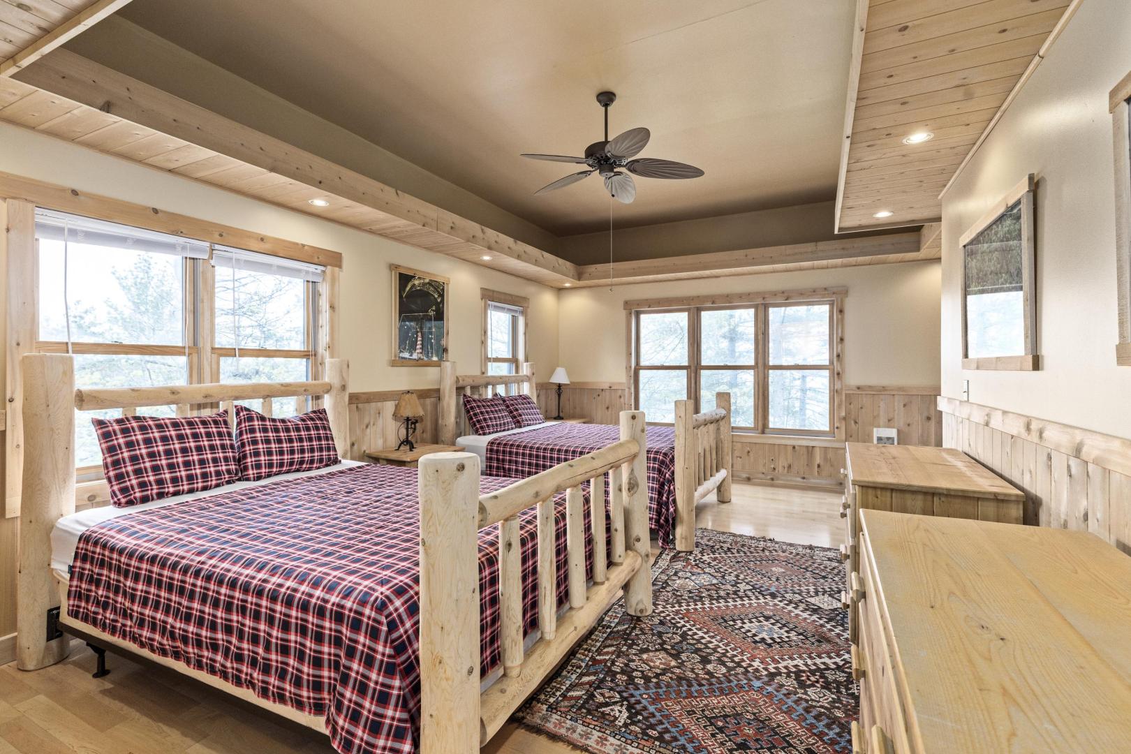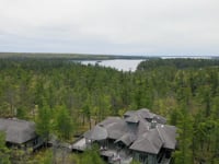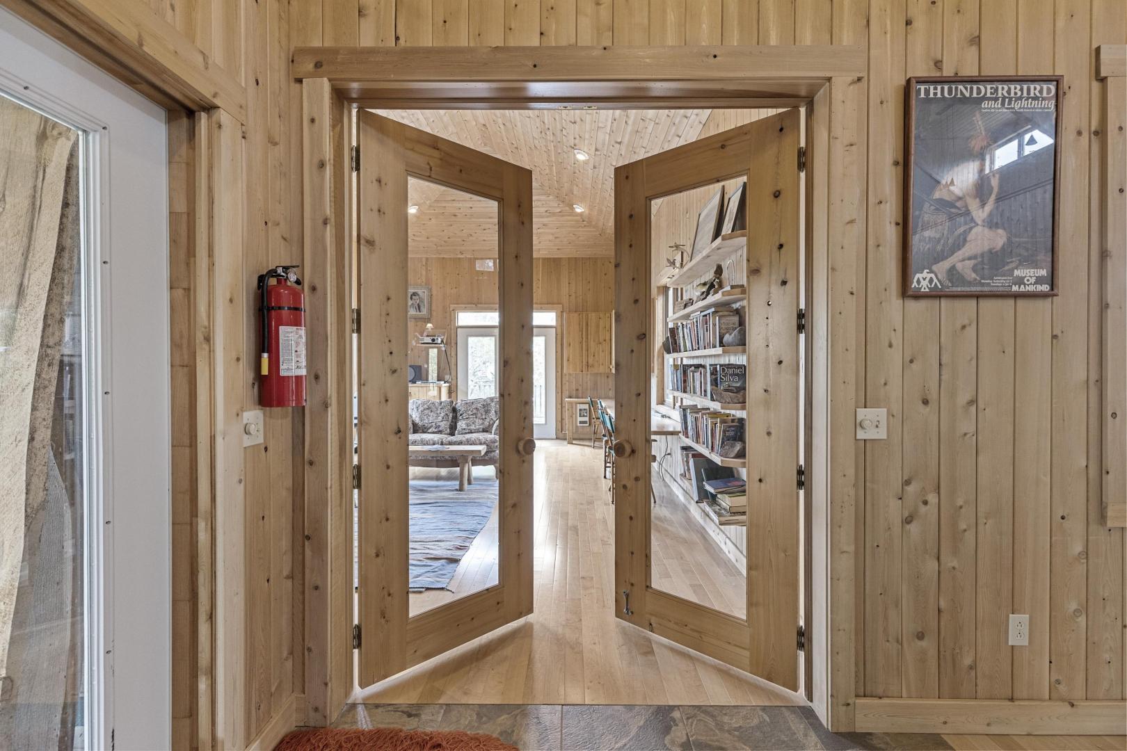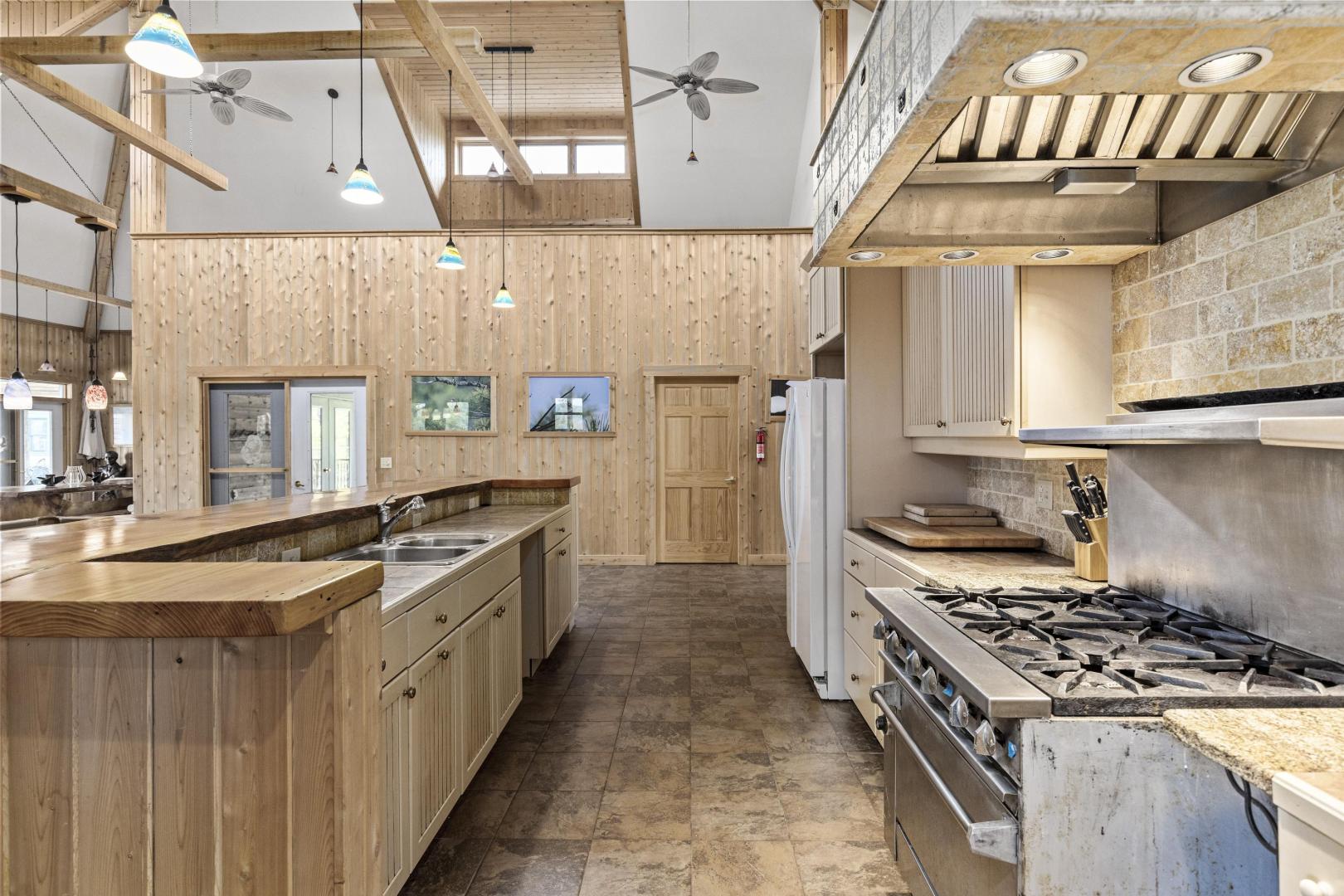 Picture Island includes a one-bedroom main house connected by decking to a three-bedroom guesthouse. Both are wood-frame construction on concrete pilings, set high above the water and blending beautifully with the surrounding stone and trees. The 2.500-square-foot main house features another 2,500 square feet of surrounding deck and porches; the large eastern-facing front deck delivers views down Saint Mary’s River and toward the open waters of Lake Huron, while the south side of the house has a large covered porch and gazebo. Inside, the house boasts a large kitchen area; a dining area with a big pine table and benches; a living room with beautiful maple floors, a fireplace, and a vaulted ceiling with white cedar walls; and a large library with desks, cabinets and an entertainment center with a projector and screen. There’s also an outdoor kitchen with its own electric stove, sink and countertops for food preparation and dining among the surrounding trees.