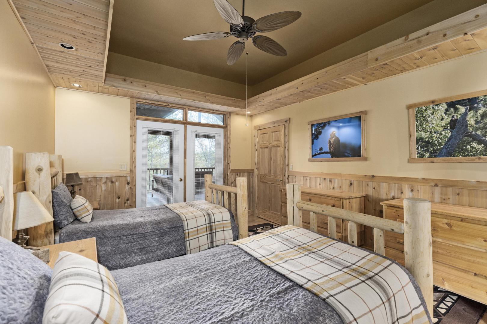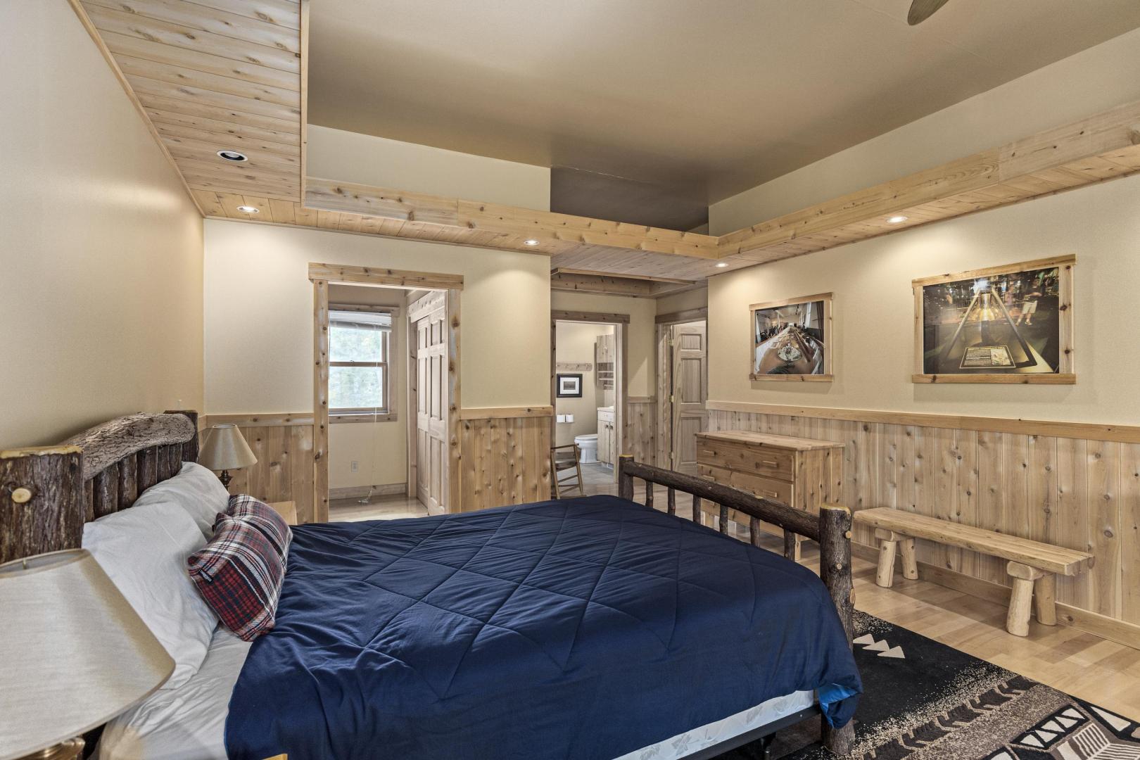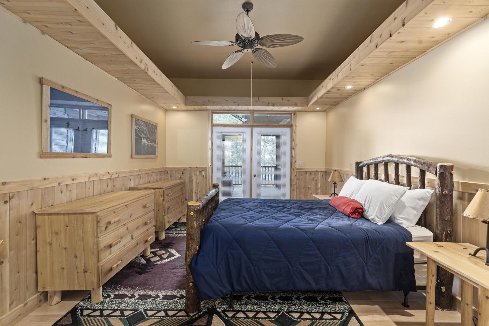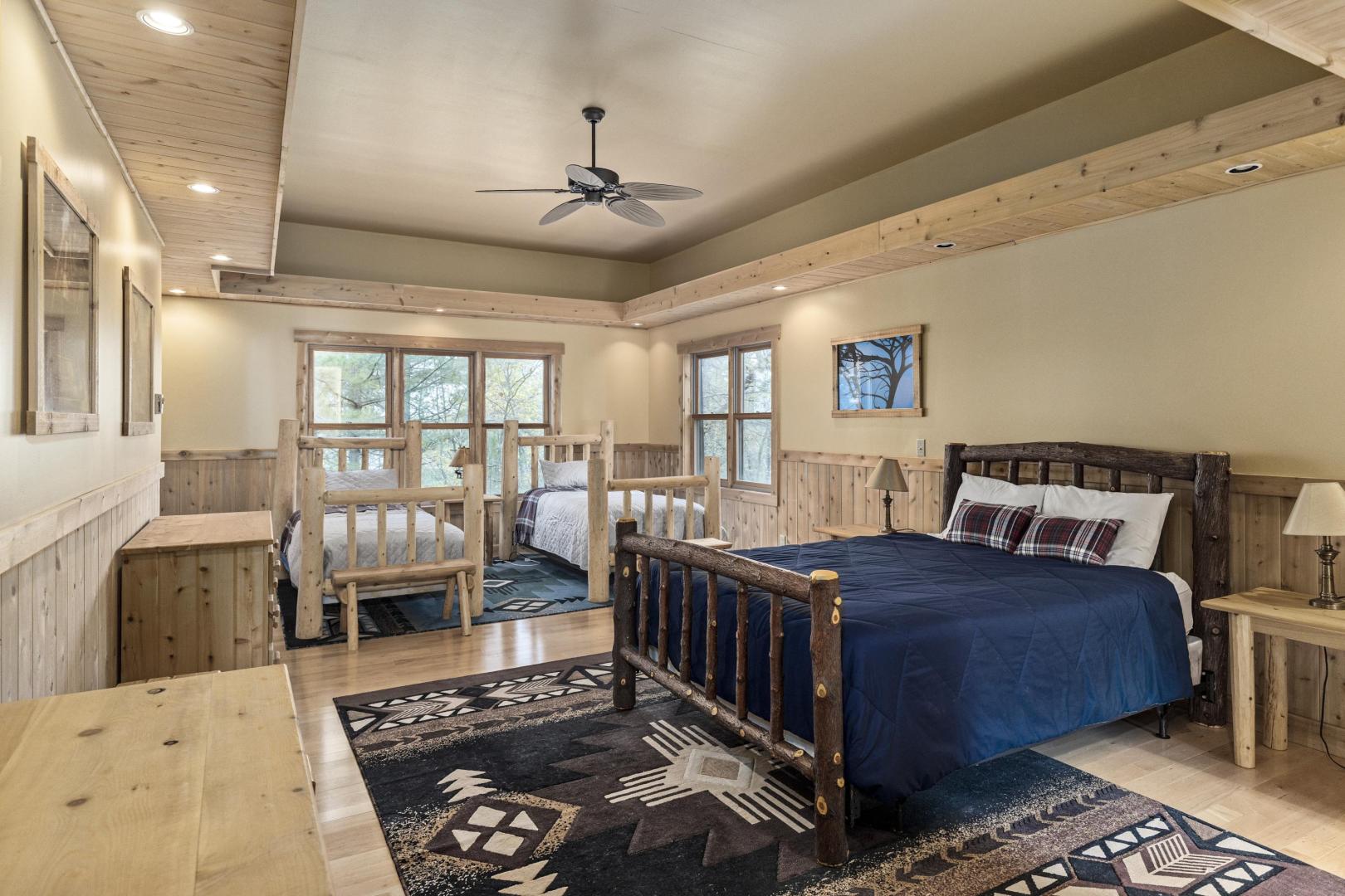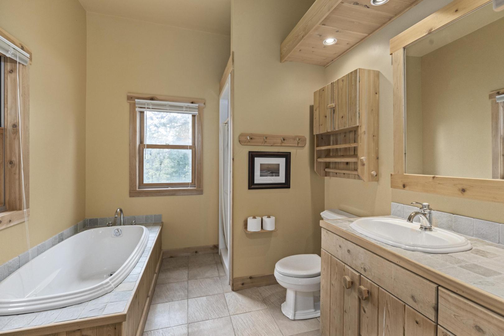 Picture Island includes a one-bedroom main house connected by decking to a three-bedroom guesthouse. Both are wood-frame construction on concrete pilings, set high above the water and blending beautifully with the surrounding stone and trees. The 2.500-square-foot main house features another 2,500 square feet of surrounding deck and porches; the large eastern-facing front deck delivers views down Saint Mary’s River and toward the open waters of Lake Huron, while the south side of the house has a large covered porch and gazebo. Inside, the house boasts a large kitchen area; a dining area with a big pine table and benches; a living room with beautiful maple floors, a fireplace, and a vaulted ceiling with white cedar walls; and a large library with desks, cabinets and an entertainment center with a projector and screen. There’s also an outdoor kitchen with its own electric stove, sink and countertops for food preparation and dining among the surrounding trees.
