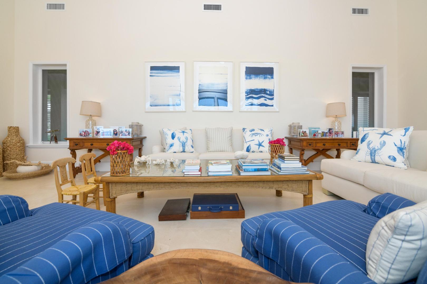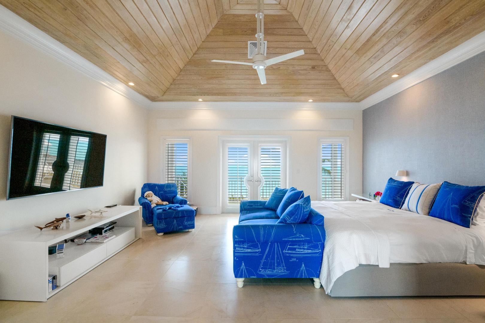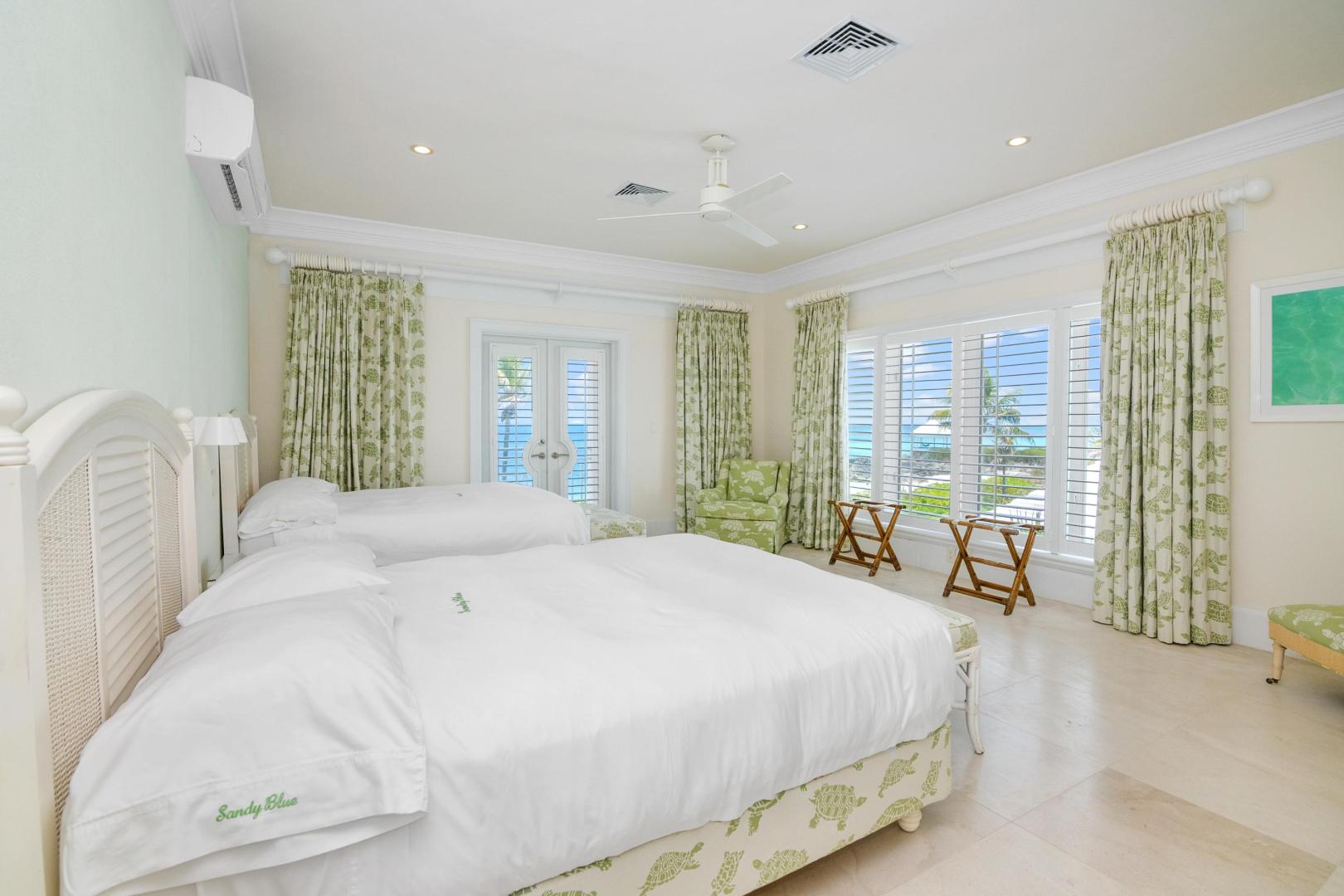 From the moment you enter Sandy Blue, you’re embraced with serene views of the breathtaking waters that lie just beyond the home’s sparkling swimming pool and generously sized 4,166 sq. ft terrace. Decorated to reflect the stunning beauty of the Bahamian waters, the home’s décor mirrors the colors of the vibrant blues and powder-white sands for which Exuma is famous. Open beam ceilings and an abundance of windows augment Sandy Blue’s peaceful ambiance, along with thoughtful touches like cool ceramic tiling throughout and the soft lull of ceiling fans in every room.