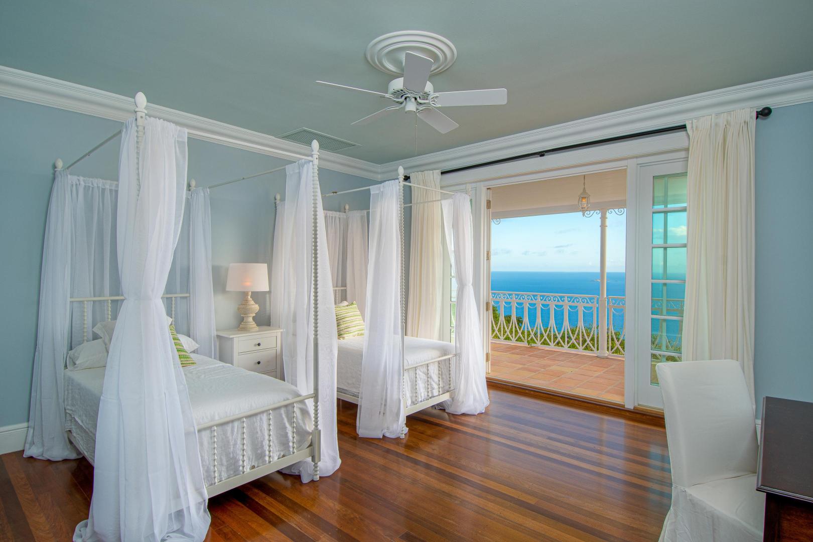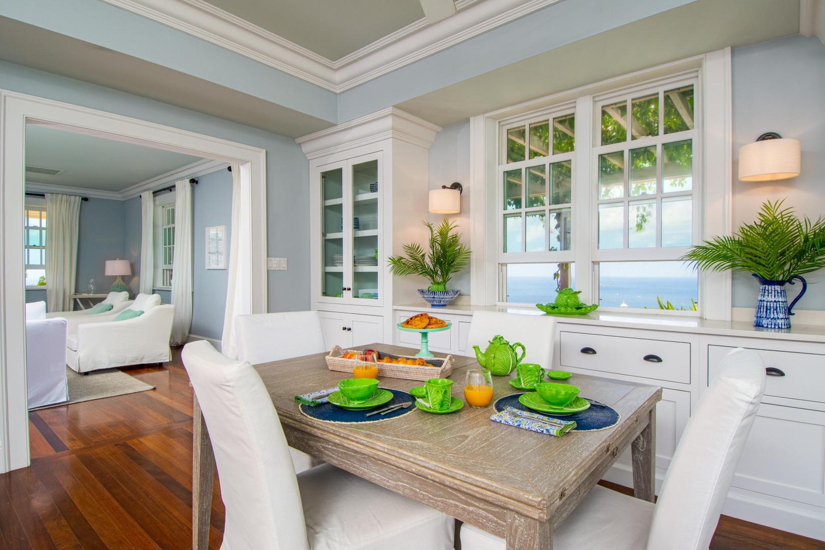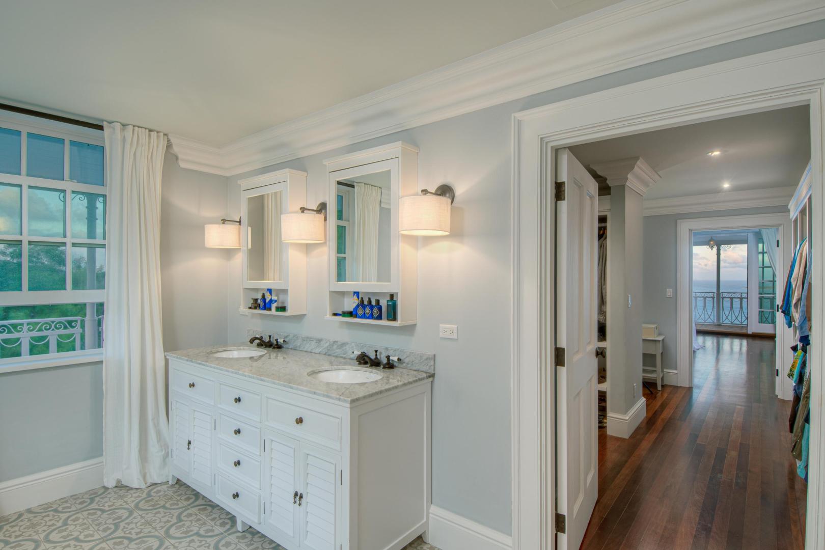 Splendor begins at the entrance to the estate with a long driveway winding through mature gardens that lead to this spectacular home. Once inside, you are greeted by an expansive entrance hall with a double-height ceiling and a sweeping staircase, from which all rooms within the property are accessed. The home has four generous reception rooms—a formal dining room, library, drawing room and sunroom—along with a vast, hand-built kitchen with further dining space. On the second floor, a quartet of generous bedrooms awaits, each with French doors to the stunning wrap-around veranda offering 270-degree views of the Caribbean. All bedrooms have either an ensuite or are adjacent to a bathroom, while the sumptuous primary bedroom has a large separate dressing room and an ensuite with bath and separate shower. Rare, almost entirely flat lawns surround the home, with shady verandas providing abundant space for entertaining and relaxation. The property also features a 60-foot-long, 60,000-gallon salt pool and separate pool house. Further outbuildings house storage space, a backup generator, and a hurricane room.