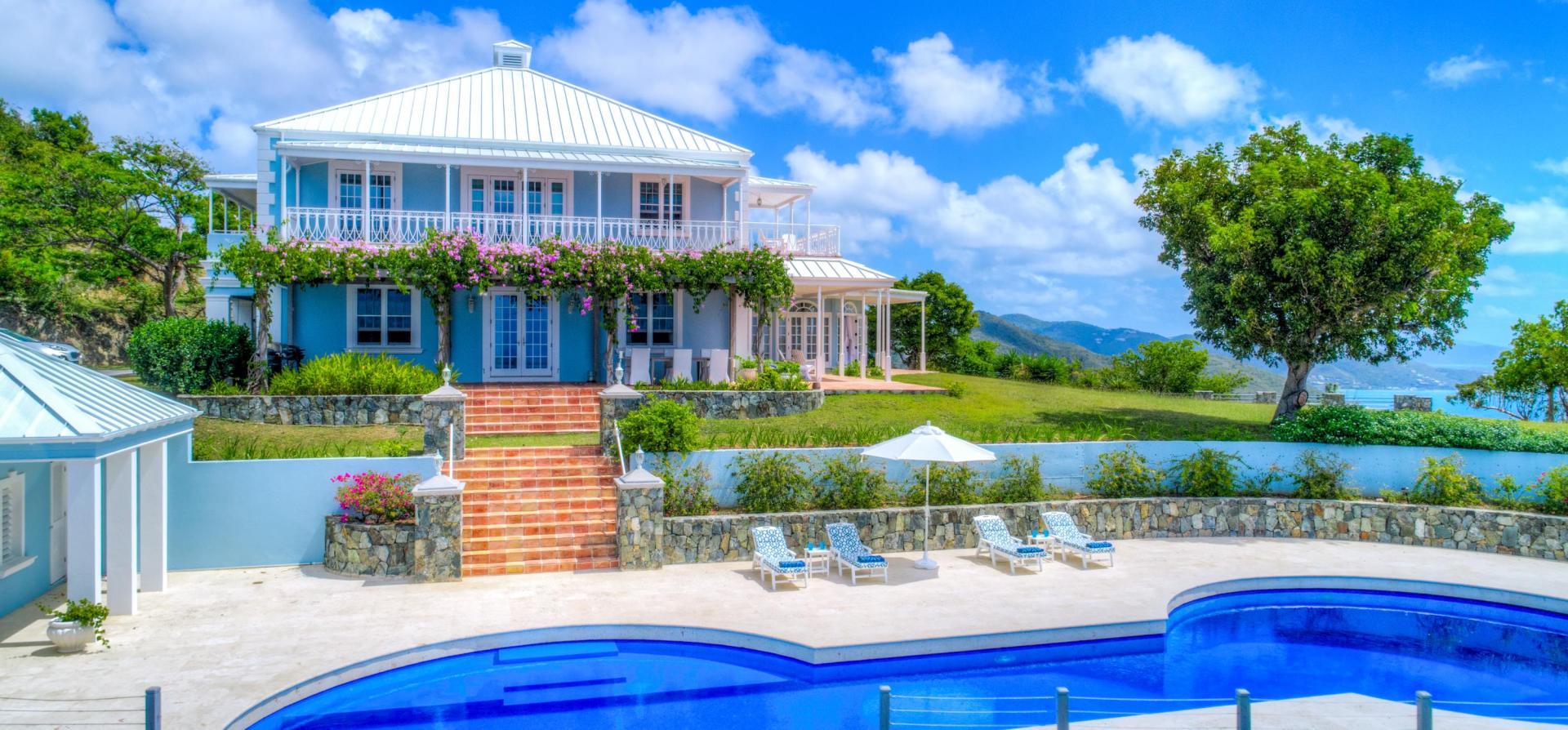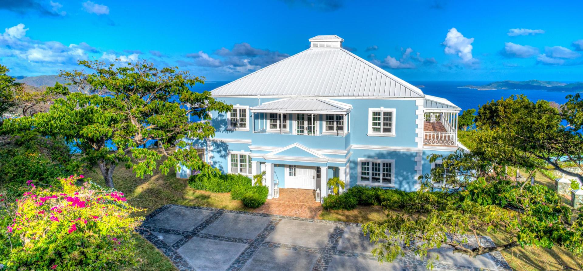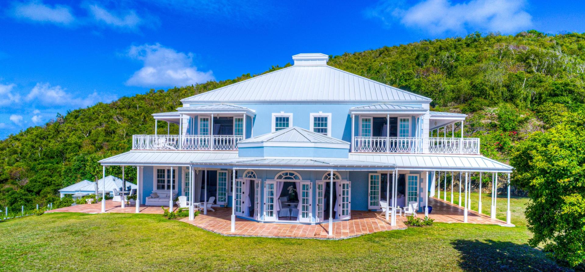 In the quest for the perfect island property, Loblolly has few equals. This elegant and thoroughly modern estate is one of the finest in the British Virgin Islands, its seven acres on Tortola’s south shore showcased by this breathtaking home. The property recently underwent a full renovation, transforming it into an ultra-contemporary retreat that still retains its original architectural designs and features. The powder-blue exterior with white railings and stonework gives this comfortable turnkey property a European feel with a Caribbean sensibility.