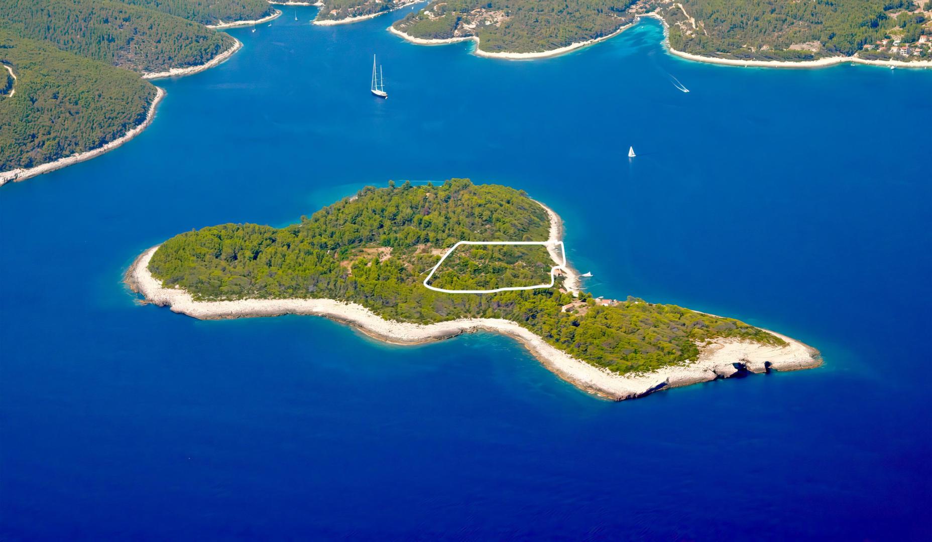 Located on Trstenik (Korčula) Island this private off-the-grid island parcel stretches from the sea inland with 180 degree coastal and sea views. Land position is elevated and level down to the seafront making this property a truly unique and rare find for its location, size of land and possibility of reconstruction on existing ruins.