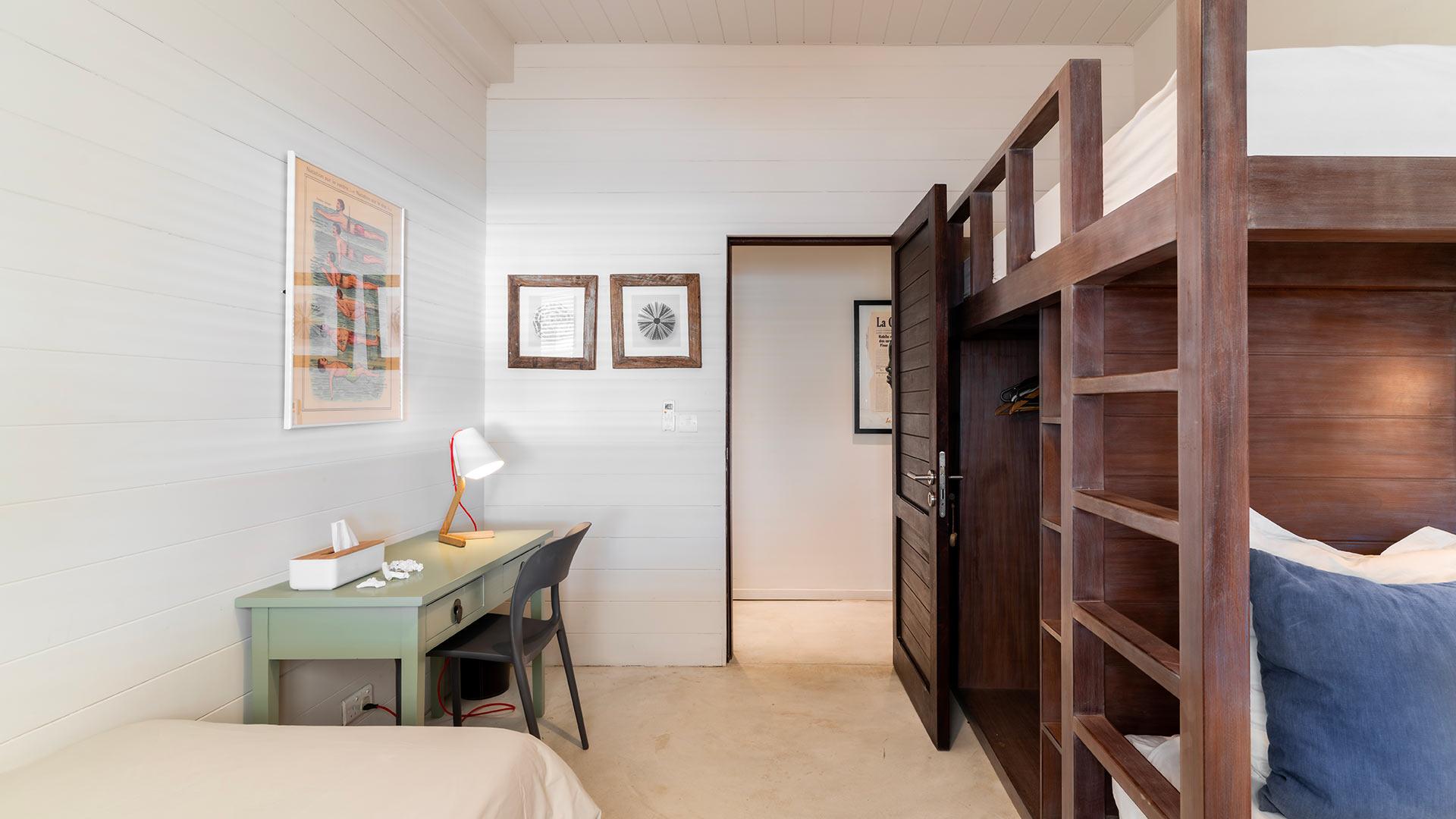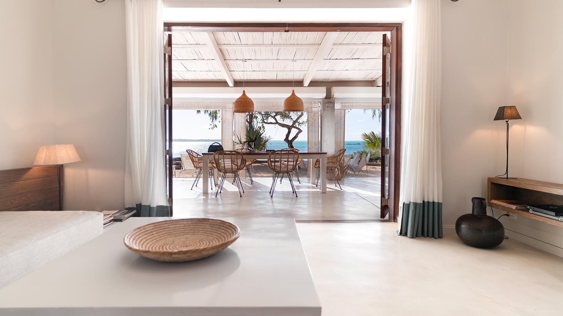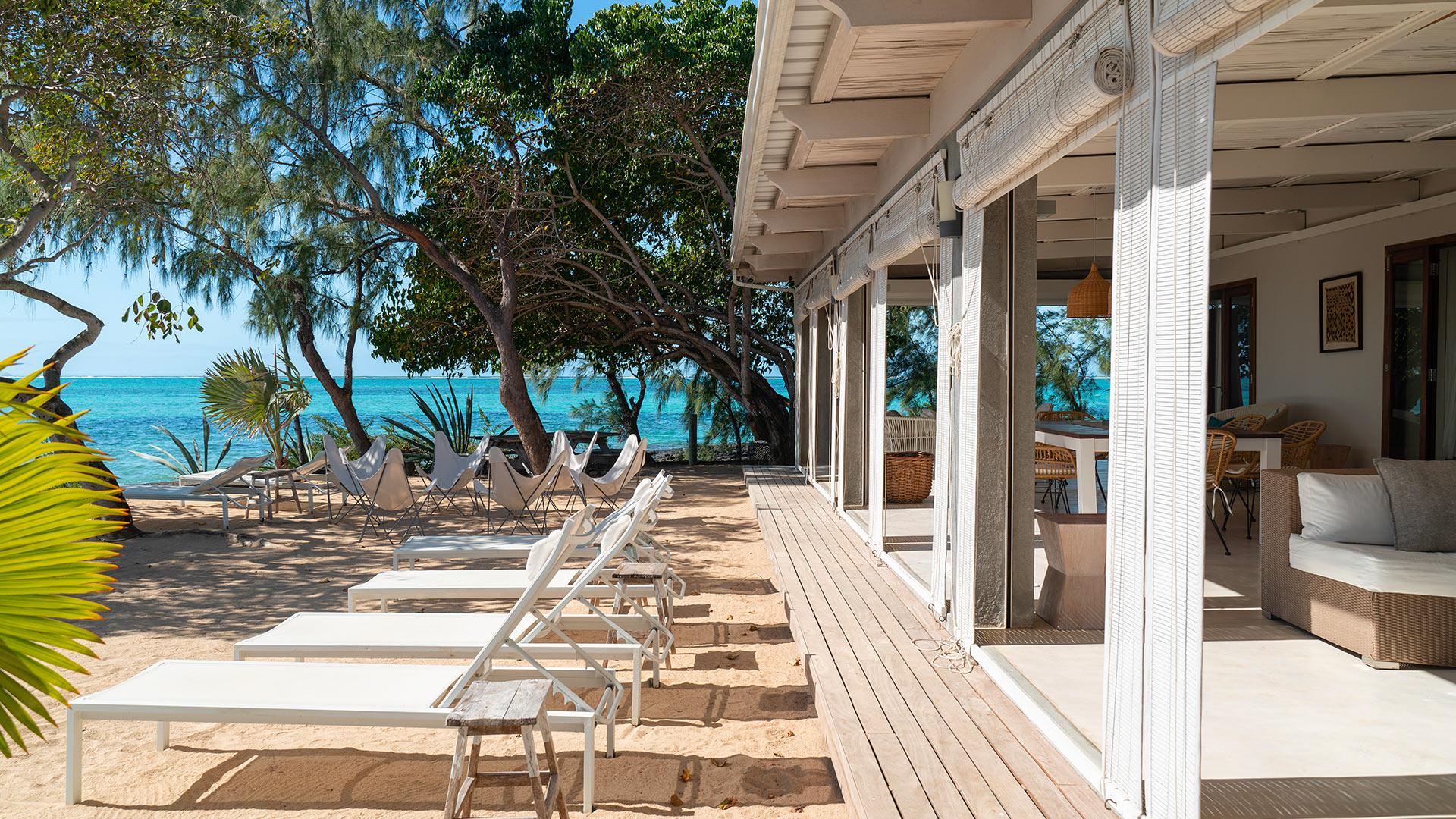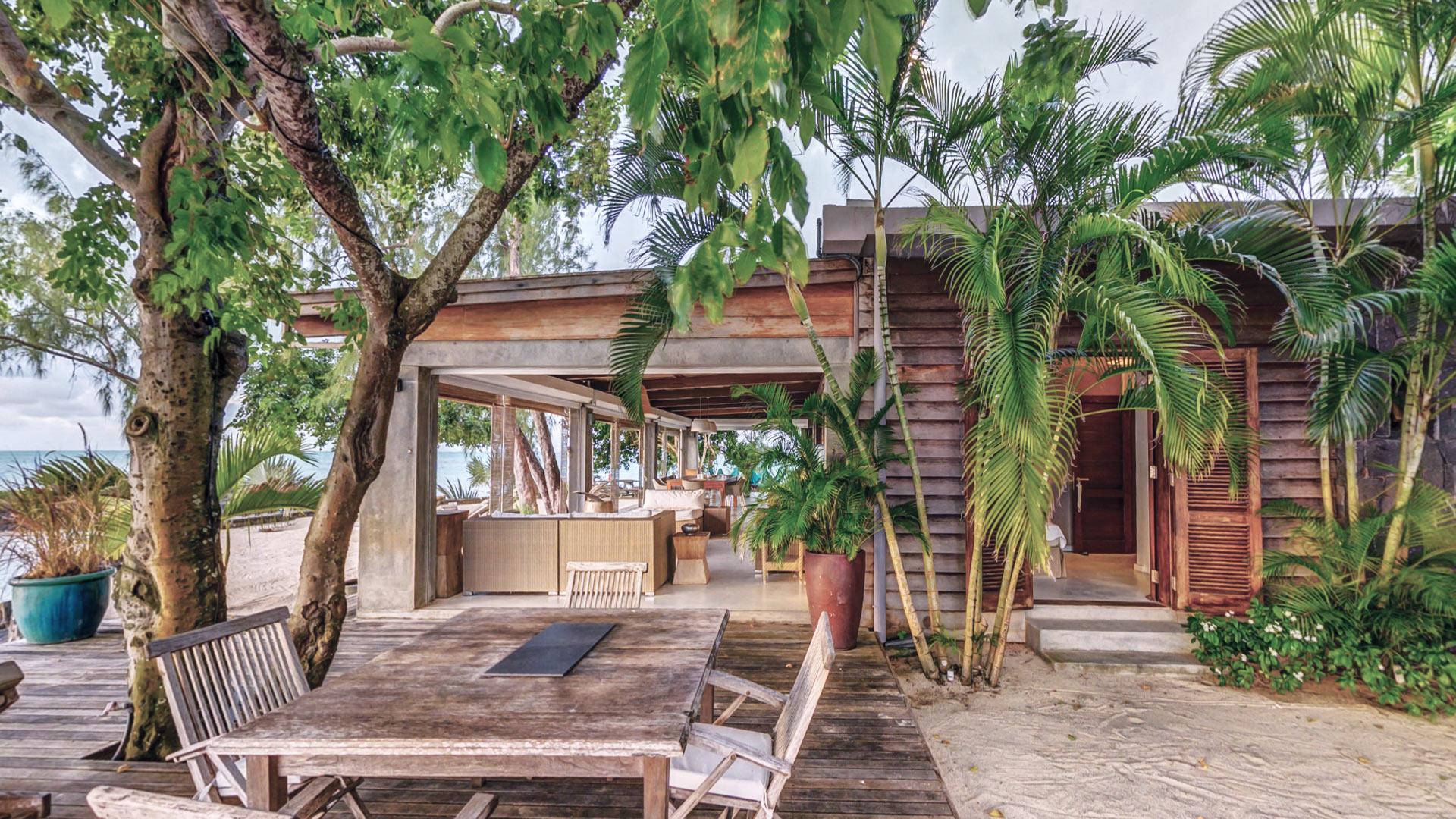 L'Ilot is a rock platform of 3100 m² situated on the lagoon, a 100 m approximately from the coastline. Access is via a rock and wood bridged causeway. Positionned on a sandbed and surrounded by filaos trees, this vast villa of almost 300 m² faces North-West, with its back to prevailing breezes. The building and its interiors are of a refined contemporary style in harmony with the beauty of this unique site: natural building materials, stone, white or weathered wood , raw concrete, inox, natural fabrics, linen, comfortable and adaptable furniture.