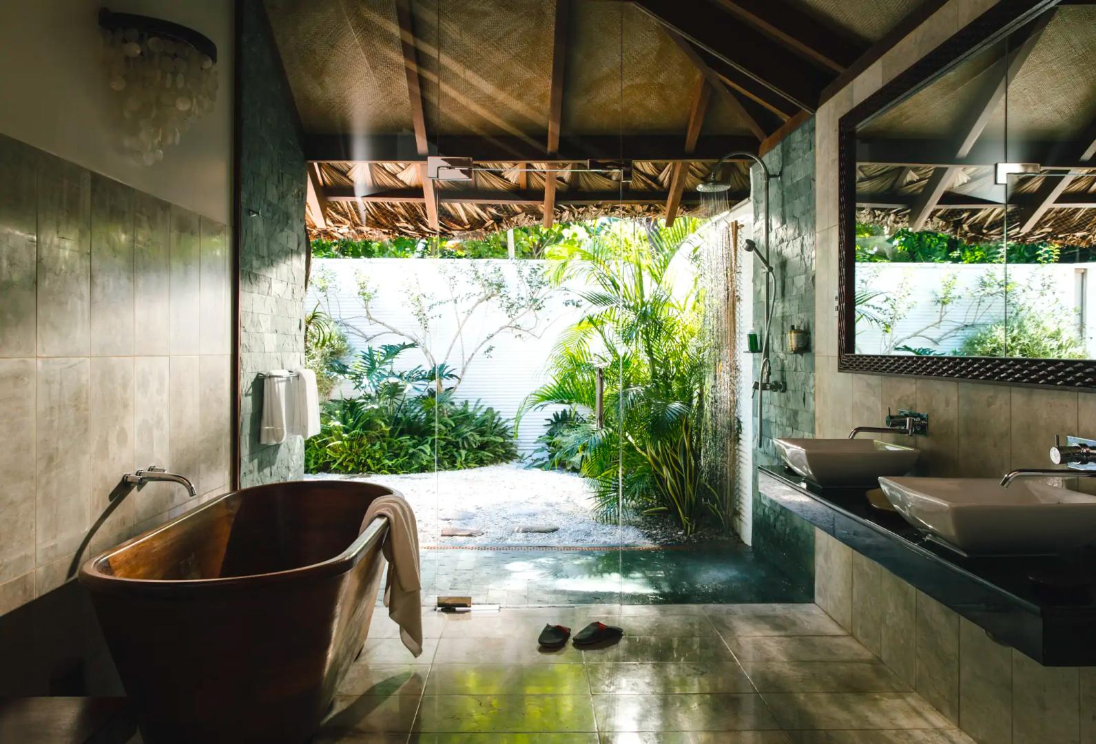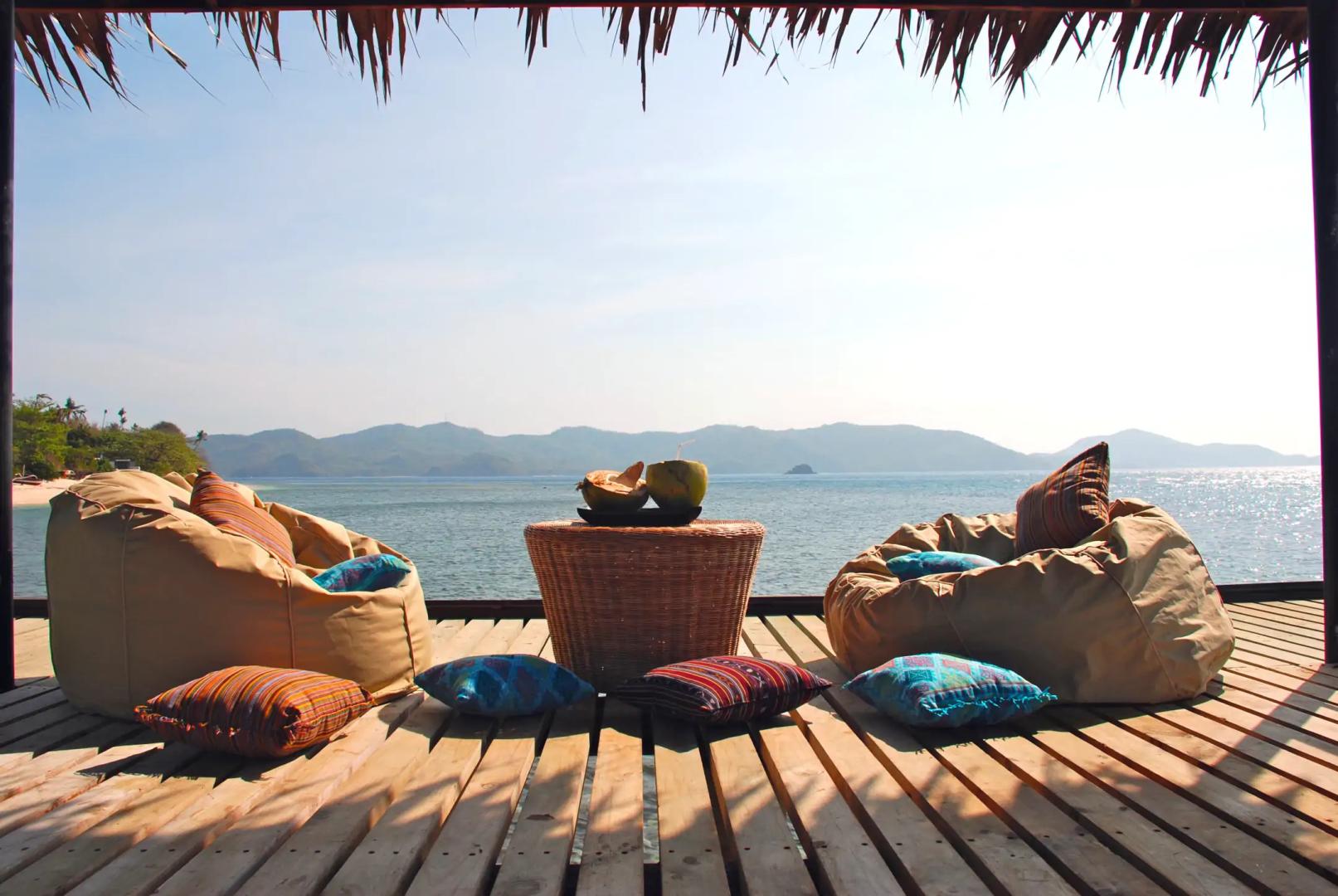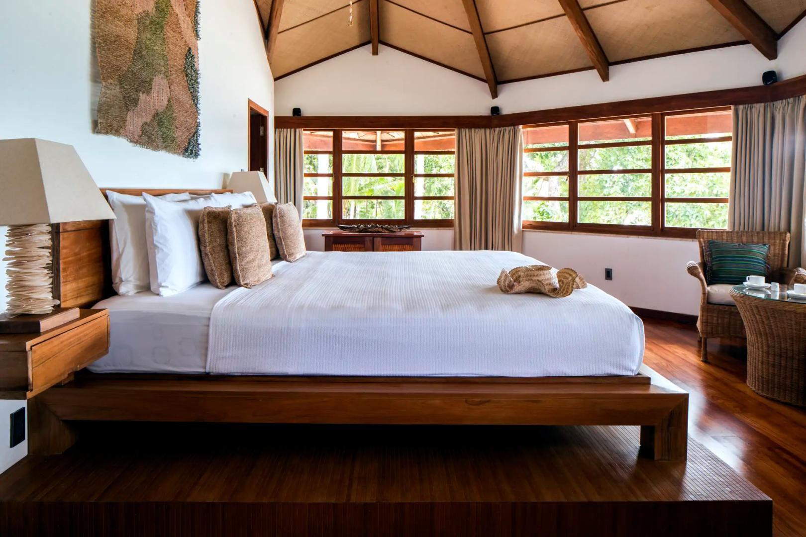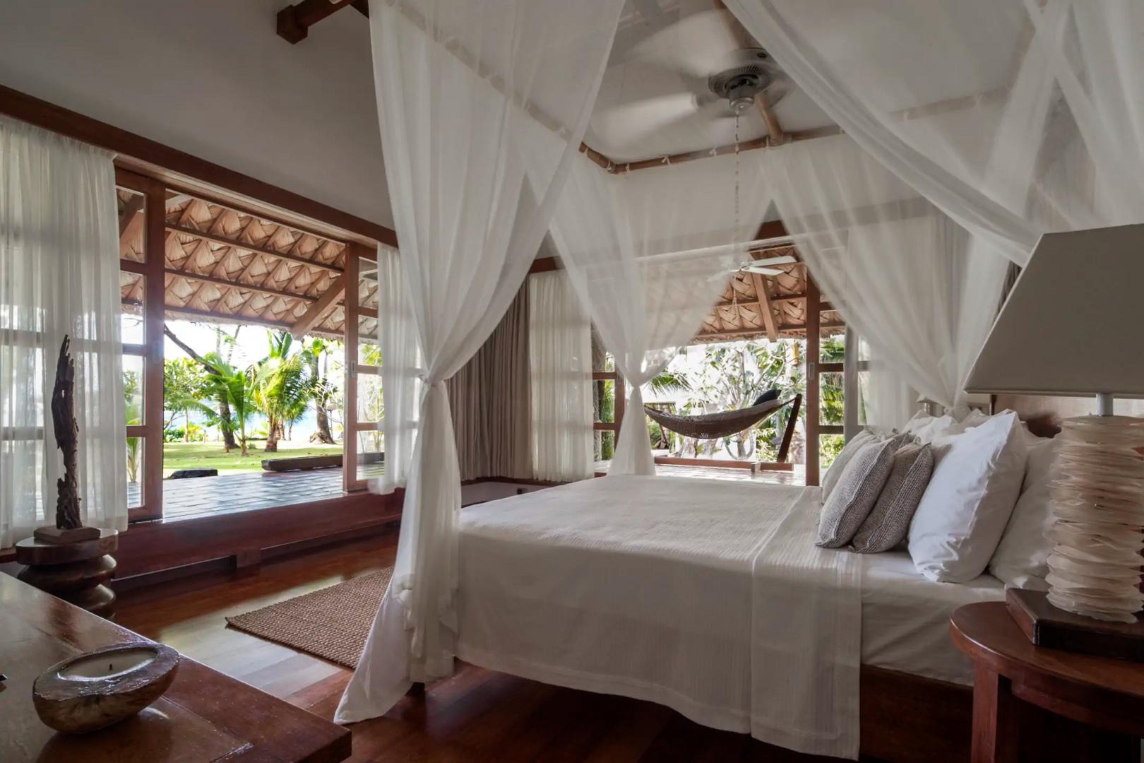 The four beach cottages each have a large bedroom with a vaulted ceiling, a four poster style bed, and a walk-in wardrobe. There is an enormous marble bathroom with either a wooden bath or a marble bath hand carved from a block of Romblon marble, and an open-air shower.