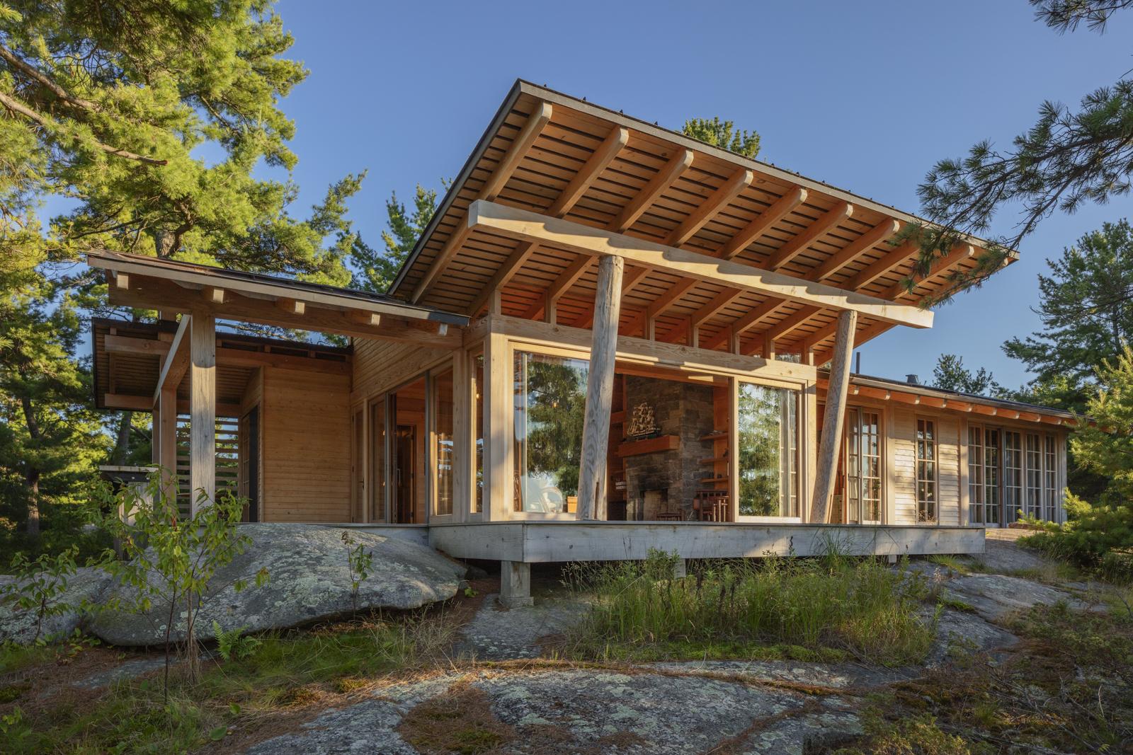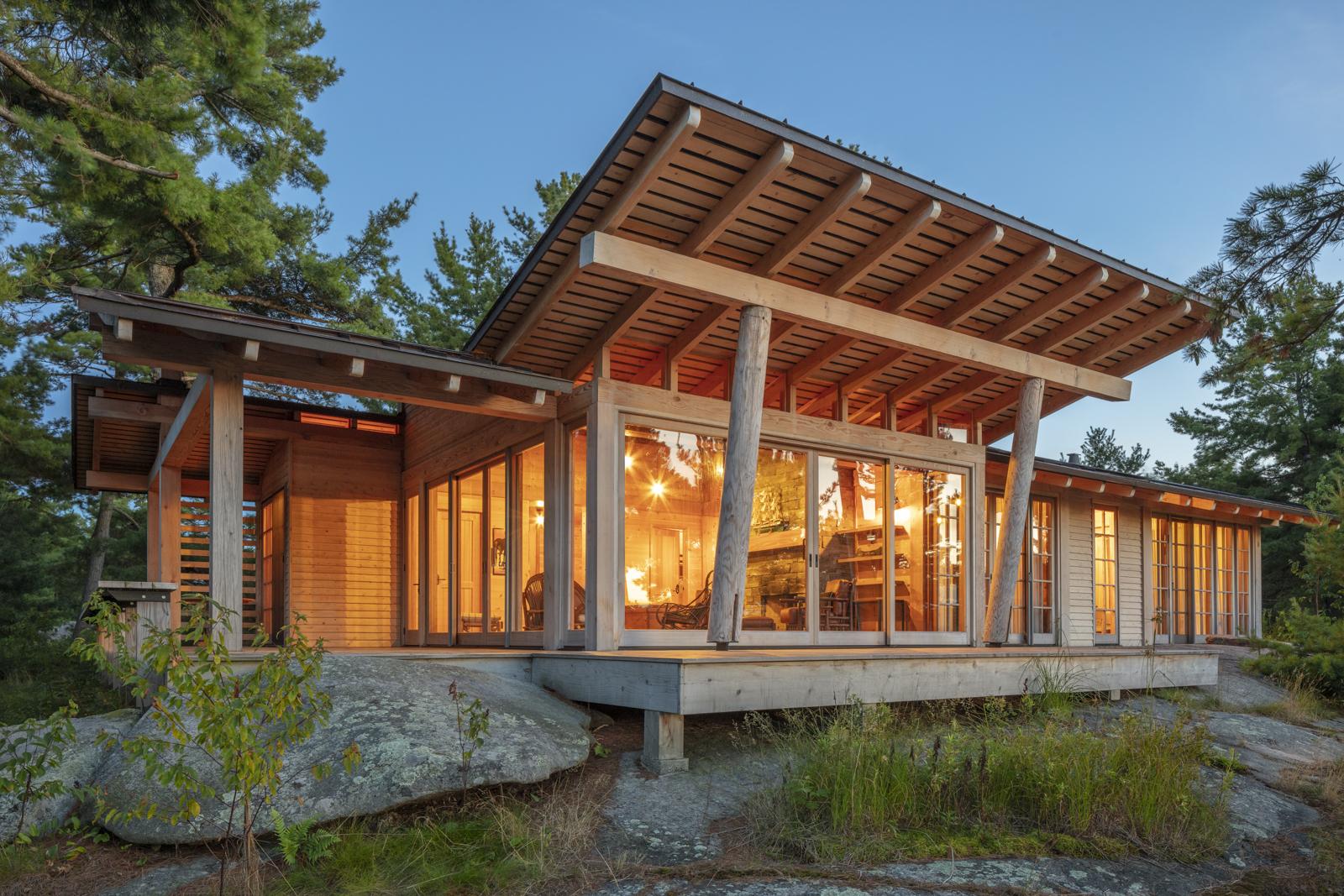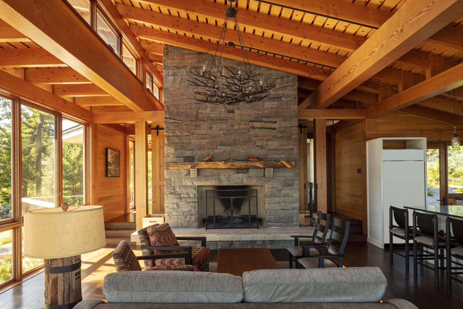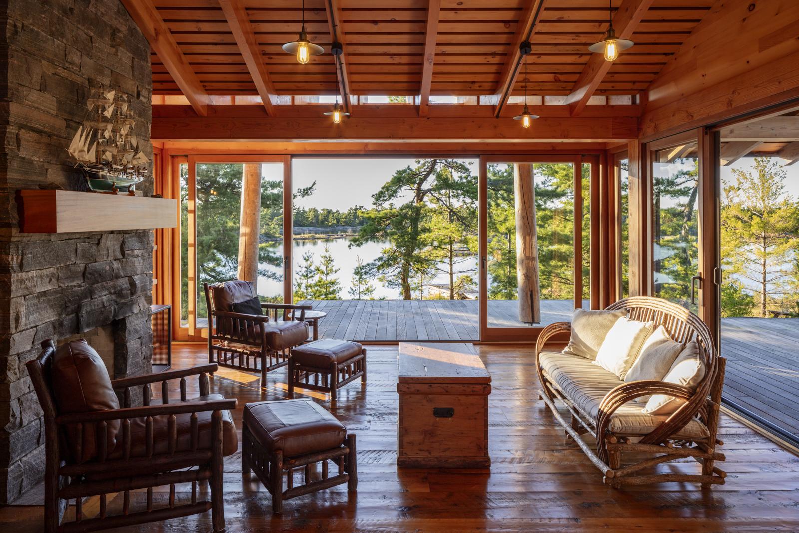 William Dewson of Toronto’s Dewson Architects designed the island’s contemporary post-and-beam cottage to complement the surrounding water and boreal forest of the Canadian Shield. The timber structure is Douglas fir from western Canada and the finishes are locally sourced spruce, birch, maple, pine, and walnut giving the property a warm glow. The central living space cantilevers over Burritt’s Inlet to provide sweeping sunrise and sunset views, as well as southern exposure throughout the day. A massive granite fireplace, its stone mirroring the gray bedrock that forms the island, anchors this area. Sleeping and bathing facilities are tucked away into the trees beyond.