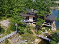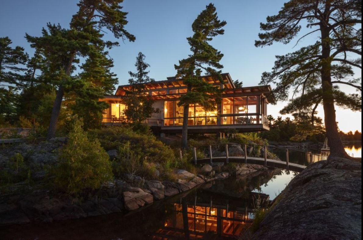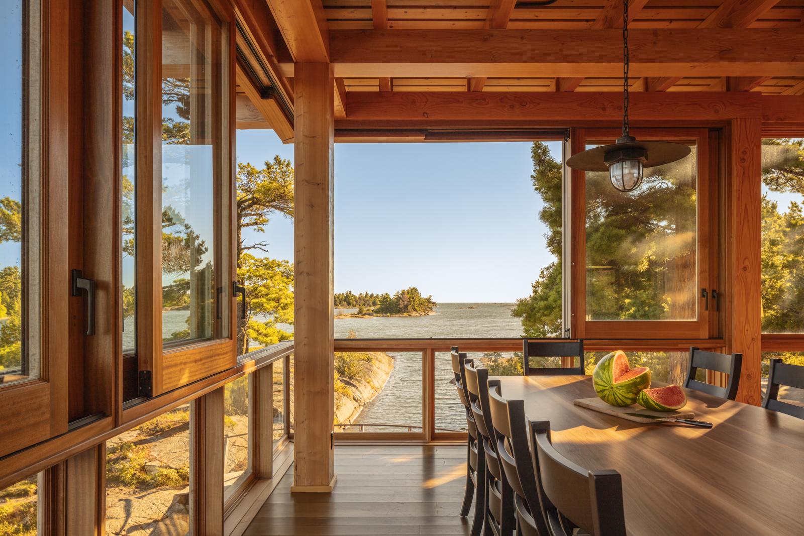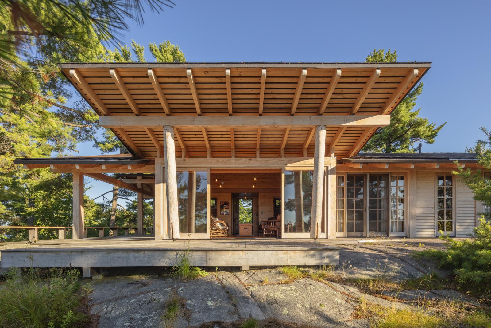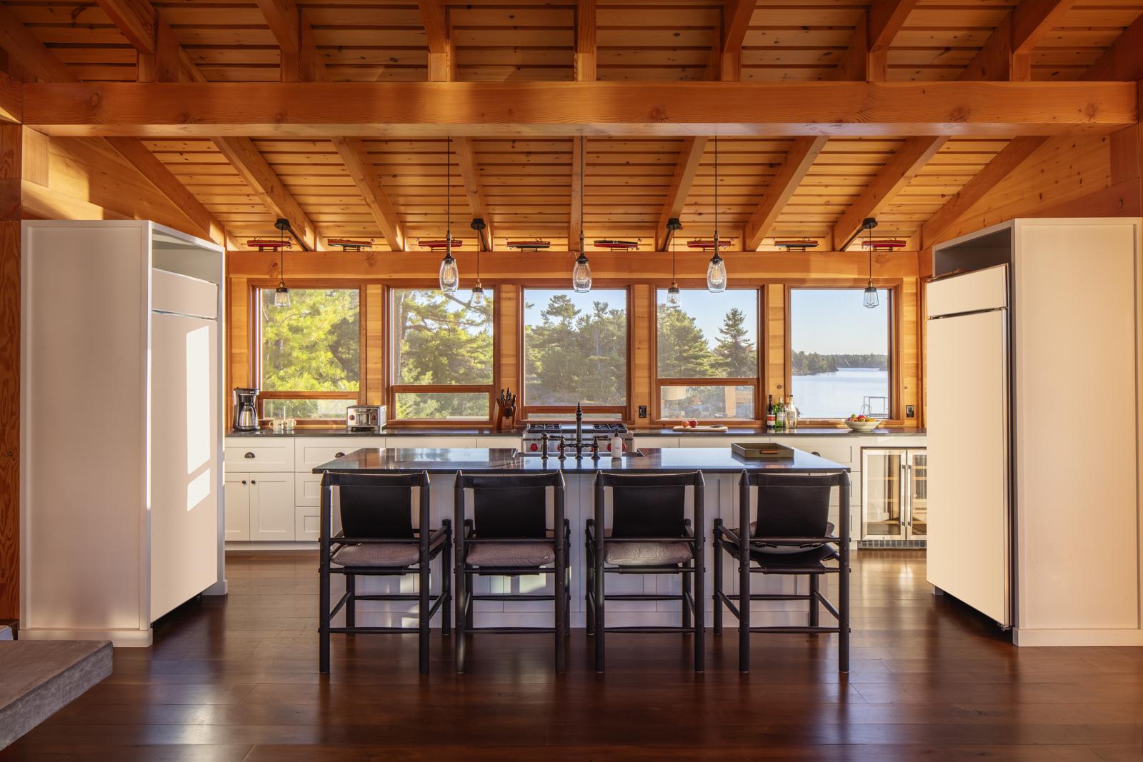 William Dewson of Toronto’s Dewson Architects designed the island’s contemporary post-and-beam cottage to complement the surrounding water and boreal forest of the Canadian Shield. The timber structure is Douglas fir from western Canada and the finishes are locally sourced spruce, birch, maple, pine, and walnut giving the property a warm glow. The central living space cantilevers over Burritt’s Inlet to provide sweeping sunrise and sunset views, as well as southern exposure throughout the day. A massive granite fireplace, its stone mirroring the gray bedrock that forms the island, anchors this area. Sleeping and bathing facilities are tucked away into the trees beyond.