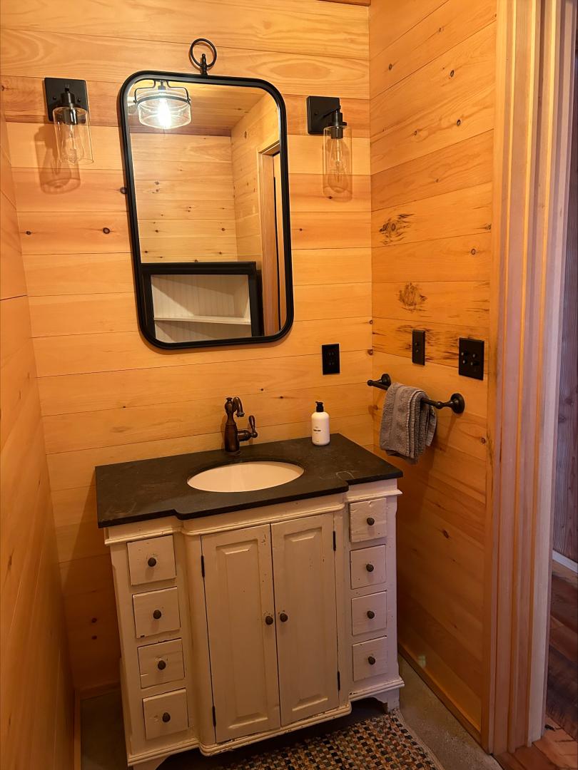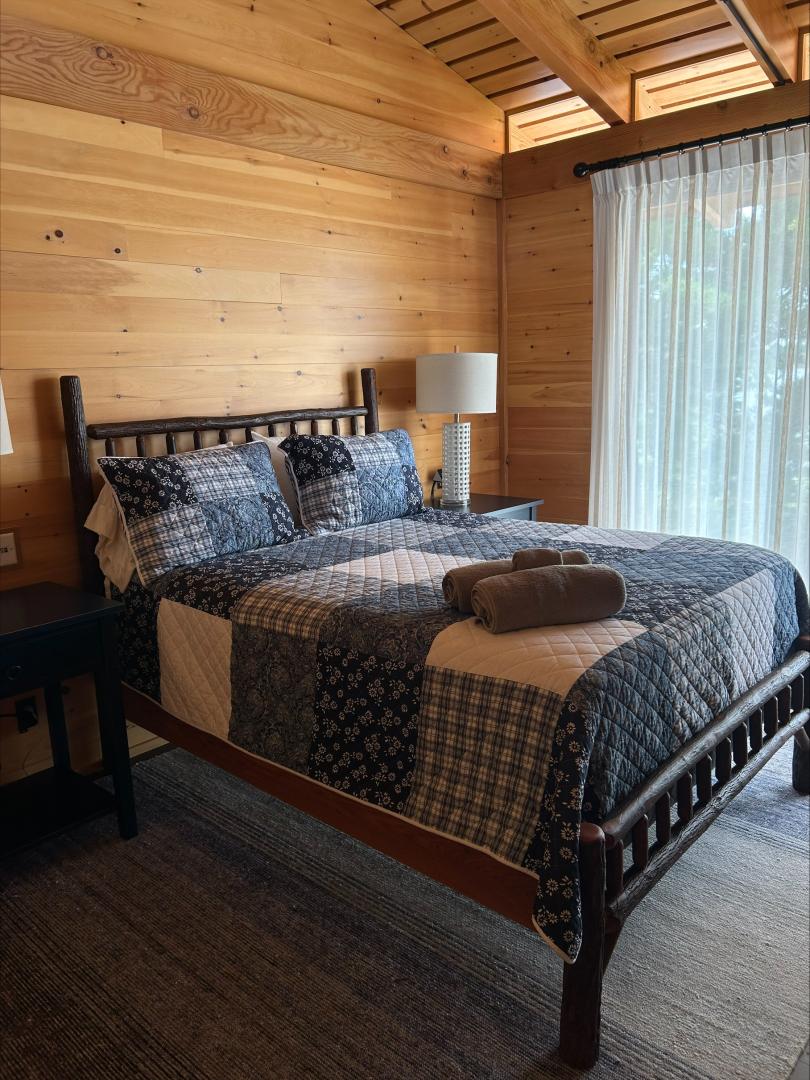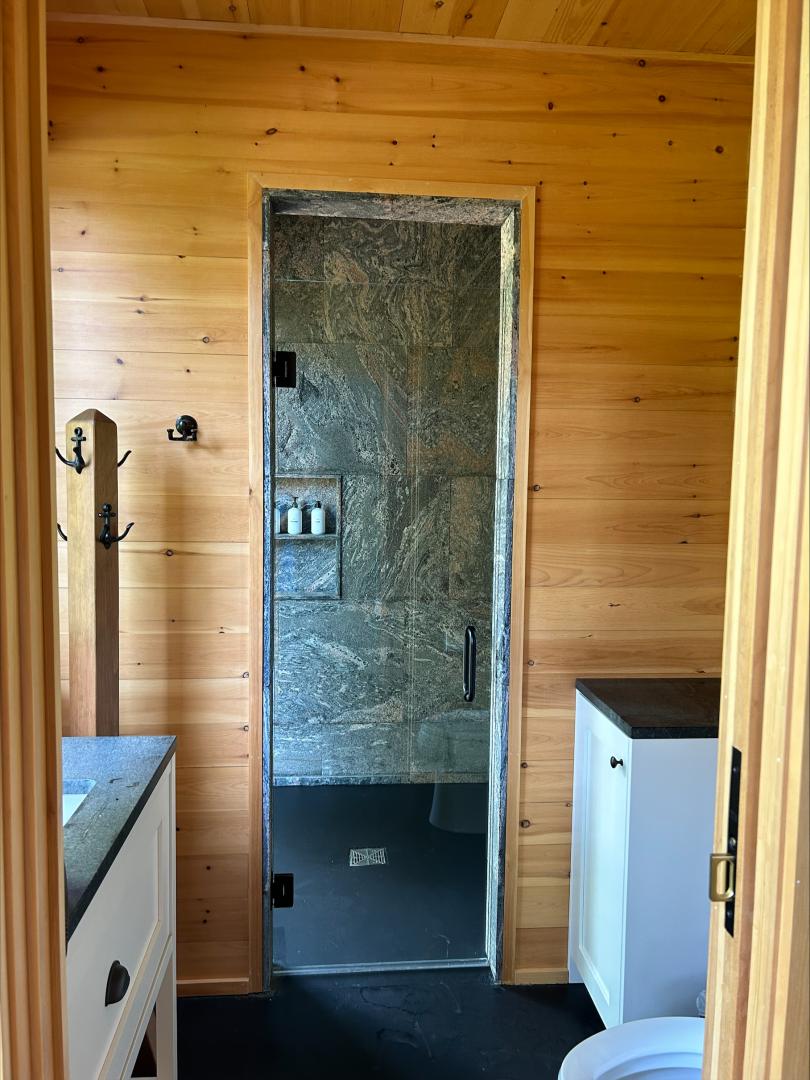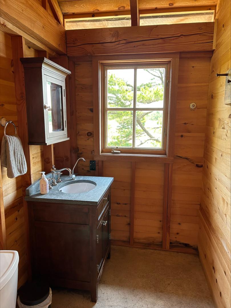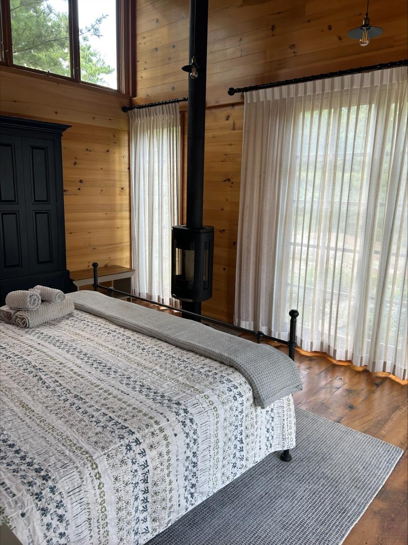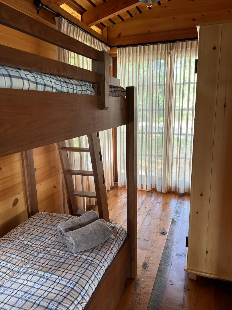 William Dewson of Toronto’s Dewson Architects designed the island’s contemporary post-and-beam cottage to complement the surrounding water and boreal forest of the Canadian Shield. The timber structure is Douglas fir from western Canada and the finishes are locally sourced spruce, birch, maple, pine, and walnut giving the property a warm glow. The central living space cantilevers over Burritt’s Inlet to provide sweeping sunrise and sunset views, as well as southern exposure throughout the day. A massive granite fireplace, its stone mirroring the gray bedrock that forms the island, anchors this area. Sleeping and bathing facilities are tucked away into the trees beyond.