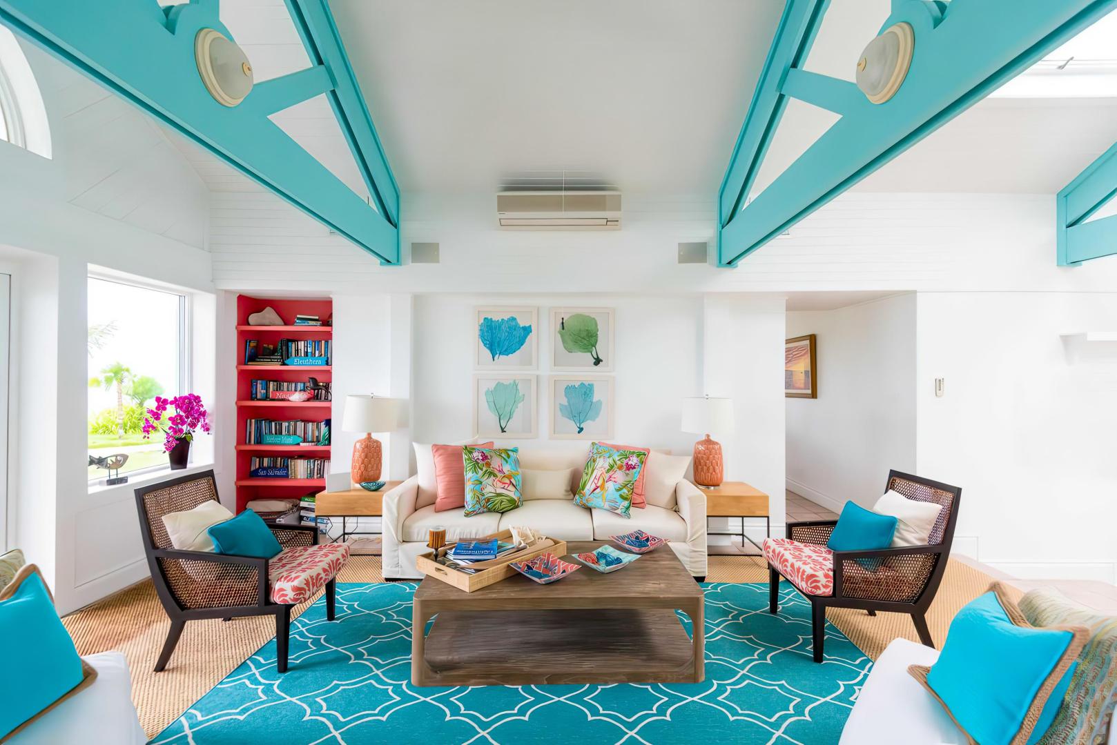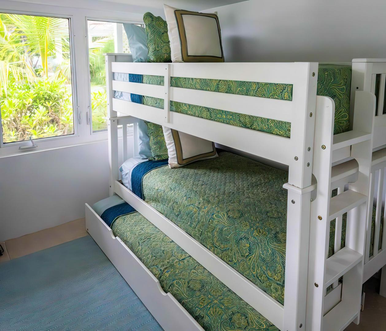 The Main House has four bedrooms and the Cottage has three bedrooms. In the Main House, there’s a spacious master suite with a king bed, three walls of ocean views, a private patio, a lounge, and an ensuite bathroom. The second suite has two double beds, a window seat, and an ensuite bathroom. The third suite has two twin beds, ocean views, and a hall bath. The fourth suite has a king bed and an ensuite bathroom. In the Cottage, there’s a king suite with exterior access, ocean views, and an ensuite bathroom. The second suite has two double beds, exterior access, and an ensuite bathroom. The third suite is ideal for children, with a twin bunk, trundle bed, and a half bath in the hall. Daily housekeeping is provided.
