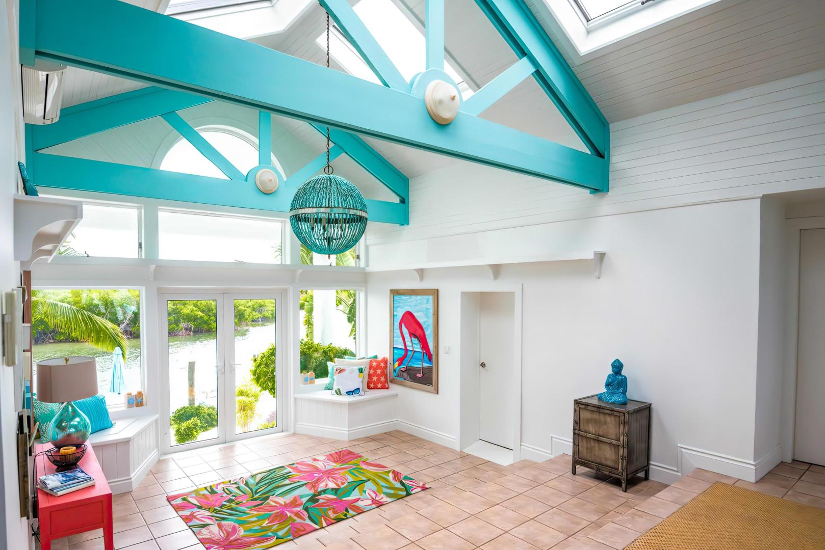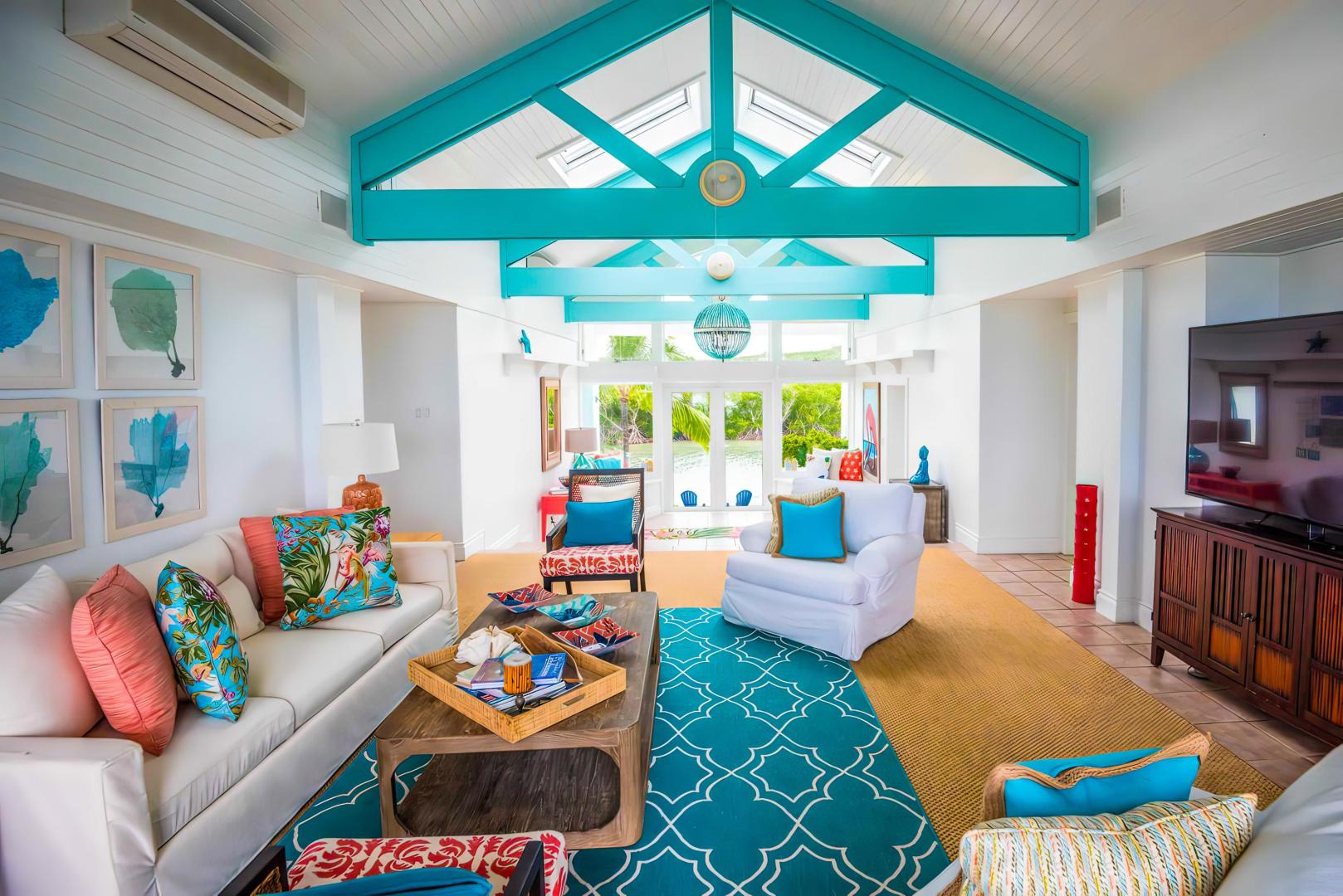 Middle Cay has two homes, and both have WiFi and air-conditioning. The Main House has an open kitchen and dining space with stainless steel appliances, granite countertops, and a dining table that seats 8. Its living room has a flatscreen cable TV and opens to a private patio. Outside, there’s a heated pool and an outdoor shower. In the Cottage, there’s a common area with beautiful, exposed wooden beams and tile floors. The living room has plush furnishings and a flatscreen cable TV, and there’s dining at the bar and main table. It opens to the patio and has three walls of windows that reveal ocean views. The kitchen has stainless steel appliances, a coffeemaker, and a mixer.
