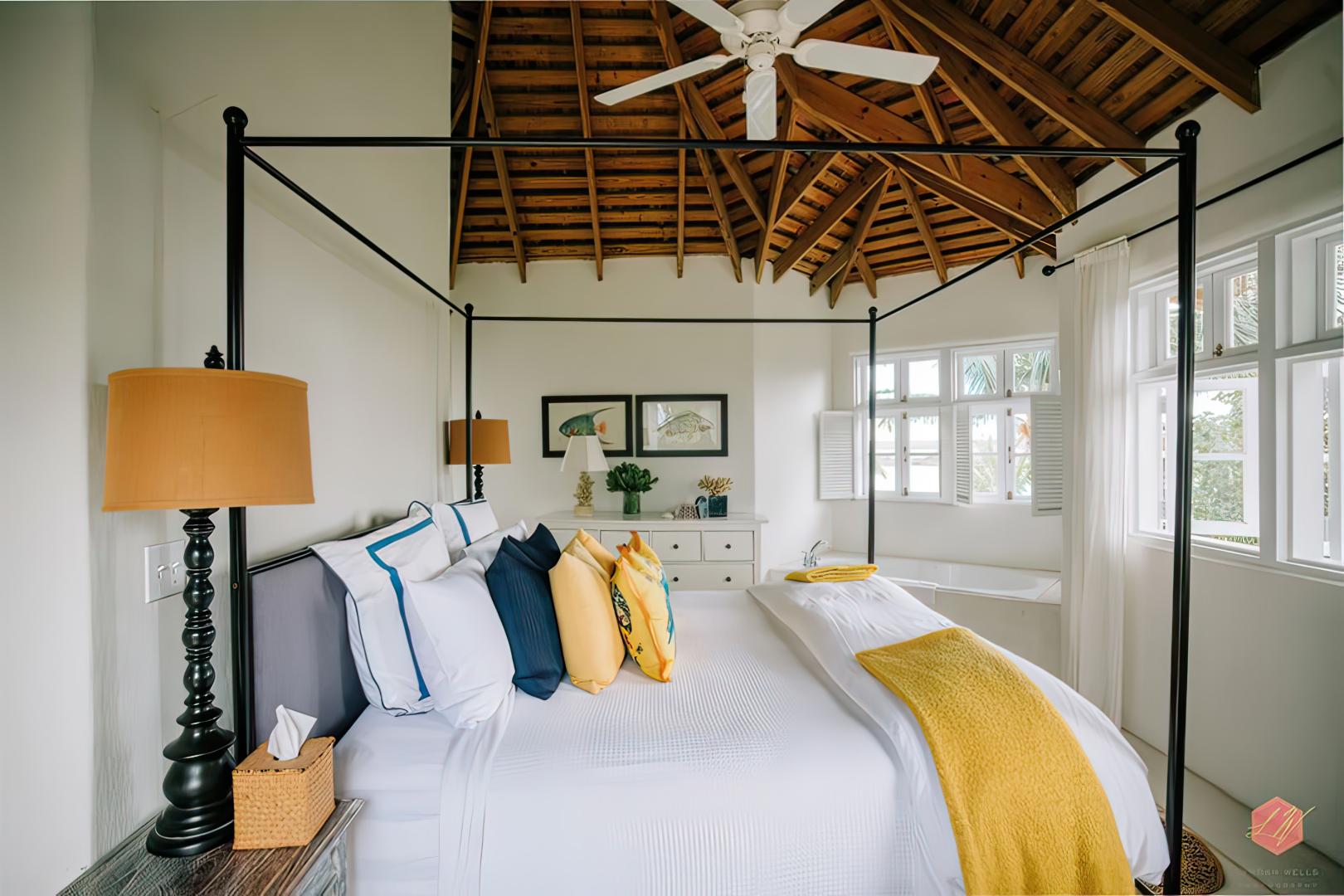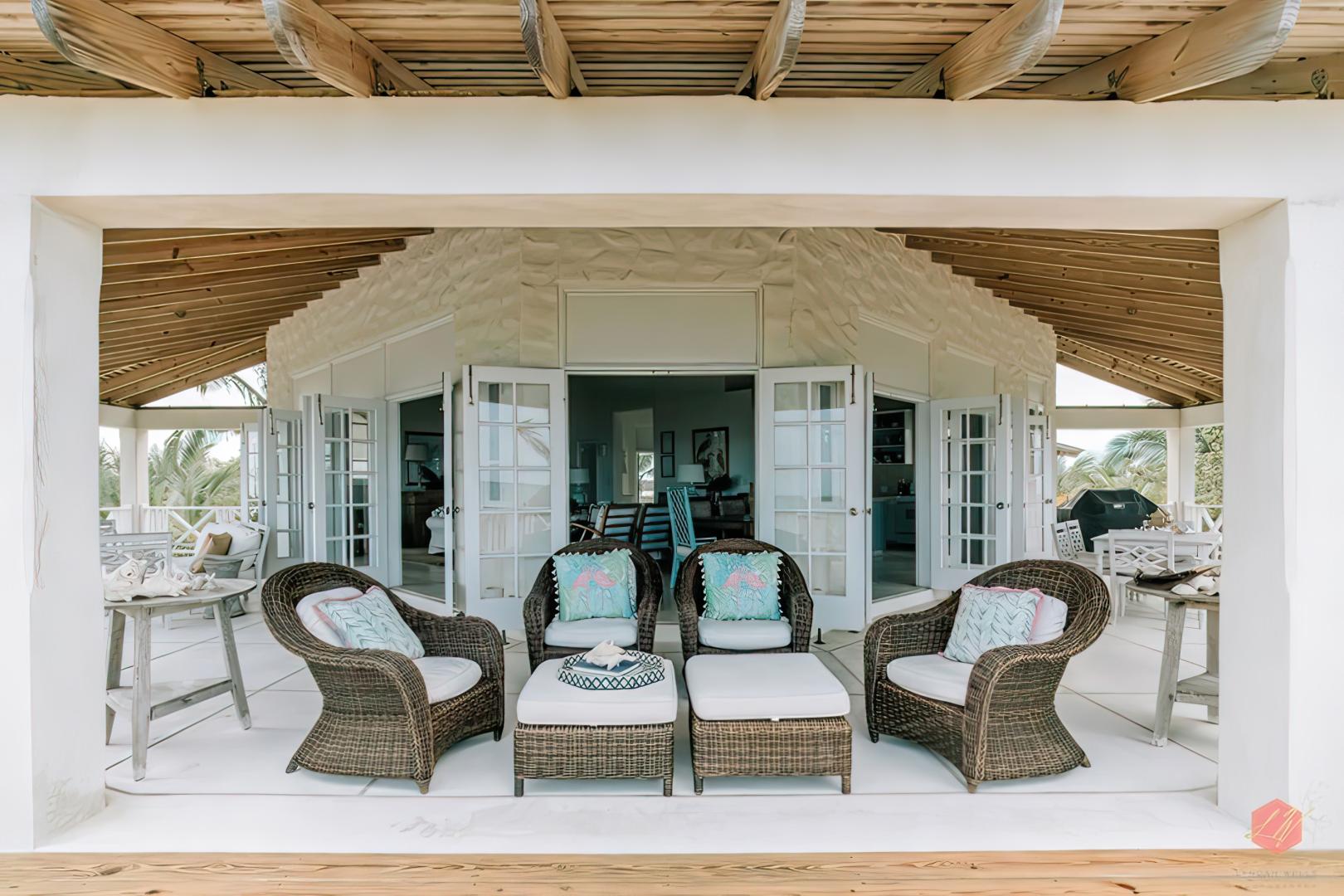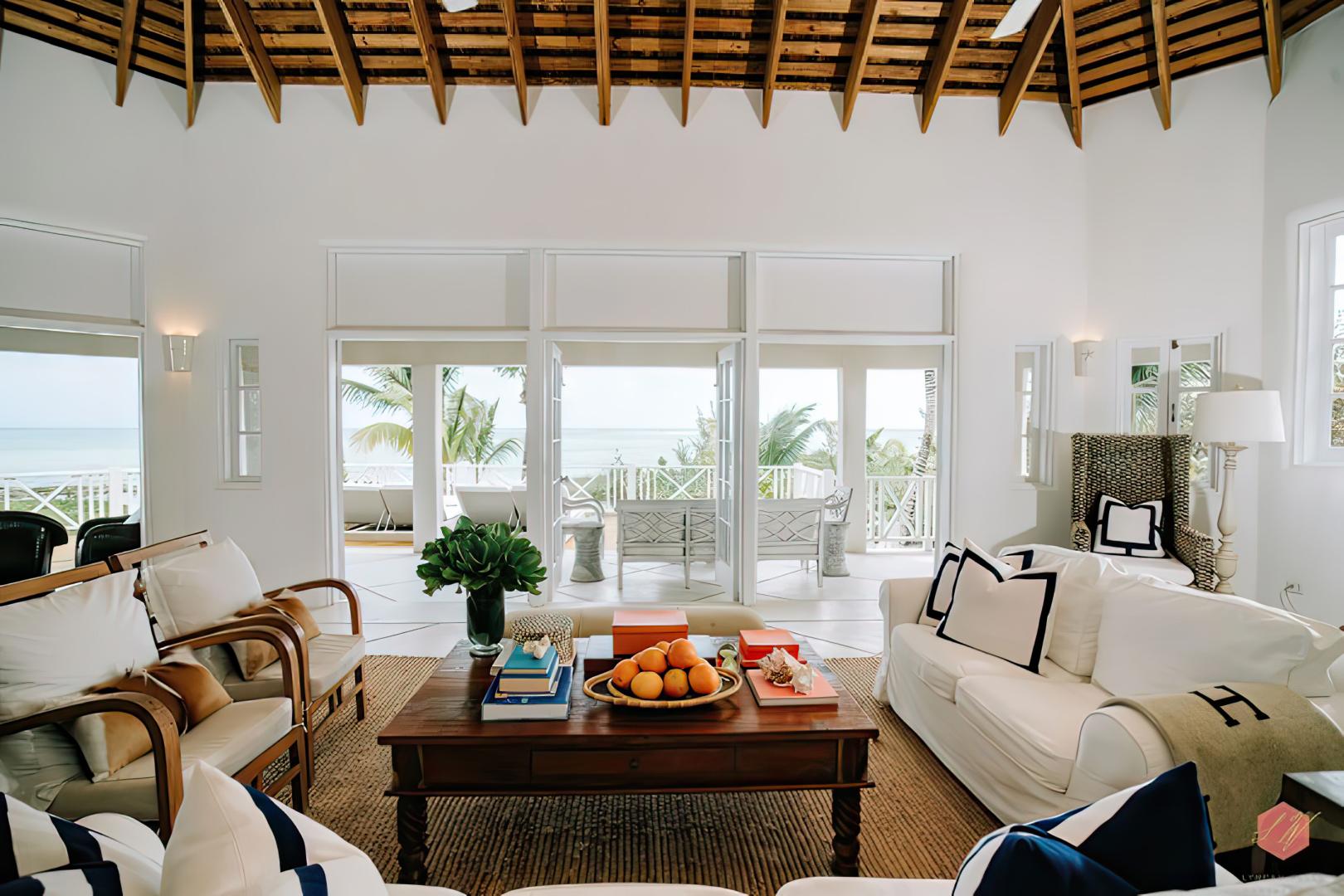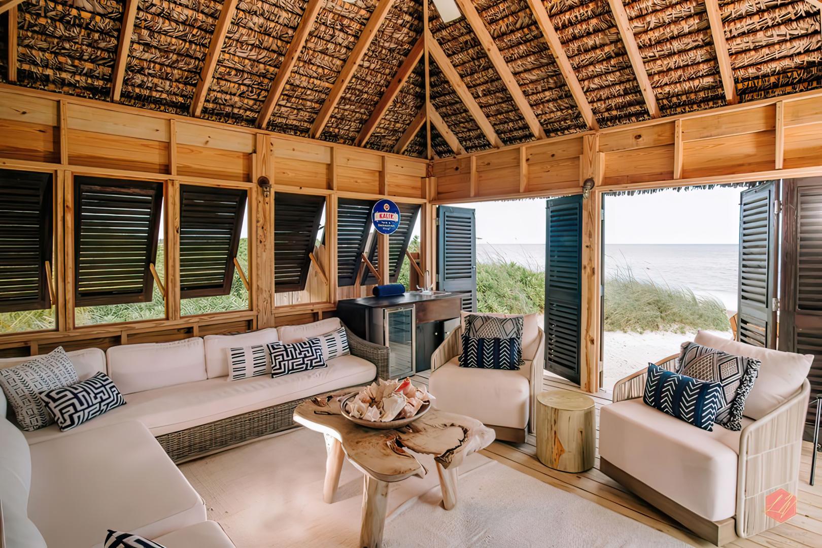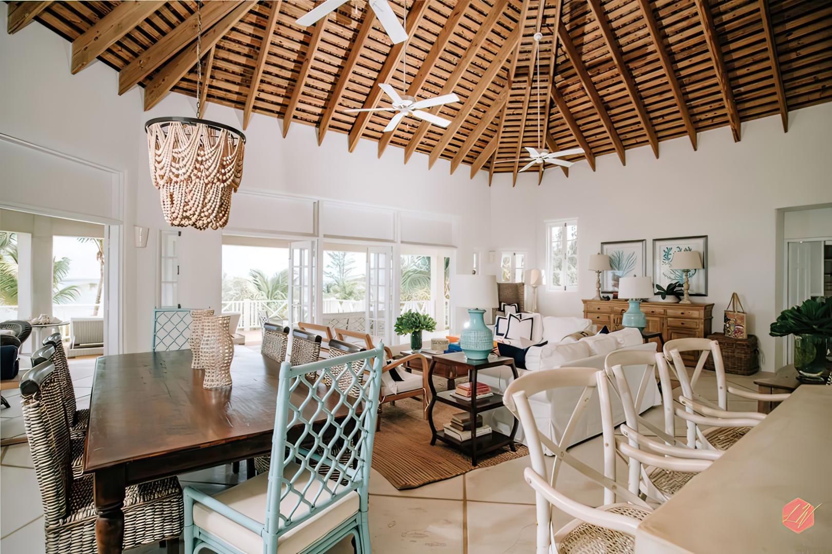 Uniquely unfazed, the Hews purchased the Cay in 1994, named it for its red bark trees, and set about bringing the basics—electricity, plumbing, water—over from Andros. Jennifer designing the beach houses while Brian oversaw building crews, introducing thousands of palm trees, they layered the landscape with hibiscus and bougainvillea, frangipani and ginger-lily. Transforming their newly christened Kamalame Cay from scrub grass and sand into a flowering tropical jungle scattered with a collection of classic West Indies cottages, villas, and bungalows.