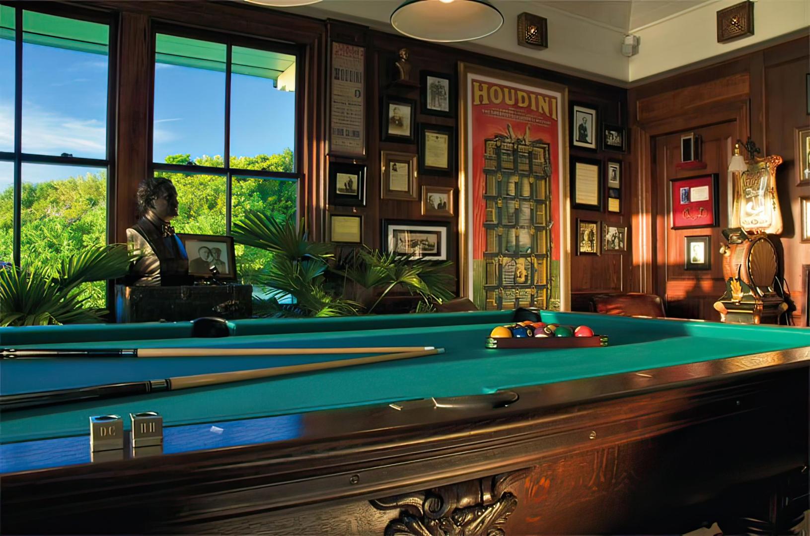 Some of the amenities available to guests include a free-form pool, tennis court, indoor/outdoor beachfront bars, a bathhouse and massage room at the beach, 2.5 miles (4 km) of jogging paths, the use of golf carts and bicycles, and the use of the conference centre. The hub of island life is The Landings, providing central dining, satellite TV, lounge, meeting area, and a billiard room overlooking the ocean. Activities on Musha Cay include snorkelling, jet skiing, fishing, water skiing, windsurfing, sailing and tennis.