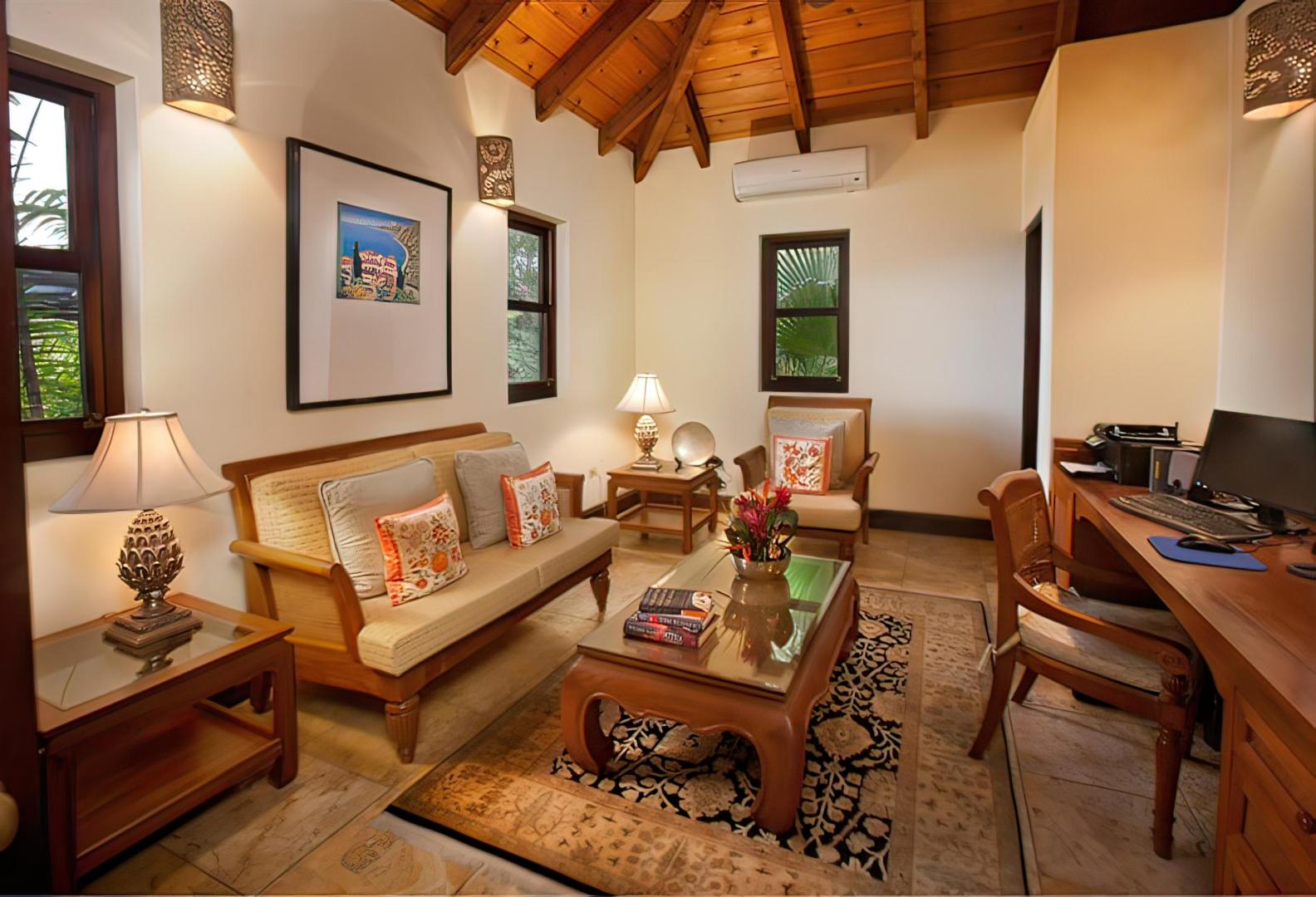 All suites are furnished with custom-crafted solid teak furniture, cushions and luxury cottons. Hand-assembled native stone, honey-colored French limestone and lavender marble give each suite an elegant, timeless aura. French doors allow each pavilion to open completely to the sea breezes.