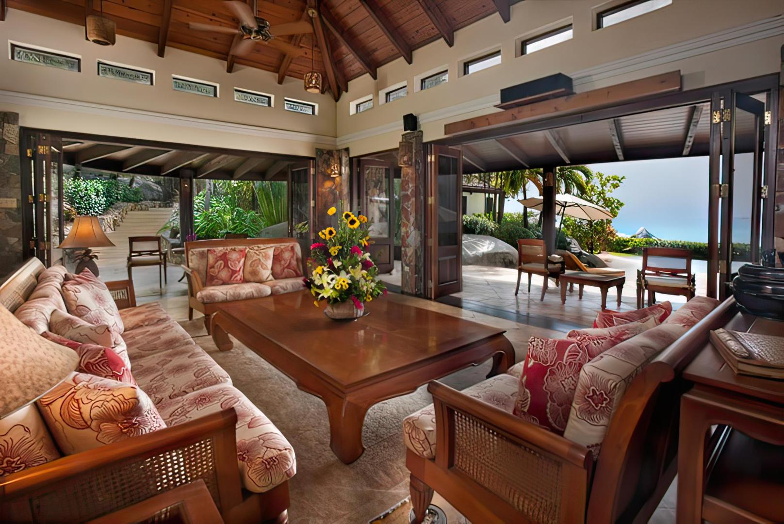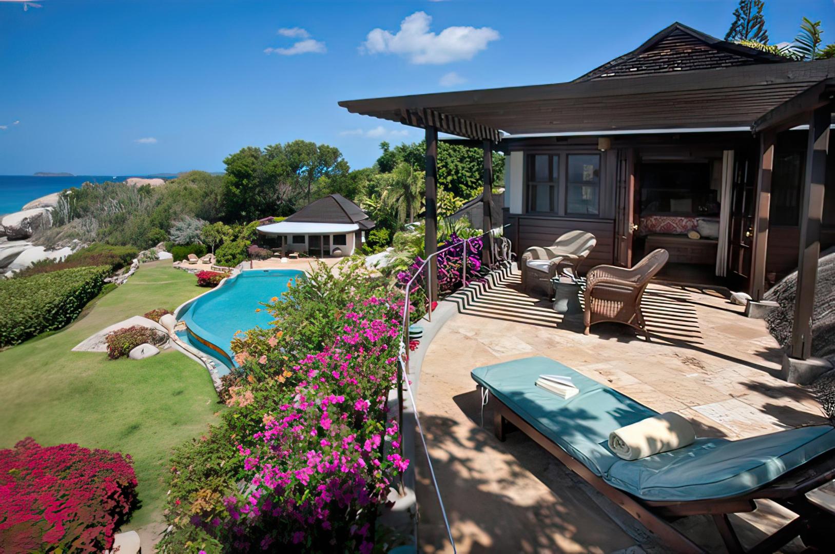 The Sugar Mill houses two suites, with separate entrances. The lower suite adjoins the 30-foot long vanishing-edge pool, with an oversized bath and walk-in closet and dressing area. Two single beds furnish this suite designed particularly with children or young adults in mind. The single beds can be converted to a king bed upon request. This pavilion is closest to the marble stairs that lead down to the beach.The upper Sugar Mill suite is a dramatic adult retreat, with one of the most spectacular views in the Caribbean. The outdoor terraces rest on a two-story boulder, offering a panorama of neighboring islands and cays.