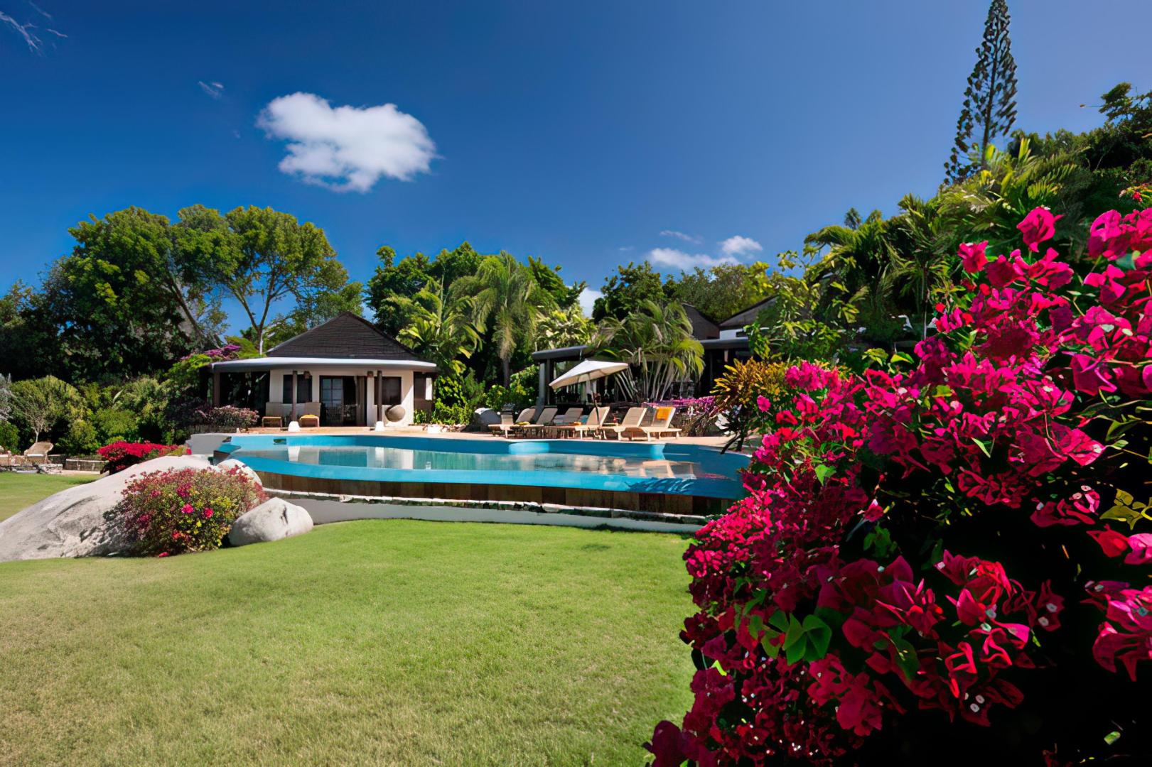 Sol y Sombra's vanishing edge swimming pool melts into the Caribbean a few feet from a seaside lawn. Sol y Sombra is a secluded tropical paradise with exotic palms, cactus, sea grape and bougainvillea on its more than an acre of gardens.
