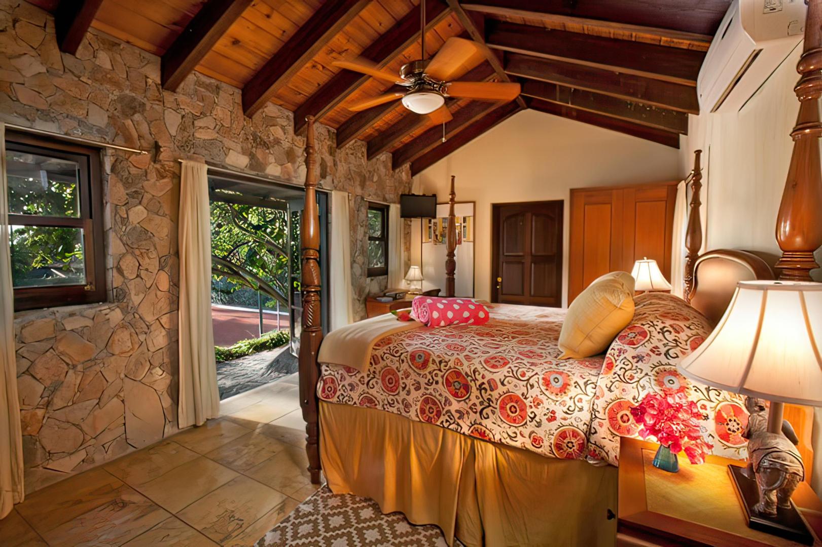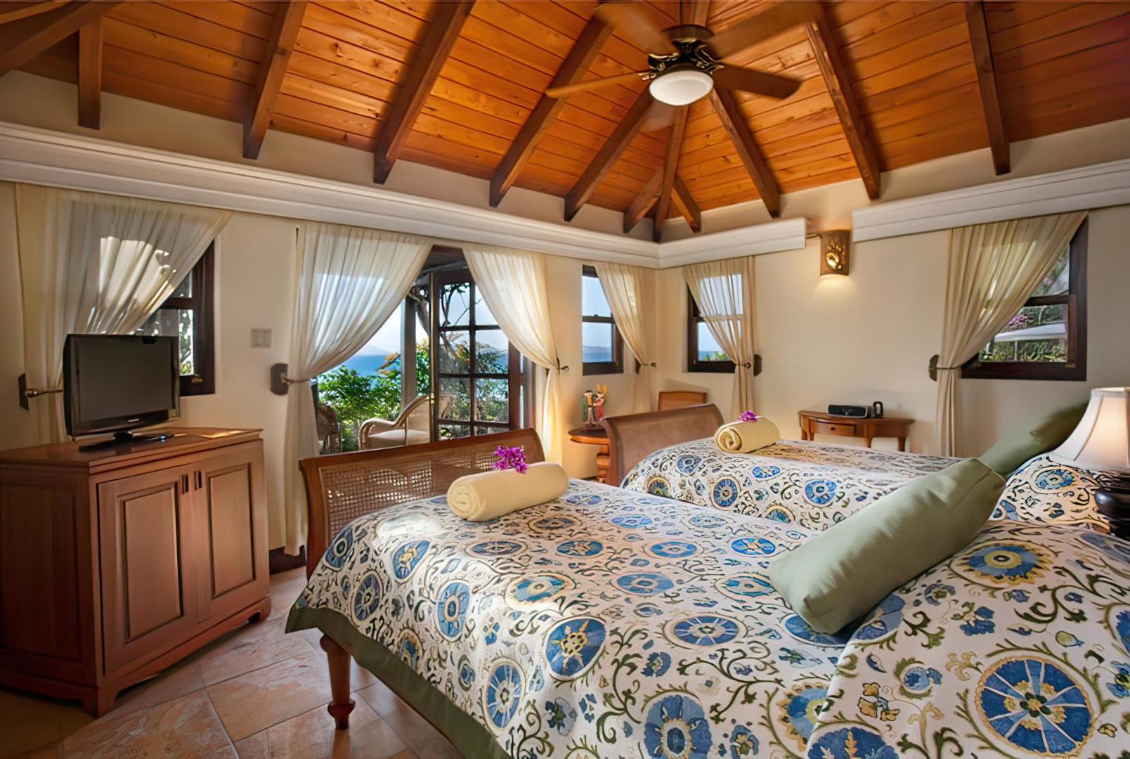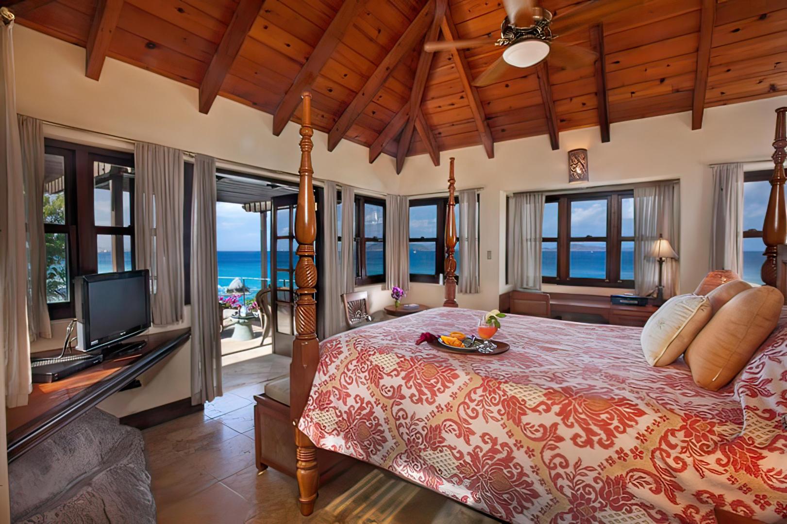 The master bedroom suite is the closest to the beach, with a private path to Valley Trunk Bay and to Little Trunk Bay. This suite has two private terraces, a stunning shower with ocean vistas, spacious bath with lavender marble vanity, desk alcove, and king British colonial poster bed.