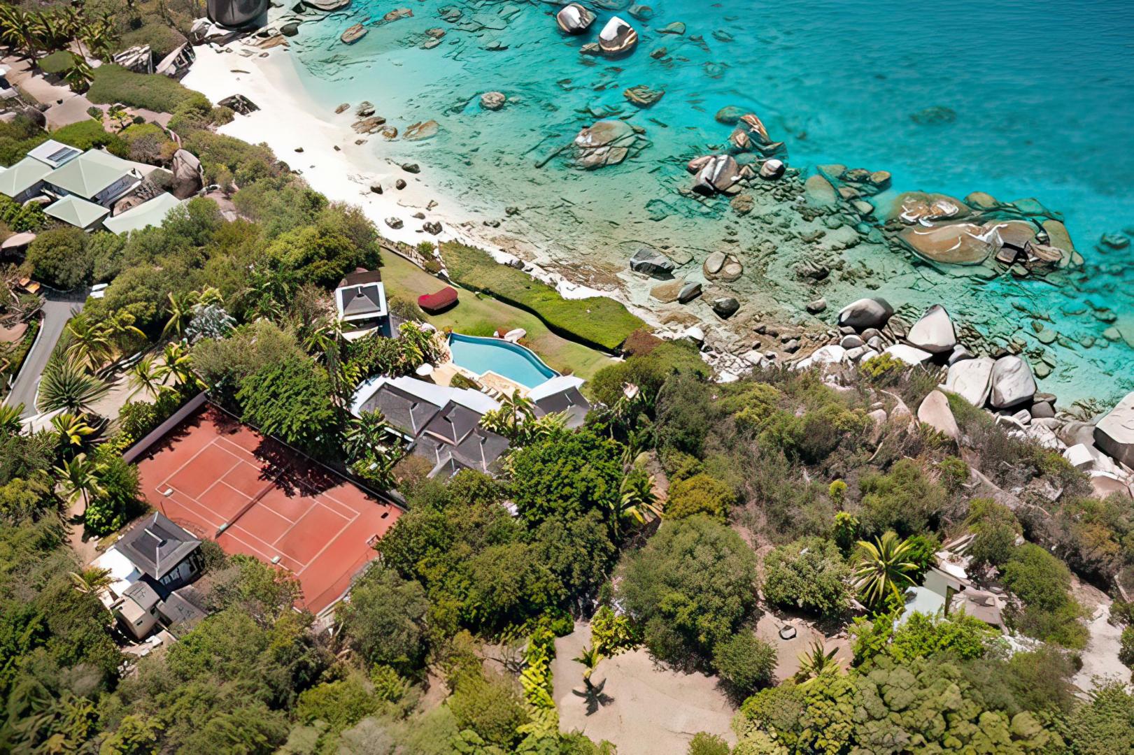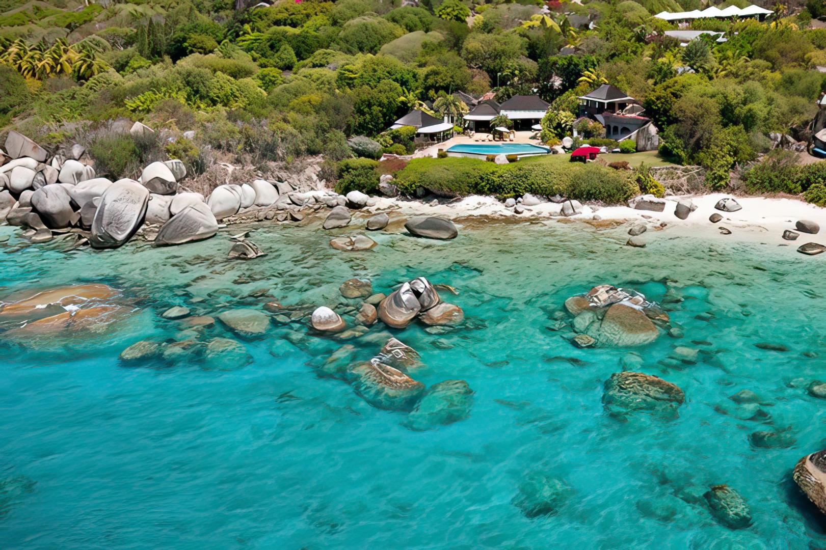 The villa borders two spectacular beaches, one a broad expanse of coral sand framed by palm trees and the surf, and the second a sheltered cove protected by Virgin Gorda's uniquely dramatic boulders. Sol y Sombra's guests enjoy the mystery and drama of Virgin Gorda's famous "Baths" on their very own secluded beaches. A living reef beckons just beyond the villa's lawn. Valley Trunk Bay has over 1,000 feet of unspoiled beach. The villa's Little Trunk Bay beach extends for approximately 350 feet, protected by its reef and giant boulders.