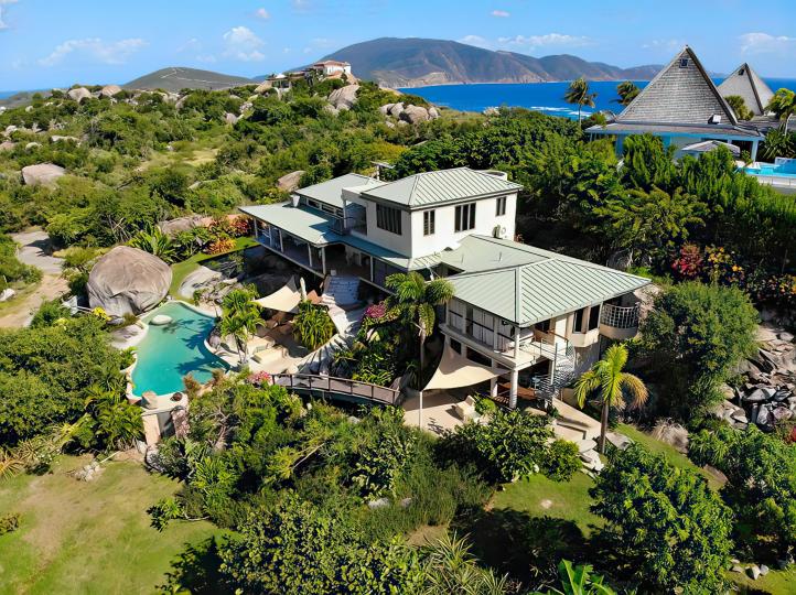 Sol y Sombra is located on Virgin Gorda in the British Virgin Islands. Virgin Gorda may be reached by air through San Juan or St. Thomas or by water taxi from Tortola. This ultra-deluxe estate is available for vacation rentals by the week or by the month.
