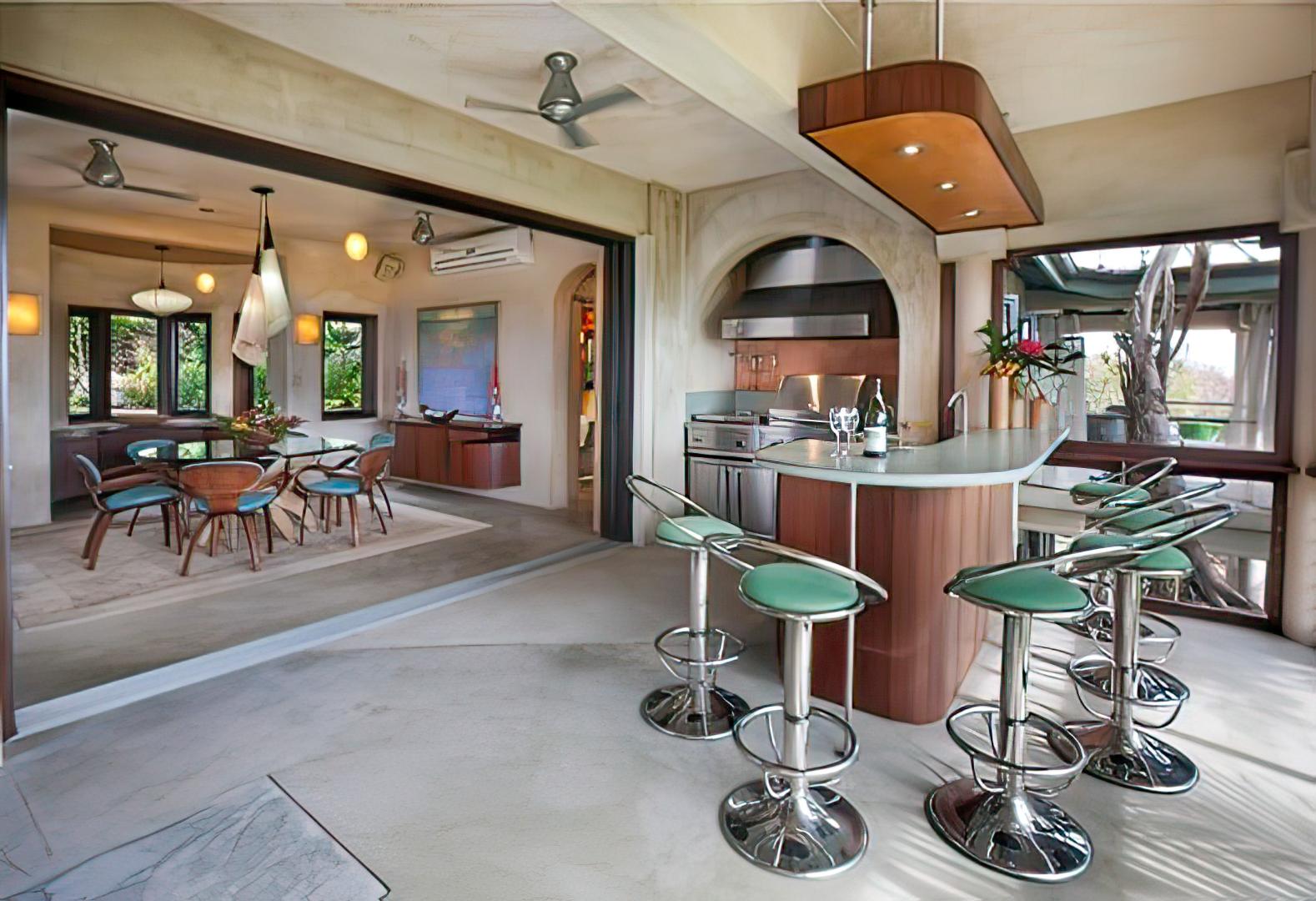 The villa has three levels. On the entry level are the common reception, dining and entertainment areas. There is a fully equipped Viking kitchen as well as a grill kitchen also on this level. The layout of the kitchens with a beautiful sea view in the background and a wrap-a-round circular counter make it perfect for shooting a cooking show, hosting catered affairs, families or small group retreats. The primary kitchen is sleek with its double refrigerated drawers, long wrap-around counters and stainless steel appliances. Bar seating for four encircle the primary kitchen which flows to the formal dining area with seating for eight. Flowing outwards is the attached open air grill kitchen with additional seating, perfect for casual dining and entertaining. There is a separate pantry with an extra-large refrigerator and ample storage.