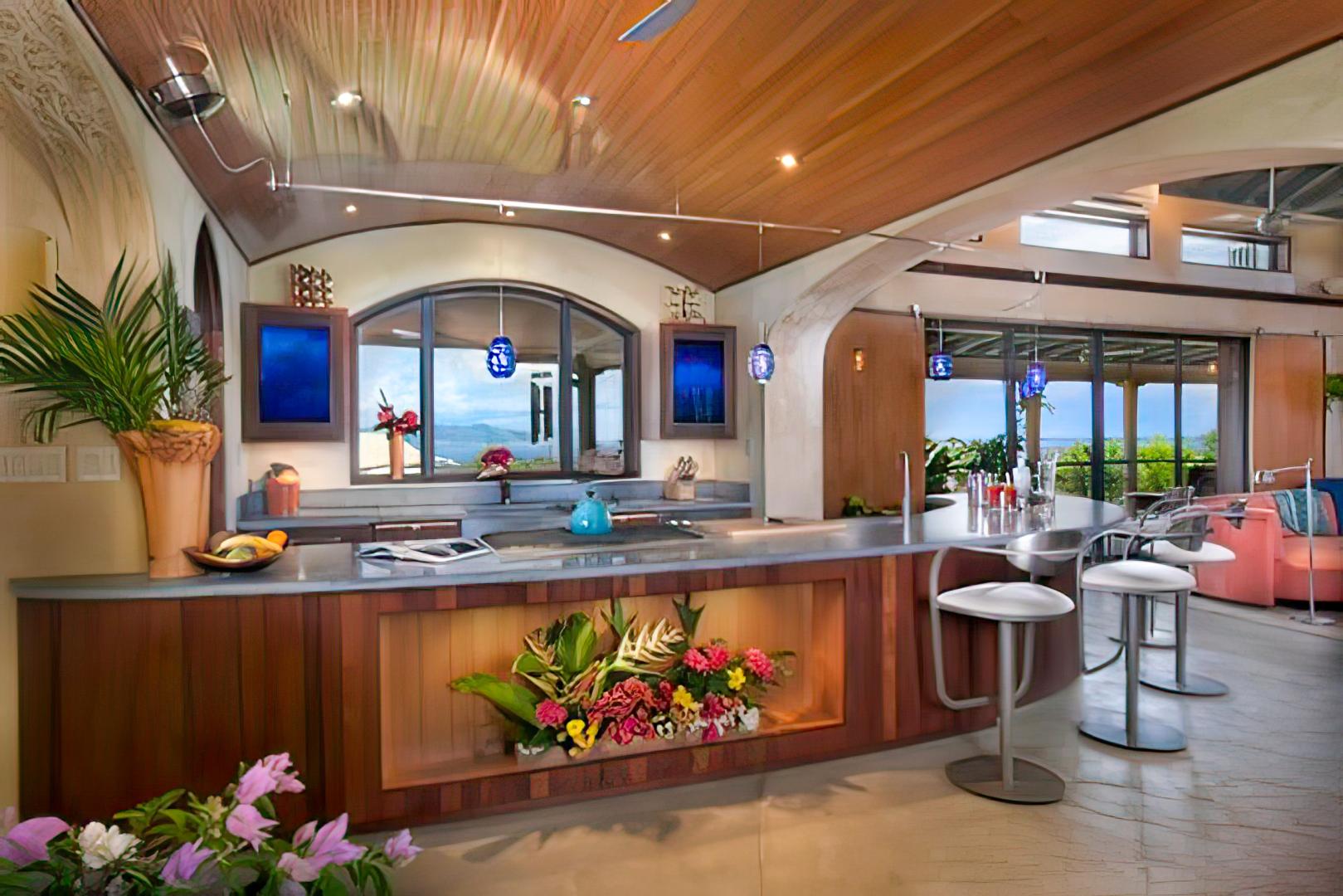 Also on the entry level is The Great Room which boasts over-sized cushy couches with backs that rotate so one can enjoy either the ocean view or the home entertainment centre. Open verandas surround this level with several opportunities for informal dining and gathering. In addition on the entry level is an ensuite bedroom with open-air shower. A private covered patio furnished with over-sized lounging chairs allows for perfectly quiet relaxation. There is also a guest bathroom on this level.