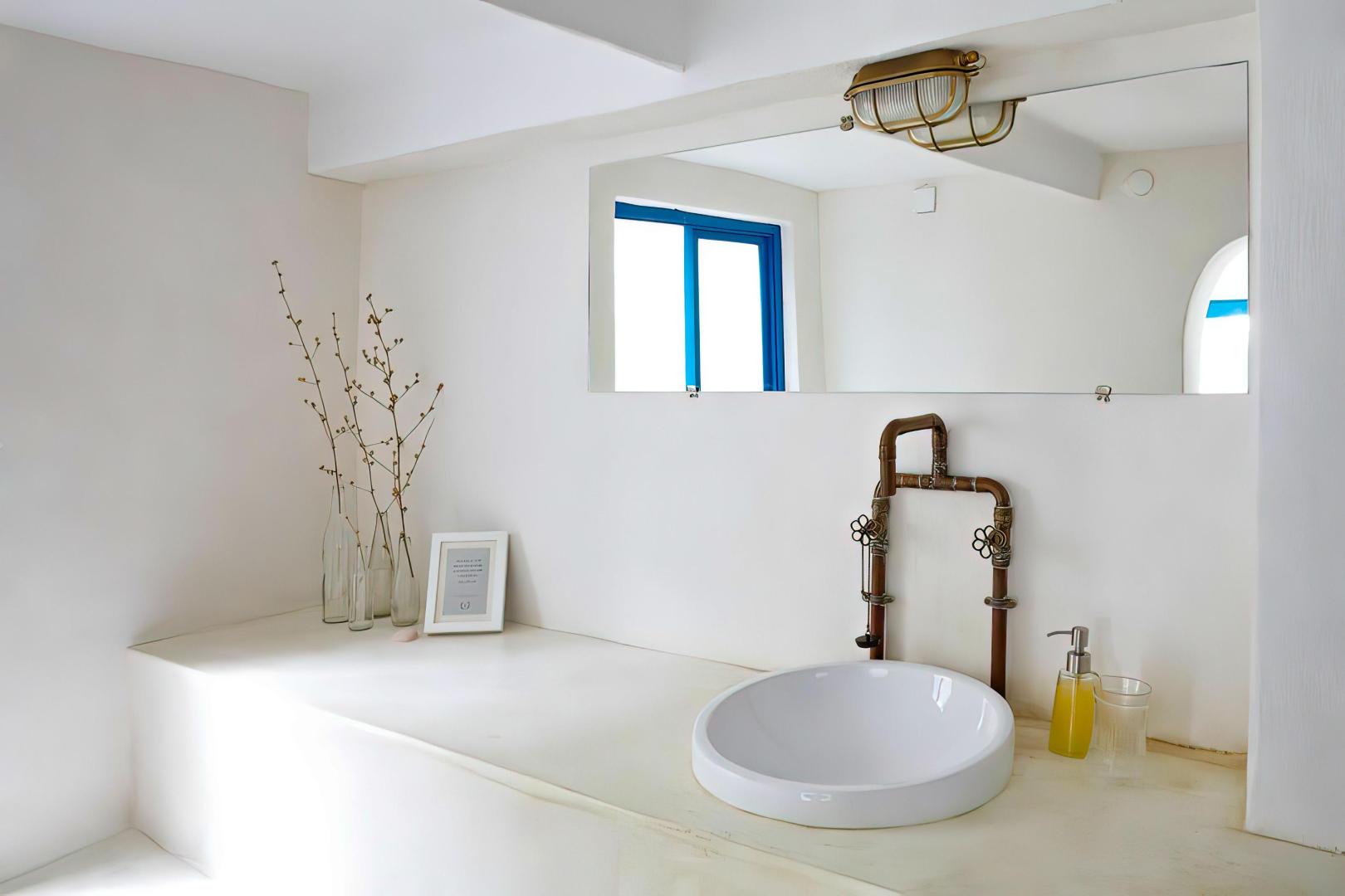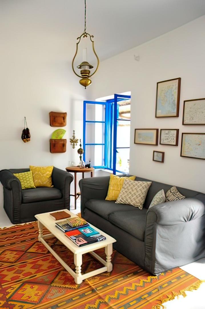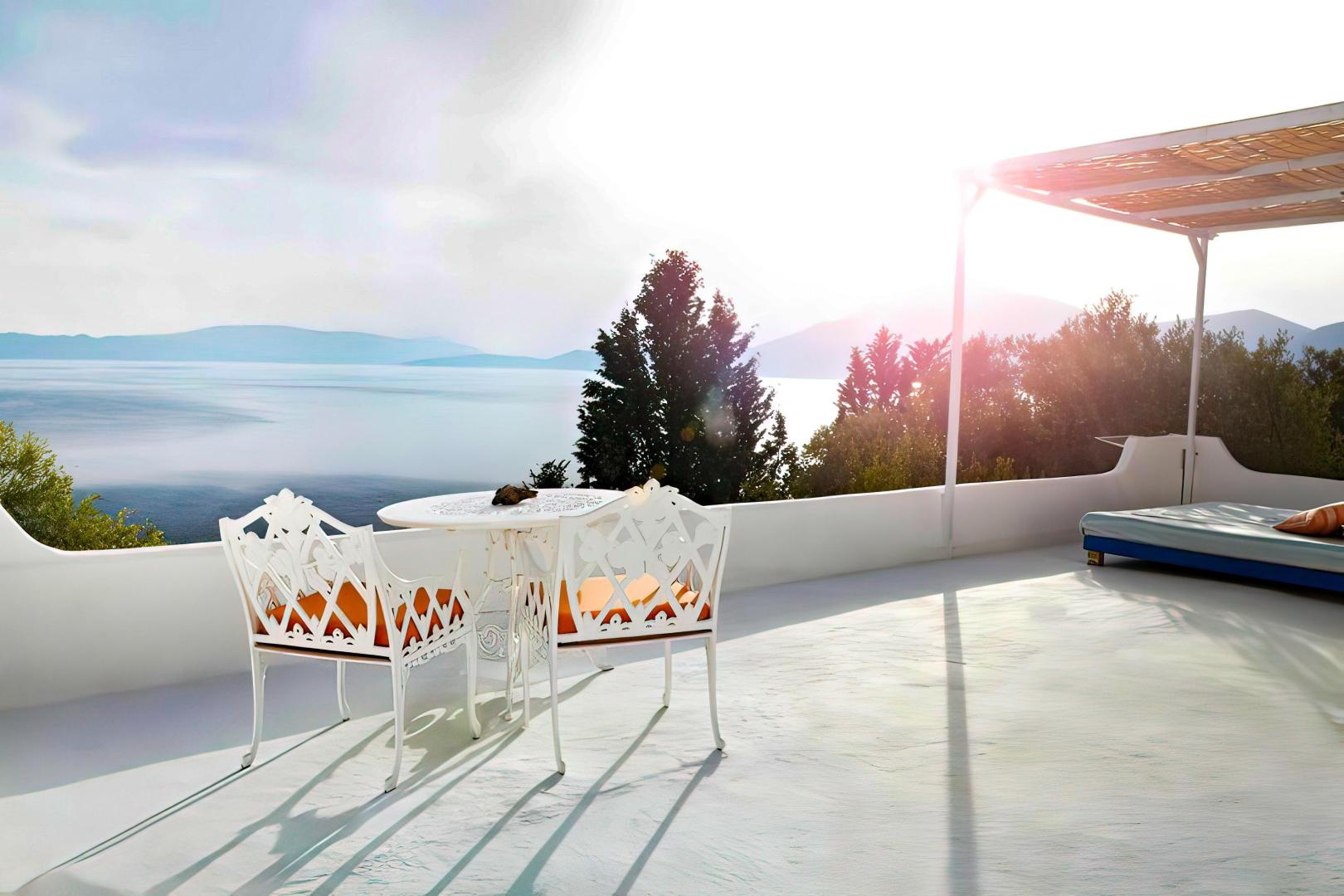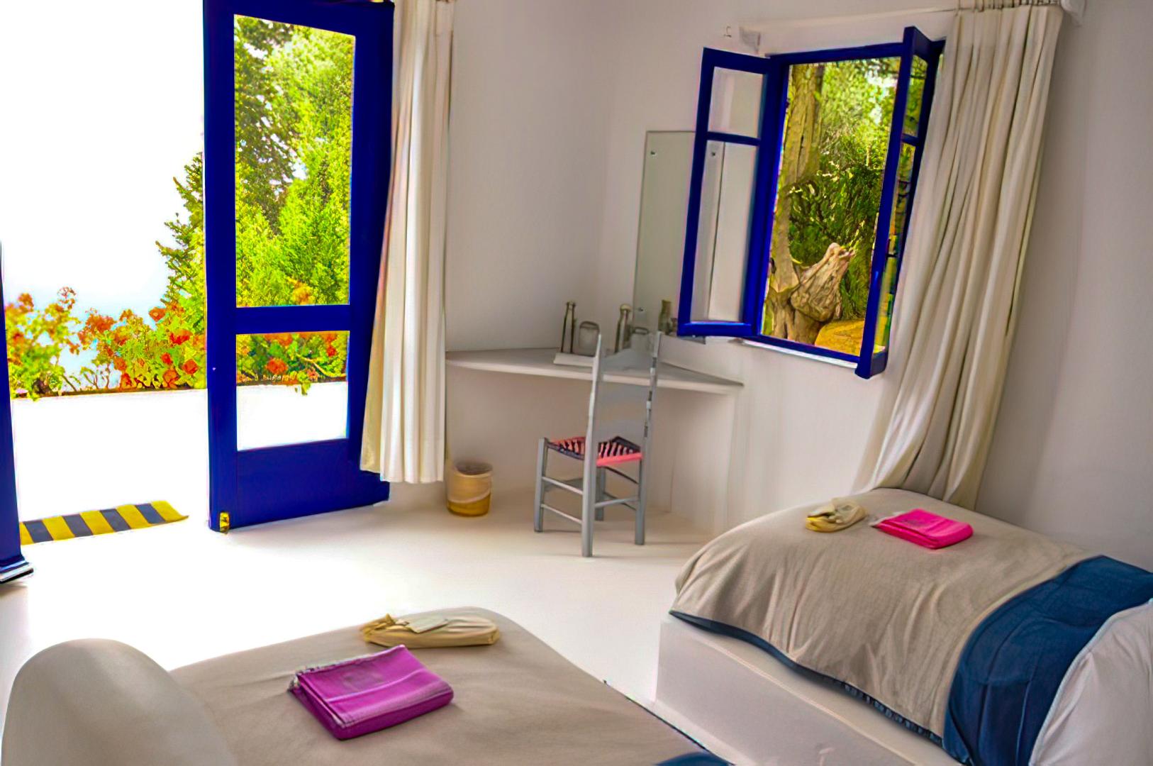 The rooms are a mix of traditional features and contemporary design and are individual in shape, size, style. Tastefully furnished throughout with 100% cotton sheets, towels, beach wraps, hypoallergenic pillows and mosquito netting. We also provide 100% natural, locally make toiletries and insect repellent. All the rooms have built in cupboards and spectacular views of either the island or the crystal blue Aegean sea. All that you could need to be comfortable, unpack and make yourself at home.