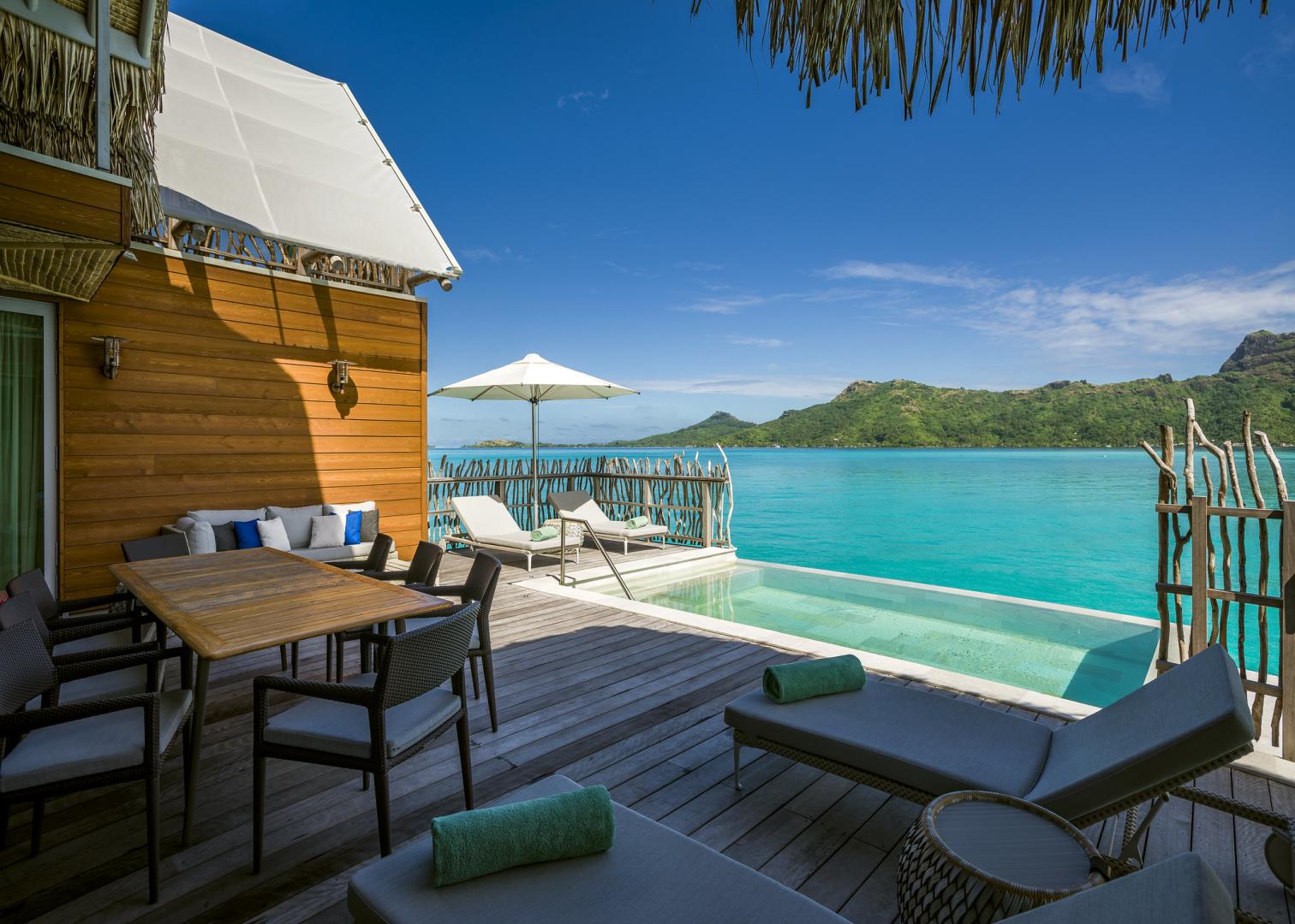 - Overwater Villas: Beach, lagoon, island, and Otemanu views, each with private terraces and direct lagoon access.