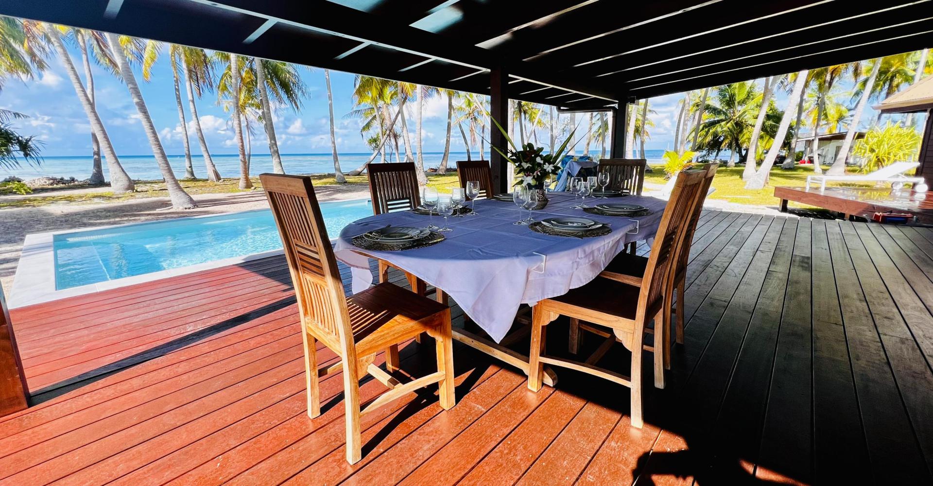 Dining: Gourmet meals prepared by two chefs, featuring local Polynesian specialties. Wine cellar available with the option for additional vintages from Tahiti.