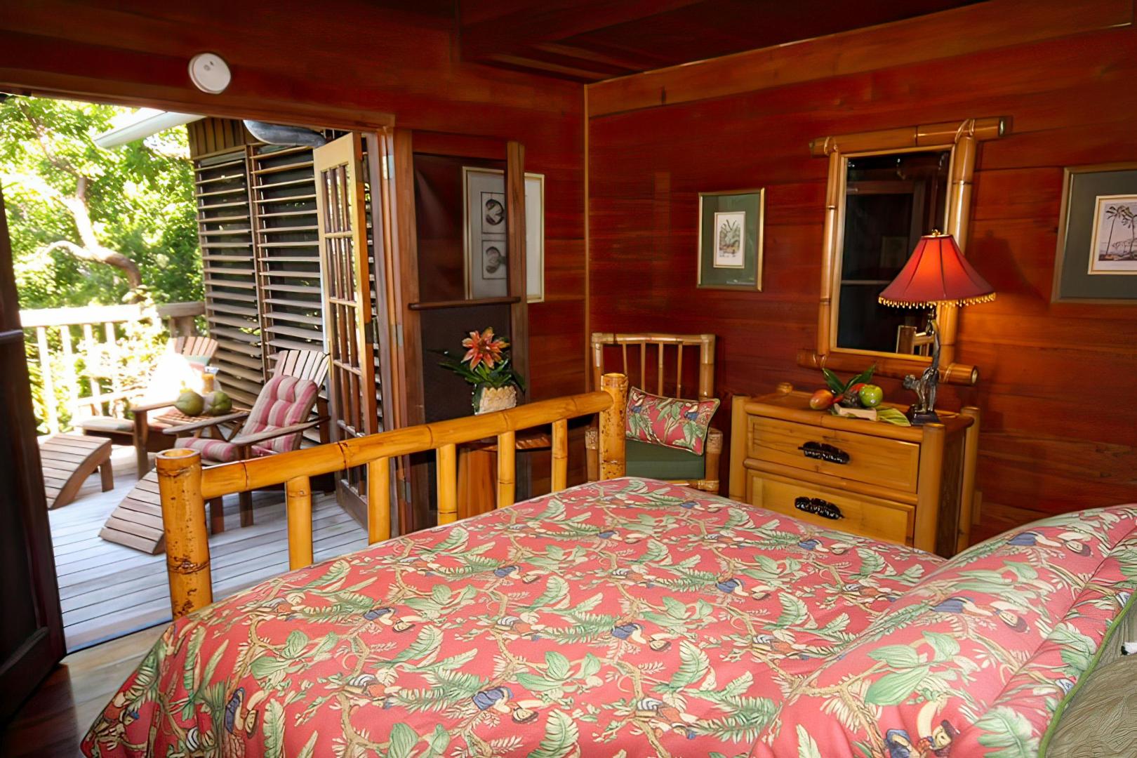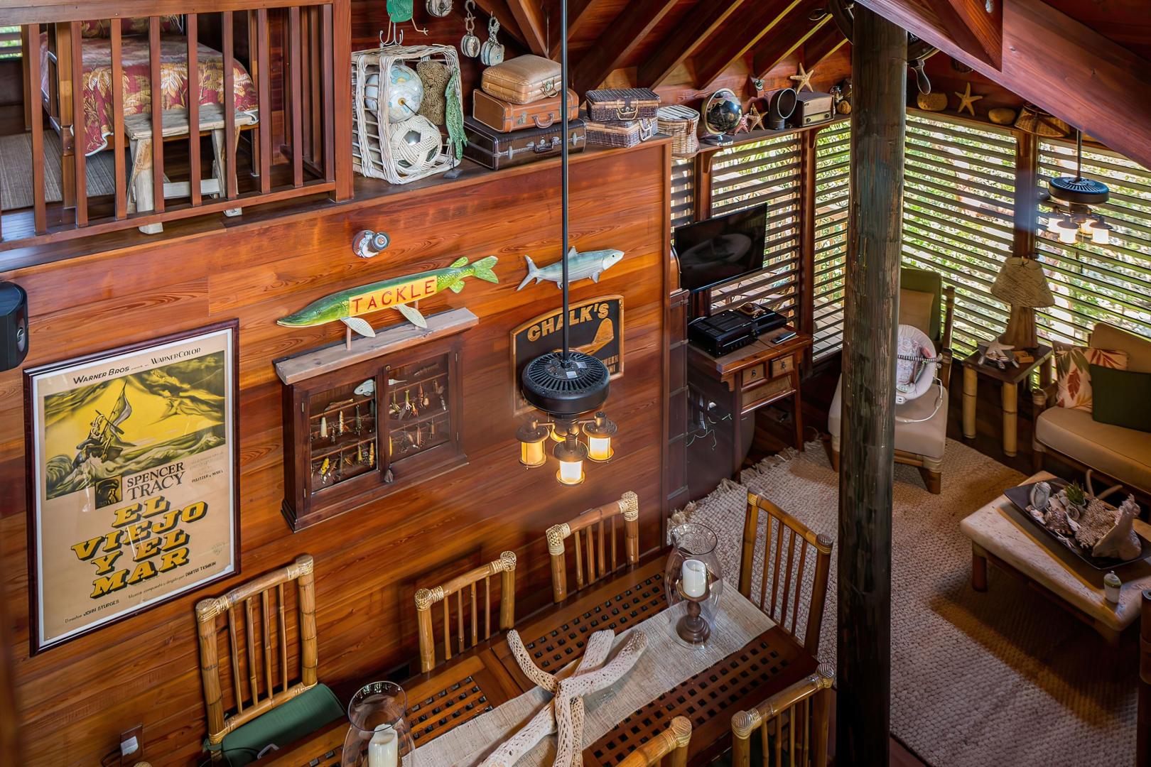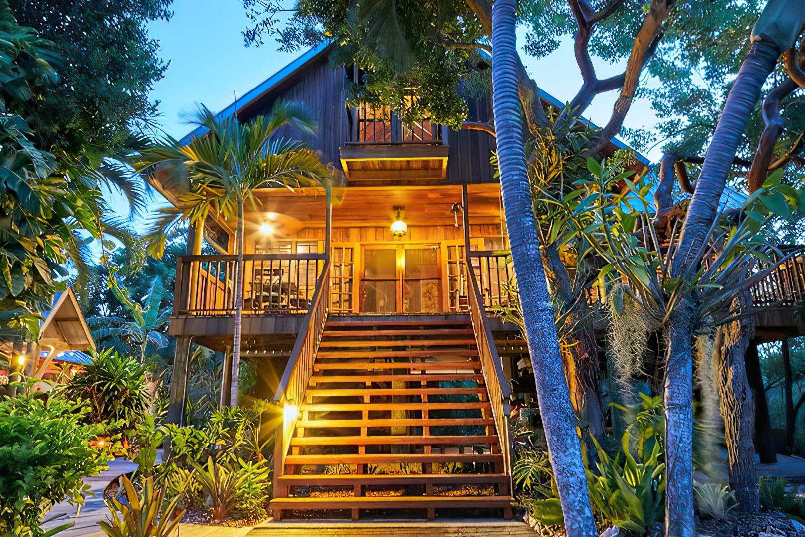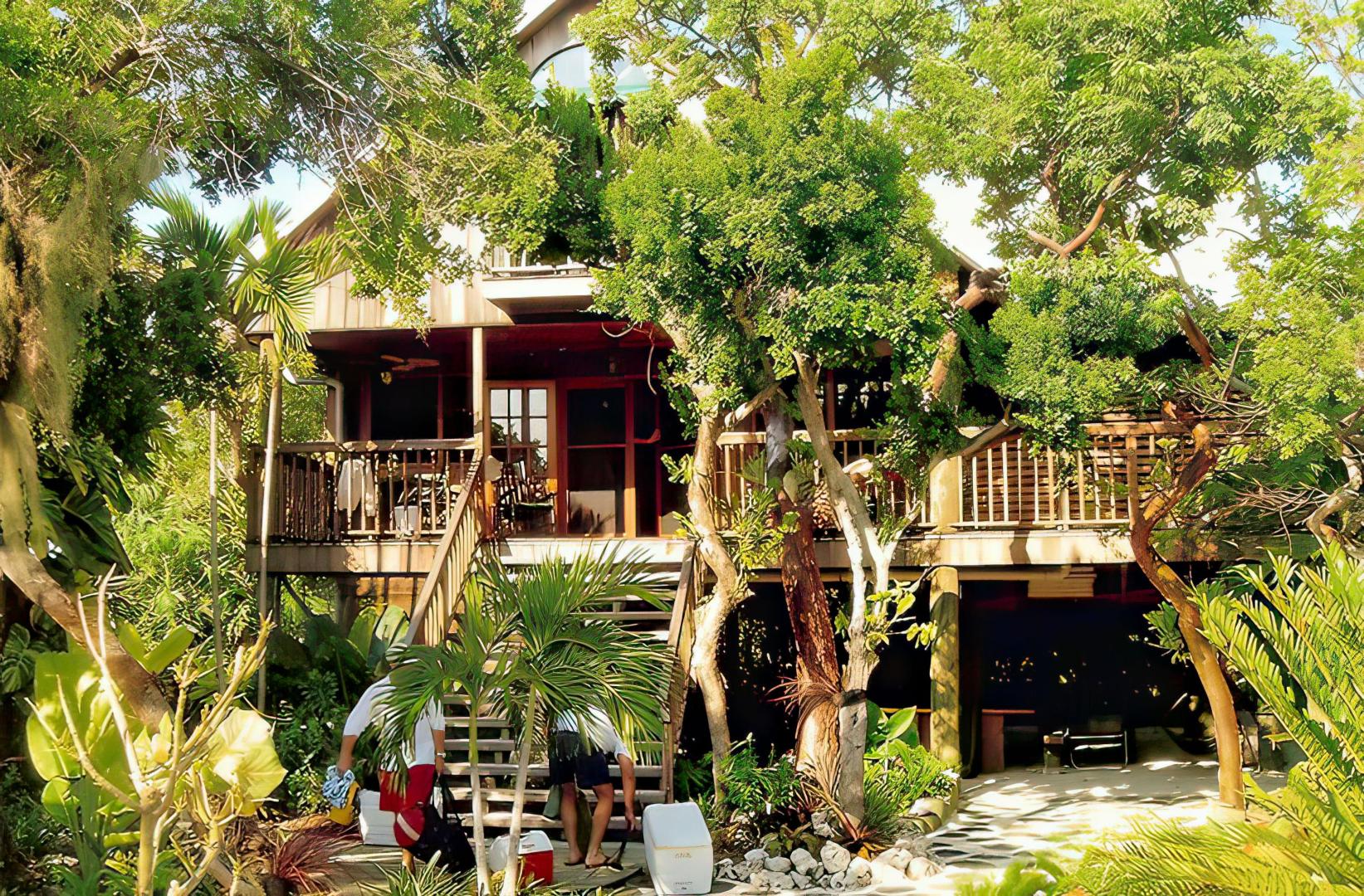 Seabird Key is a ten acre island featuring a large cottage home with gracious porches and multi level decks. Swiss Family Robinson meets Ernest Hemingway, charmed by an old Florida style at its finest. The tropical island decor is enhanced with nautical antiques. The home comfortably sleeps eight: two bedrooms on the main level (one queen and one full) each with private baths, and a shared "Adam and Eve" unique, yet private outdoor shower. The upstairs open loft sleeps four, and a wooden catwalk connecting the two ends of the loft complements the tree house environment.