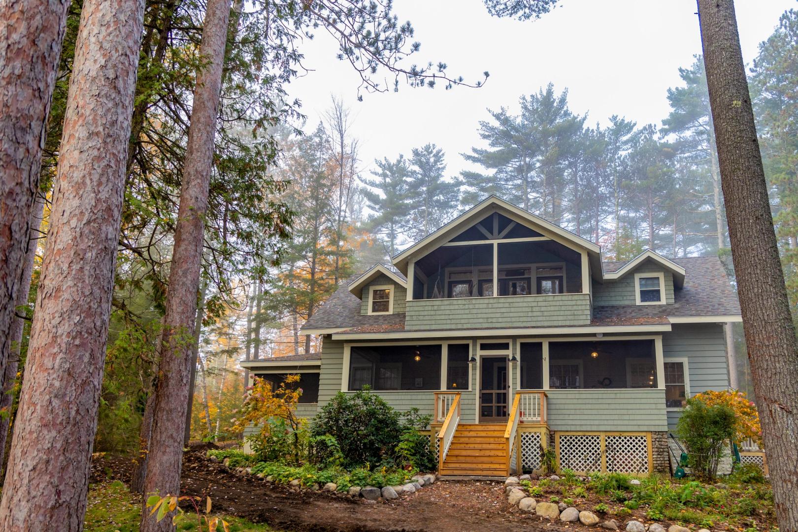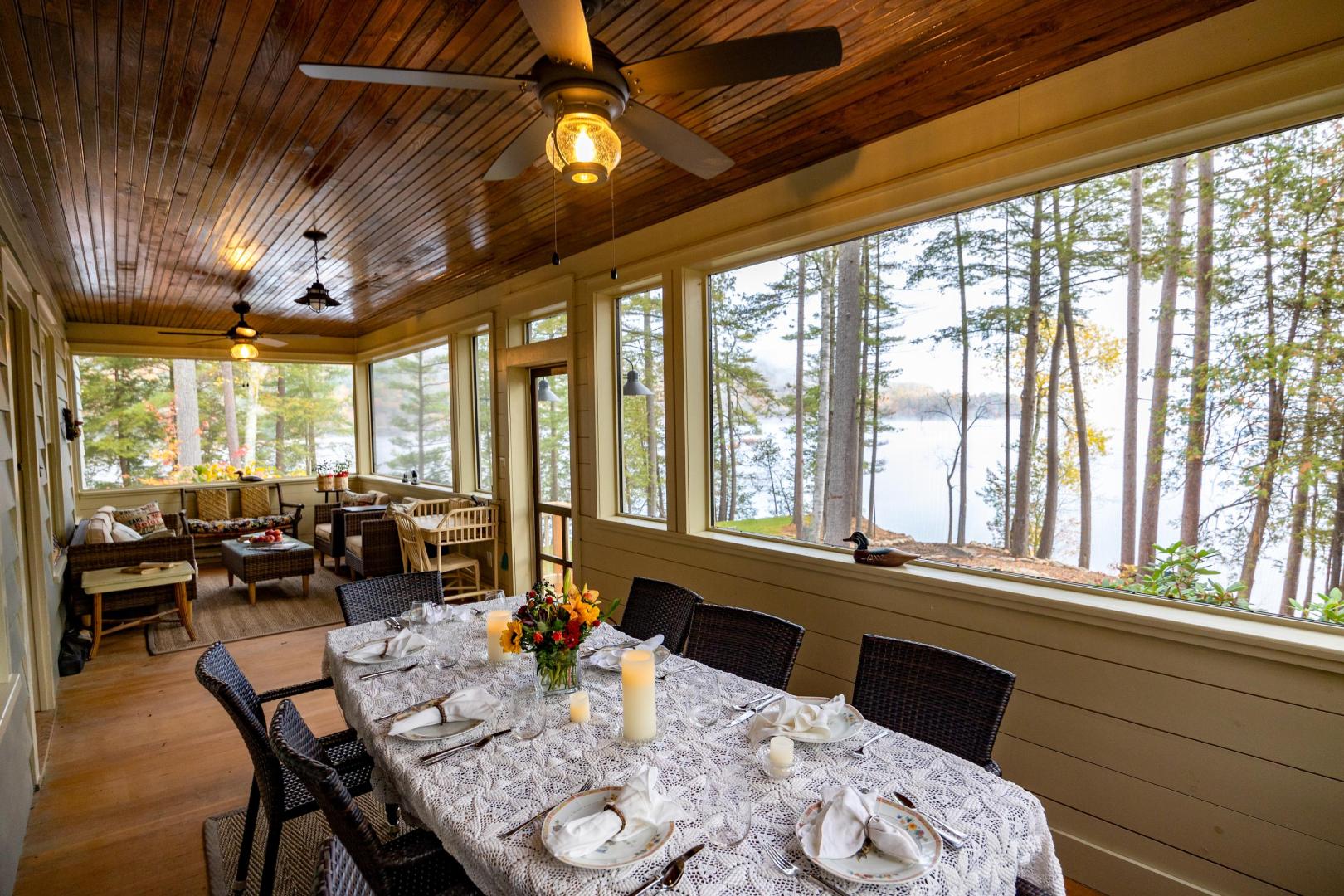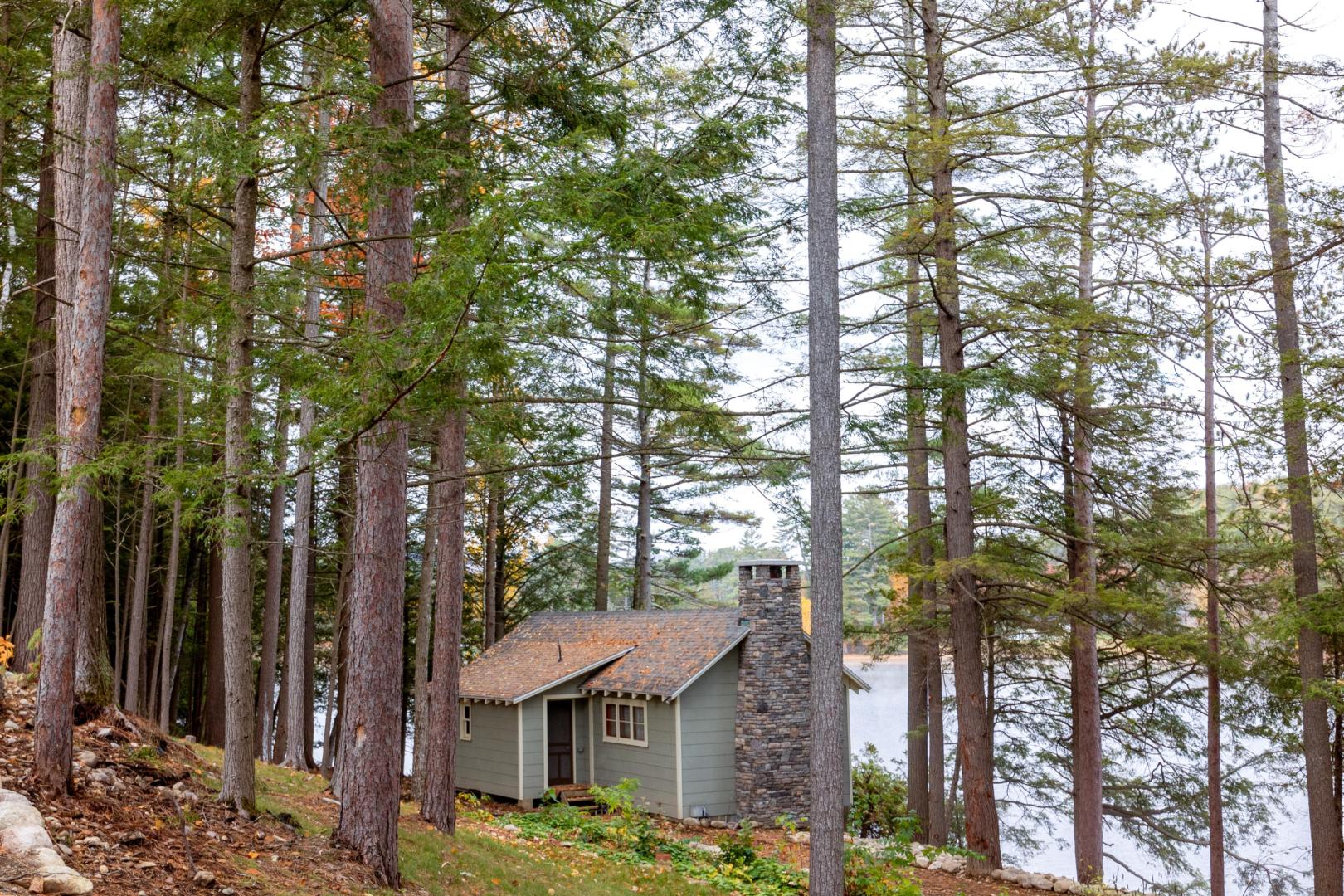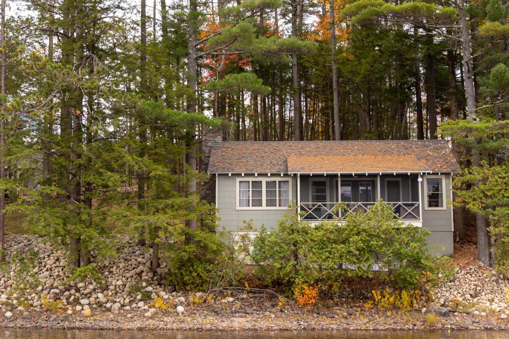 Ideal for a family getaway or group retreat, this six-acre private island rental property features a trio of accommodation options. Nestled within Brill Island’s pine, birch and maple trees is a six-bedroom, 4.5-bathroom main house with lakefront porch, cozy living room with fireplace, and open-plan dining room with chef’s kitchen. A charming two-bedroom, one-bathroom cottage has its own kitchen and fireplace and screened-in porch overhanging the calm waters. The main house and cottage have air conditioning and auxiliary heat, and there is wifi throughout the property. Two glamping tents with king-size beds share bath facilities in the Adirondack Barn where families can gather for evening entertainment, dinner seating, games and more —expanding the experience of immersing in nature without sacrificing comfort.