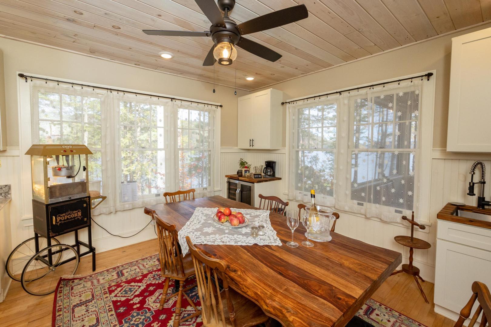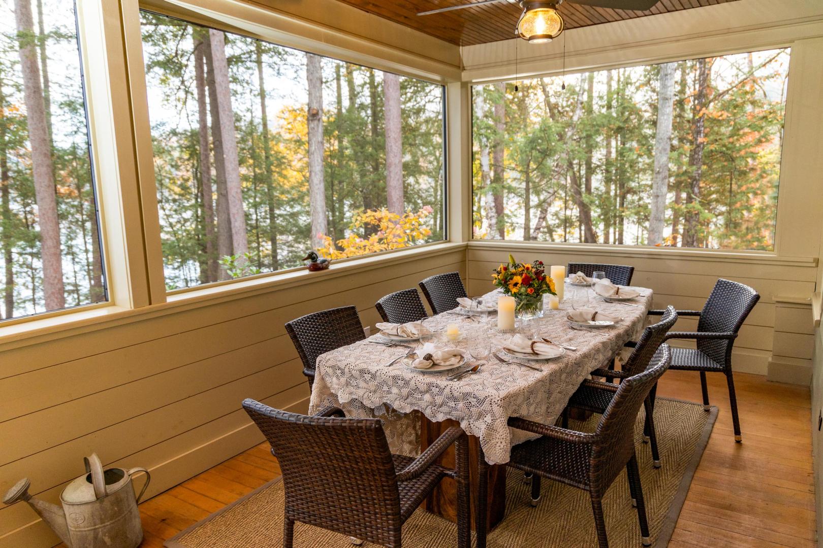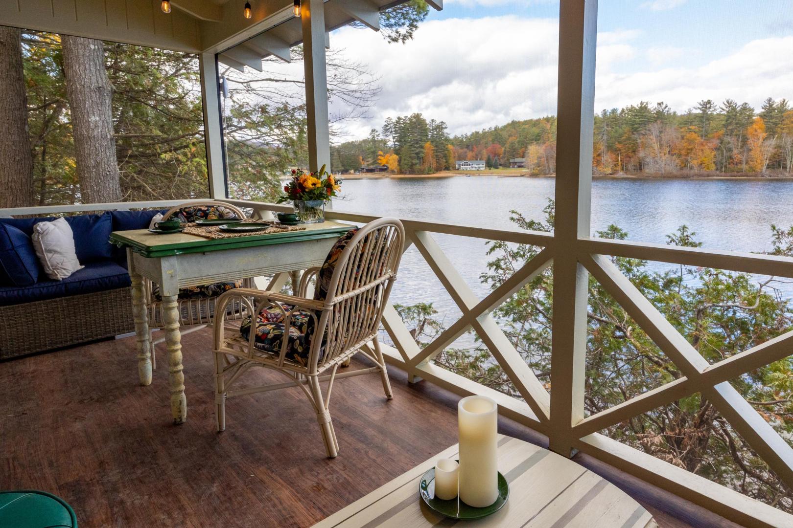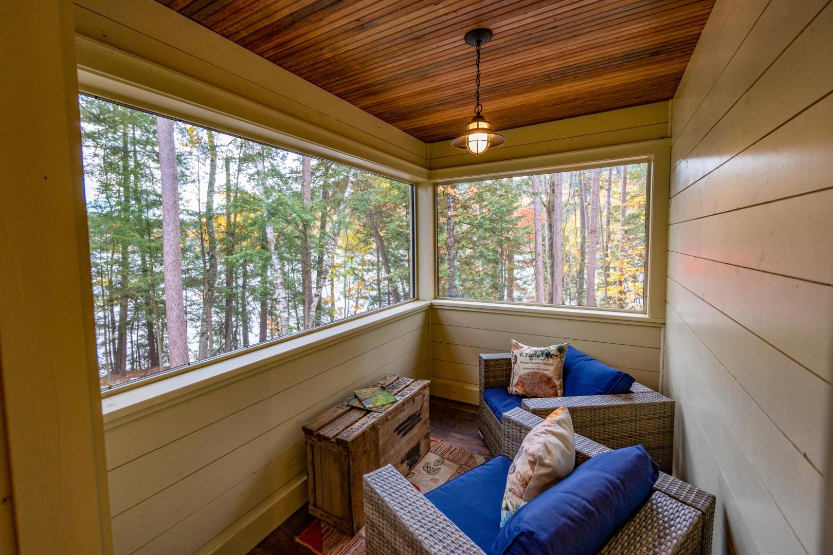 Ideal for a family getaway or group retreat, this six-acre private island rental property features a trio of accommodation options. Nestled within Brill Island’s pine, birch and maple trees is a six-bedroom, 4.5-bathroom main house with lakefront porch, cozy living room with fireplace, and open-plan dining room with chef’s kitchen. A charming two-bedroom, one-bathroom cottage has its own kitchen and fireplace and screened-in porch overhanging the calm waters. The main house and cottage have air conditioning and auxiliary heat, and there is wifi throughout the property. Two glamping tents with king-size beds share bath facilities in the Adirondack Barn where families can gather for evening entertainment, dinner seating, games and more —expanding the experience of immersing in nature without sacrificing comfort.