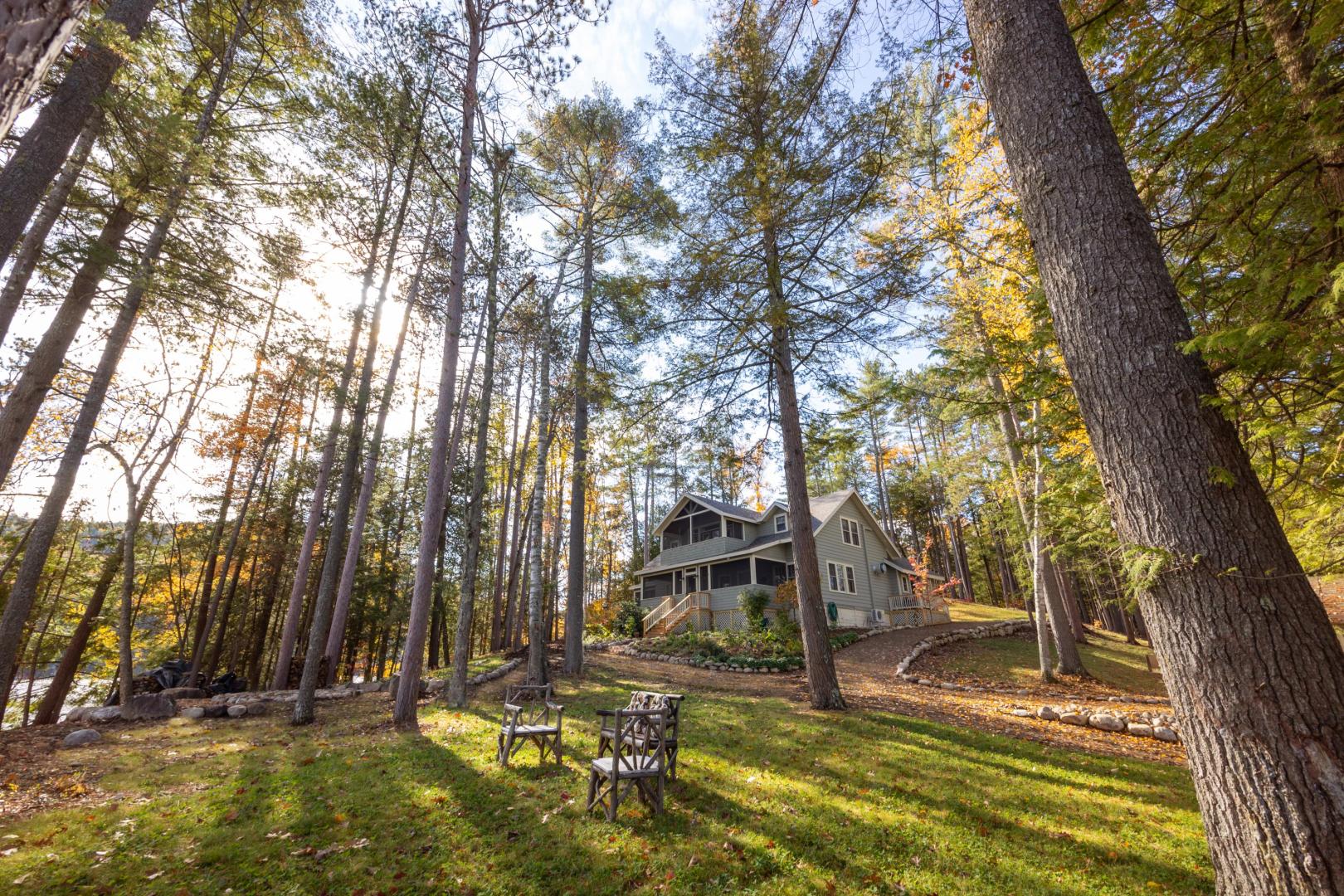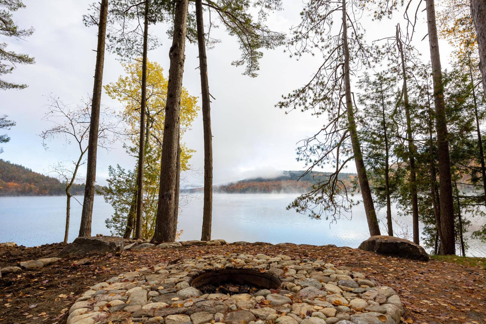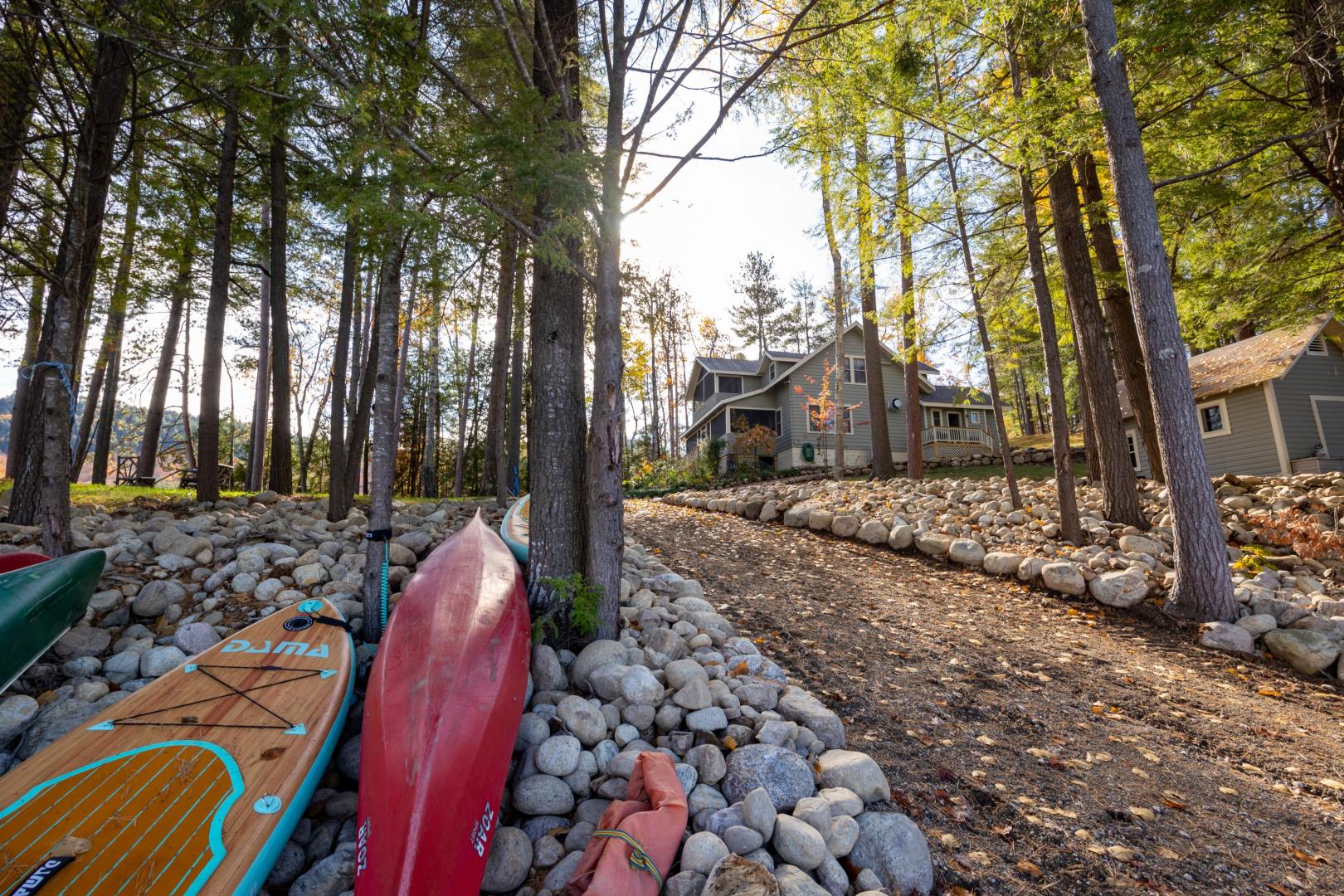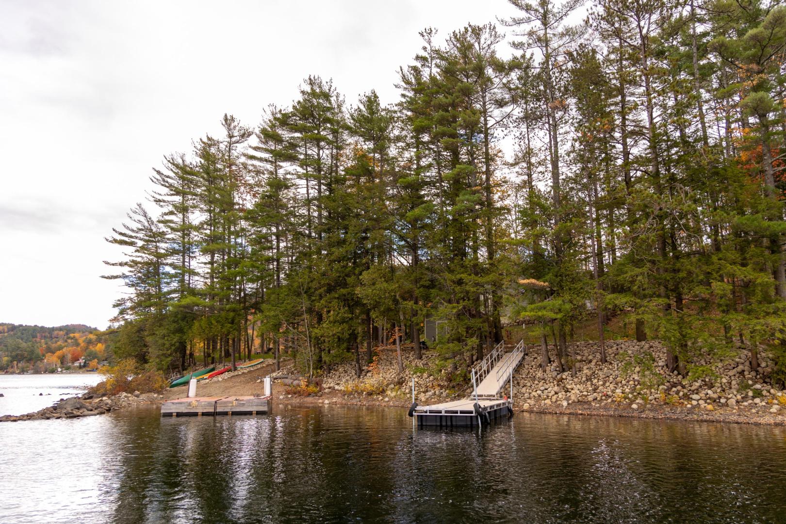 Beaches ring the island, providing easy entry points for swimmers, fishing for trout and salmon, or launching the kayaks and stand-up paddleboards that are included. A lakeside firepit looks to the north, walking trails weave through the island’s interior, and lawn games like bocci and cornhole are available. An on-site manager can assist with boat transport and tours, ensuring there is never a shortage of activities. It’s only a five-minute boat ride to the mainland car park in Pottersville, N.Y., the jumping off point to explore scenic Schroon Lake town 10 miles north, with its swimming beach, hiking and biking trails, and delicious dining options. Lake Placid, Saratoga, and the Albany airport are no more than 75 minutes away. Conveniently located midway between New York City and Montreal, Brill Island opens the Adirondacks while giving visitors the privacy to bask in its beauty.