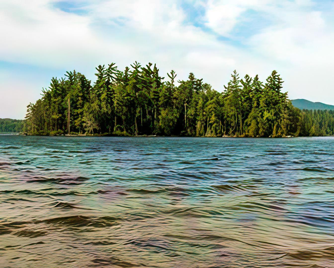 This wooded island is 4.3 acres with veneer white and red pine trees.